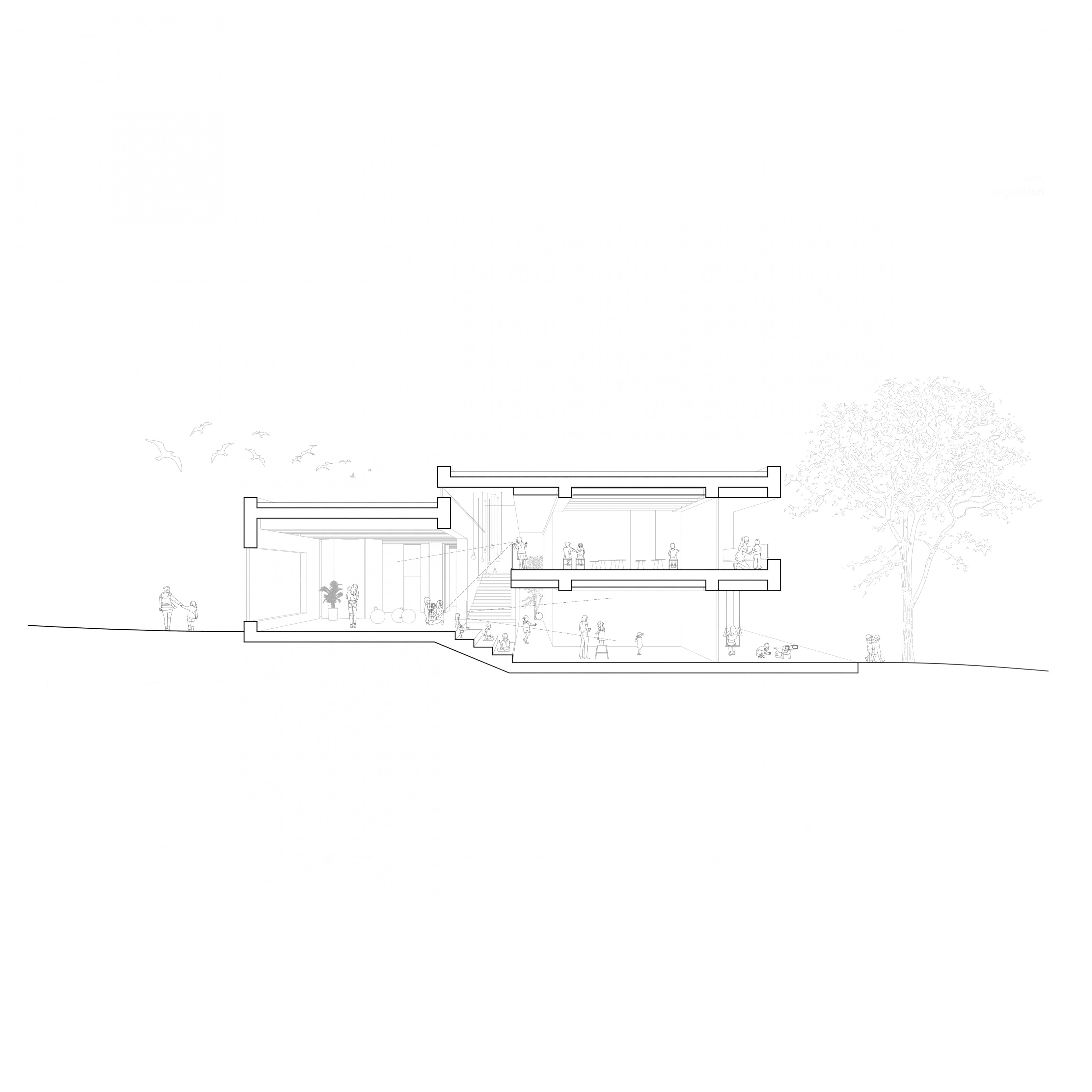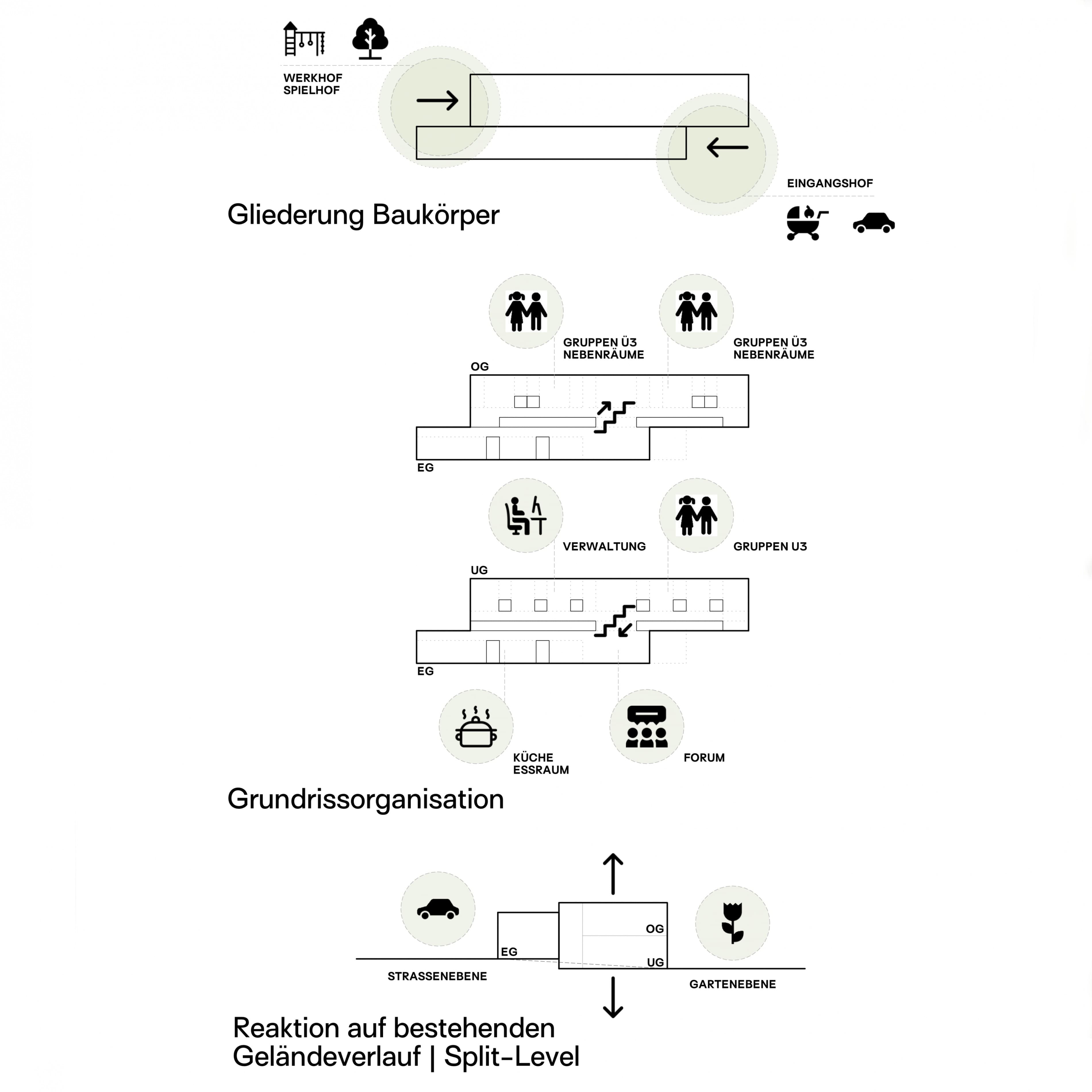 Der Entwurf basiert auf einem Niveauversatz des Eingangsgeschosses, welcher dem natürlichen Geländeverlauf folgt. Aus diesem Ansatz resultiert ein zweigeschossiger Baukörper zum Garten hin und ein eingeschossiger, bezogen auf die Gebäudehöhe, sehr massstäblich erscheinender Baukörper zur Elisabethenstrasse. Durch die einfühlsame Überleitung vom Eingangsfoyer zu den Freianlagen wird eine hohe innenräumliche Qualität und eine willkommene Zonierung im Gebäude erzeugt. Sehr ausgewogen ist auch die Anordnung und Verteilung der einzelnen Gruppen im Gebäude. Durch den gemeinsamen Luftraum und die Anordnung, Ausformung und Belichtung der Erschliessungszonen mit ihren unterschiedlichen Blickbeziehungen wird eine hohe räumliche Qualität erzeugt.