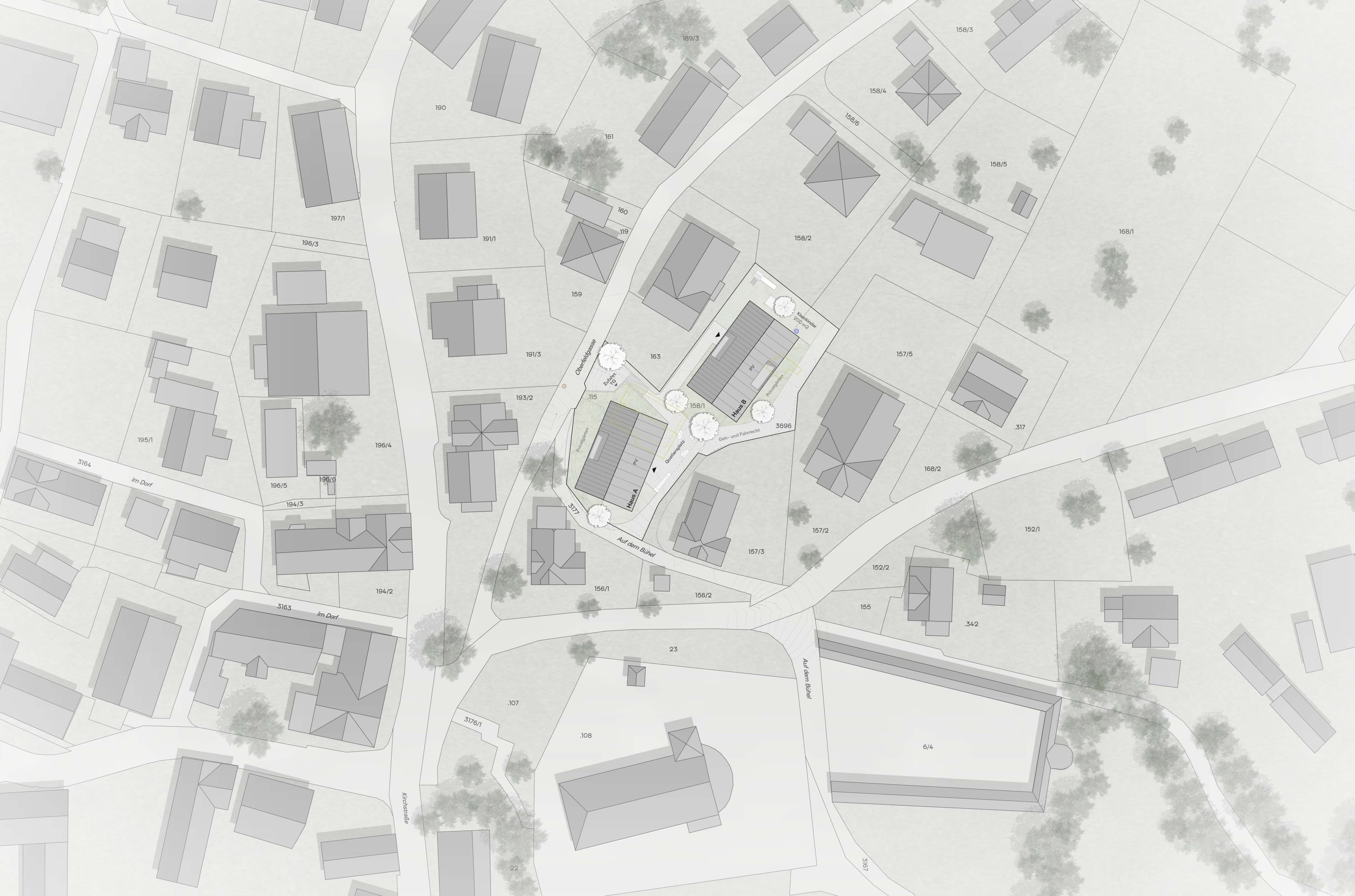 "Zwei ähnliche Bauvolumen fügen sich gut in die bestehende Siedlung ein. Während das nördliche der beiden Gebäude sich maximal in die Parzelle einpasst, wird das südliche leicht ausgedreht unter Beibehaltung der bestehenden Stützmauer in die angetroffene Topografie gesetzt.