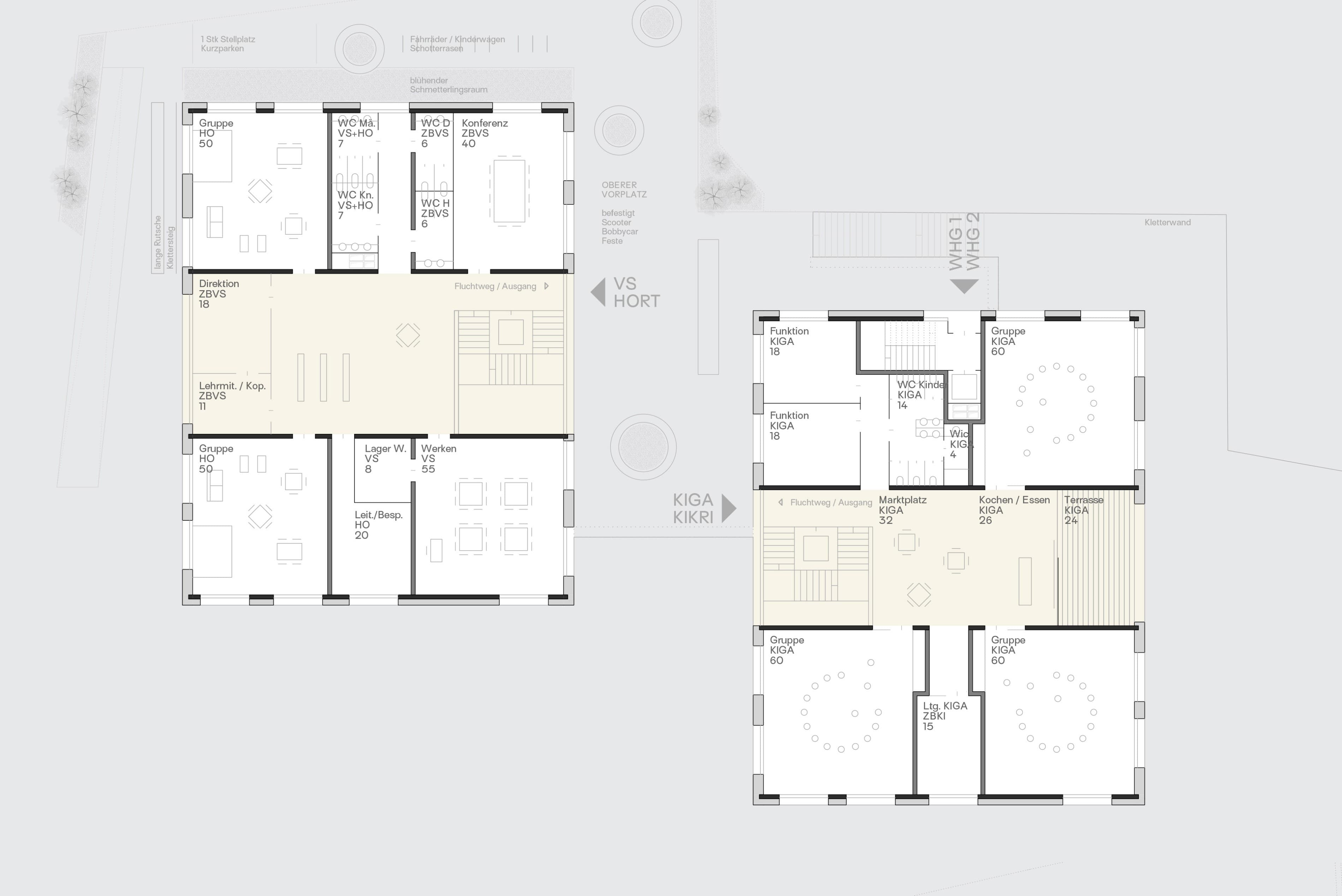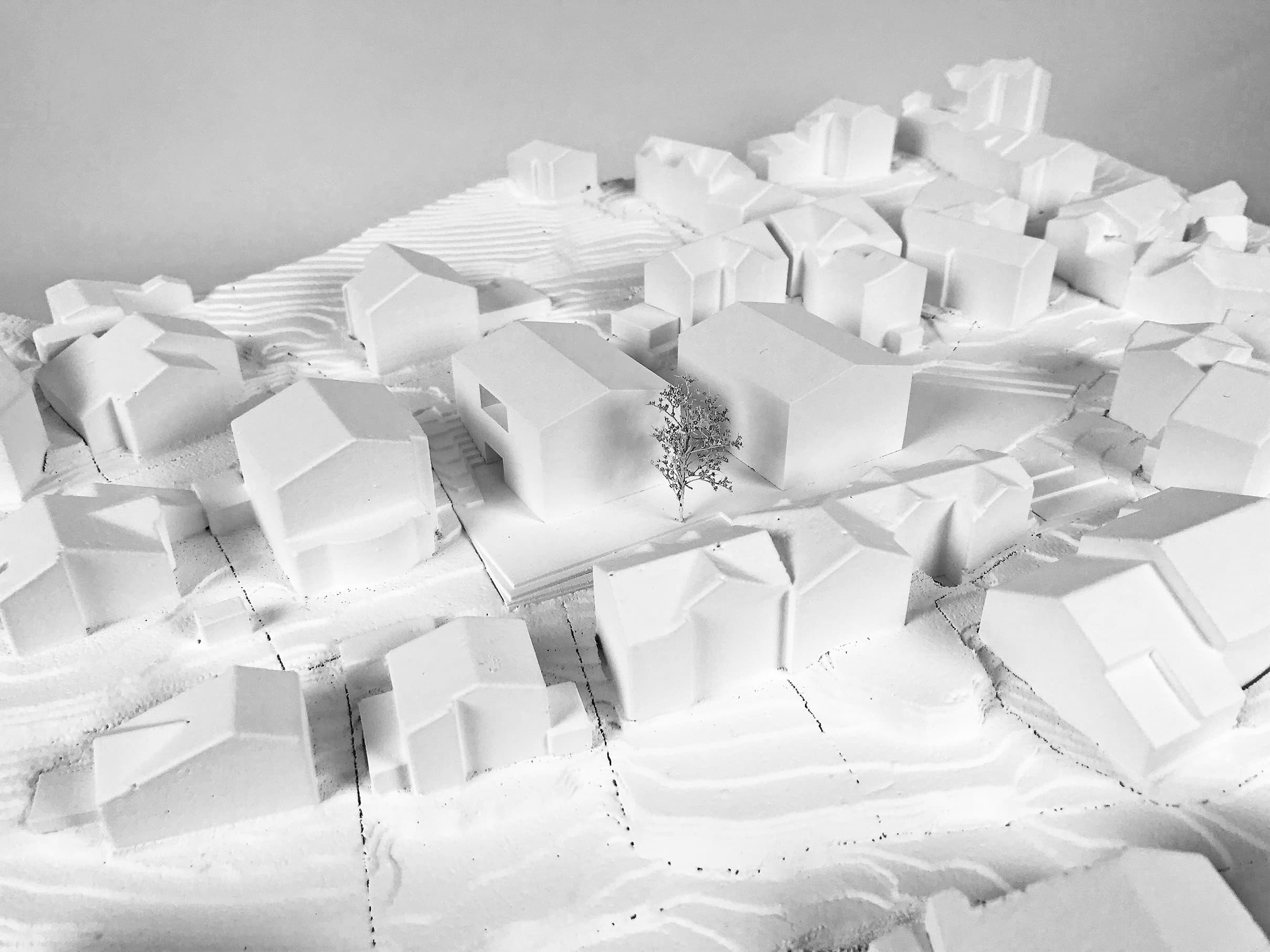 Die orthogonale Anordnung der beiden Baukörper, deren reduzierte Ausformulierung und die sich daraus ergebenden Außenflächen mit einem großen südwestgerichteten Hof, sowie die klar strukturierte Organisation der Funktionen im Innenraum bilden aus Sicht der Jury ein schlüssiges Konzept. Die Niveauentwicklung und die Einbindung der Baukörper und Außenflächen in die topografische Situation vor Ort wird positiv gewertet.