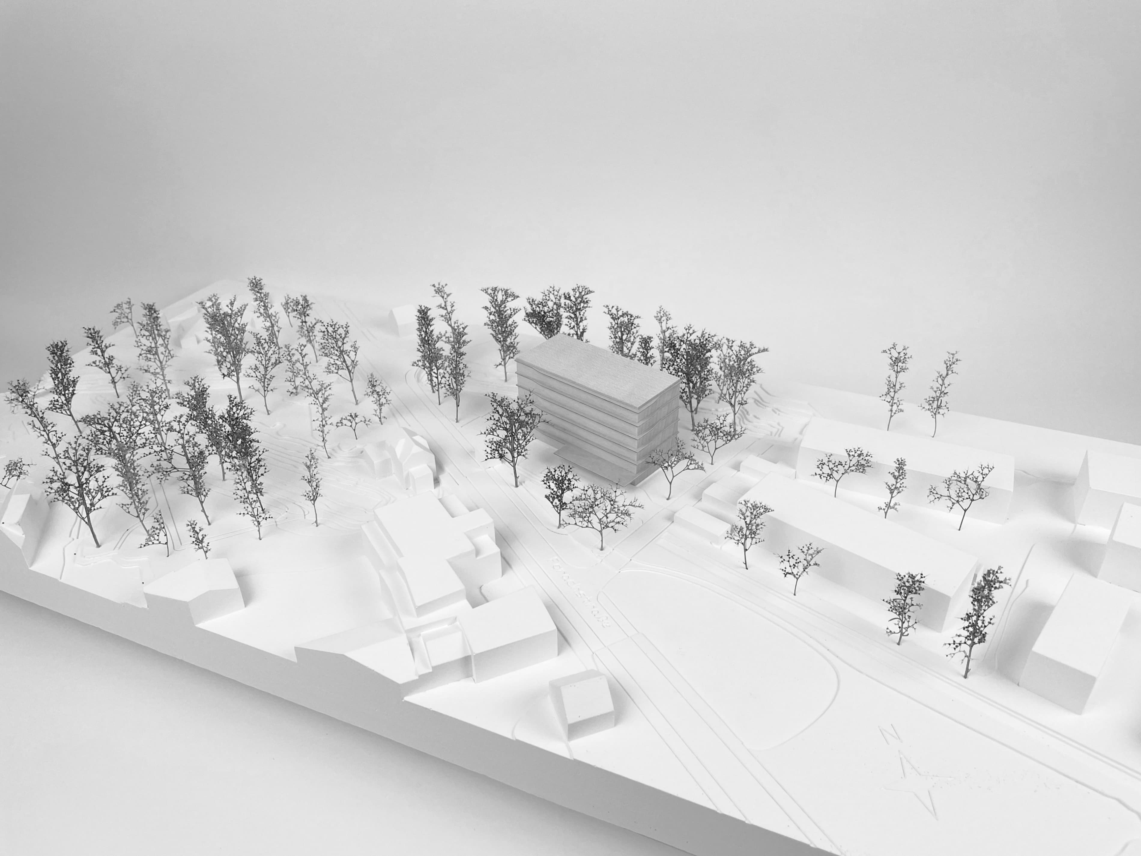 "Der Wettbewerbsbeitrag setzt die ostseitig zeilenförmige Bebauungsstruktur auf dem Wettbewerbsgrundstück mit einem markanten 6-7 geschossigen Längsbaukörper fort, der in reiner Holzkonstruktion angedacht ist. Die Zugangssituation erfolgt über einen großzügig gestalteten Freiraum zur Forachstraße, mit gelungenem Einbezug des Industriekanales Müllerbach, als wichtiges Landschaftselement. Über eine mögliche Begegnungszone in einem Teilabschnitt der Forachstraße, entsteht eine starke Verwebung mit dem westseitigem Forachwäldchen. Grundrisslich und funktional überzeugt das Projekt insbesondere im Erdgeschoss mit klar zonierten Abläufen und hohen Innenraumqualitäten, die sich über Sitzstufen und großzügig dimensionierter Treppenanlage im 1. Obergeschoss, mit den Gemeinschaftsräumen und der Verwaltung, fortsetzen. Die weiteren Obergeschosse nehmen die Kernlernbereiche und Fachraumbereiche gekonnt auf. Das geforderte pädagogische Konzept wird vollumfänglich erfüllt und auch seitens der Pädagoginnen wird die innere Organisation und der Entwurfsansatz als spannender, souveräner Beitrag beurteilt. Die klar getrennte Zugänglichkeit zum Sportbereich ermöglicht eine flexible außerschulische Nutzung."