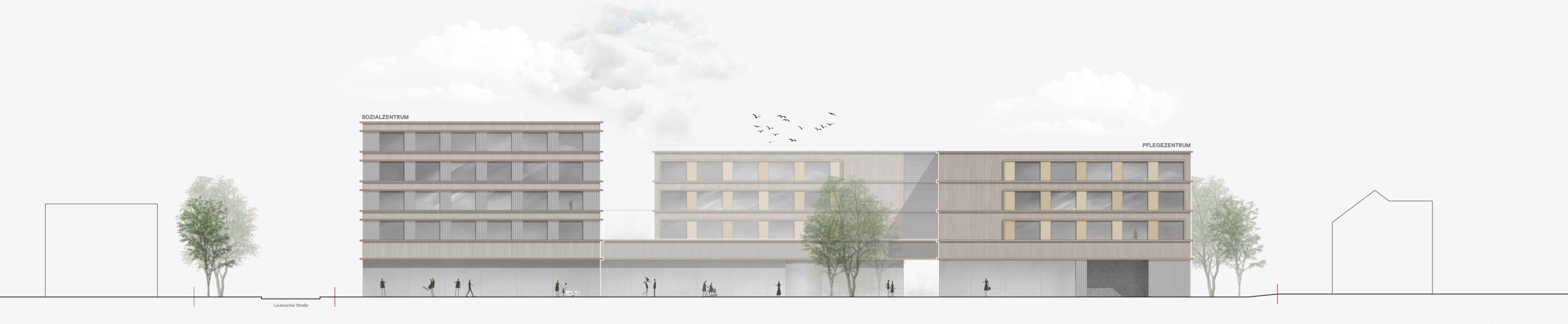Durch die Gliederung der Baumasse in Teilvolumen werden die Gebäudelängen des Gesamtkomplexes entlang Landesstraße und Lauteracher Straße maßstäblich gegliedert und können sich so gut in die umgebende städtebauliche Körnung einfügen. Durch den Versatz zwischen Pflegeheim und Sozialzentrum entsteht darüber hinaus in Verlängerung der Kehlhofstraße eine Raumtasche zum zukünftigen Platz, die sich als neuer Endpunkt über eine Raumfolge bis in die historische Ortsmitte verbinden kann und als zentraler Erschließungsbereich für die neuen Programme anbietet.