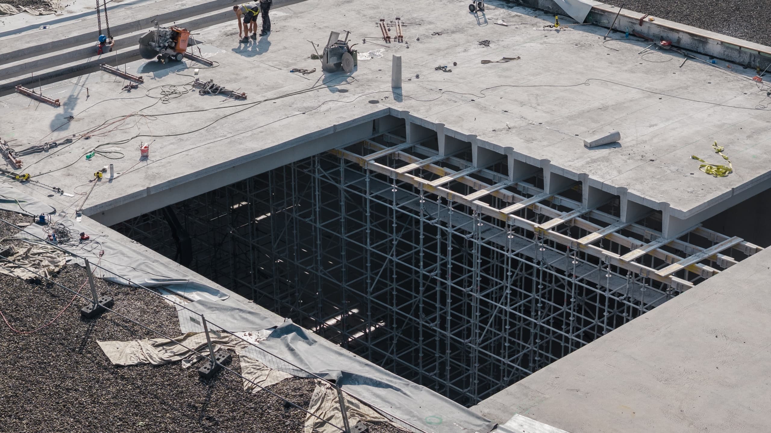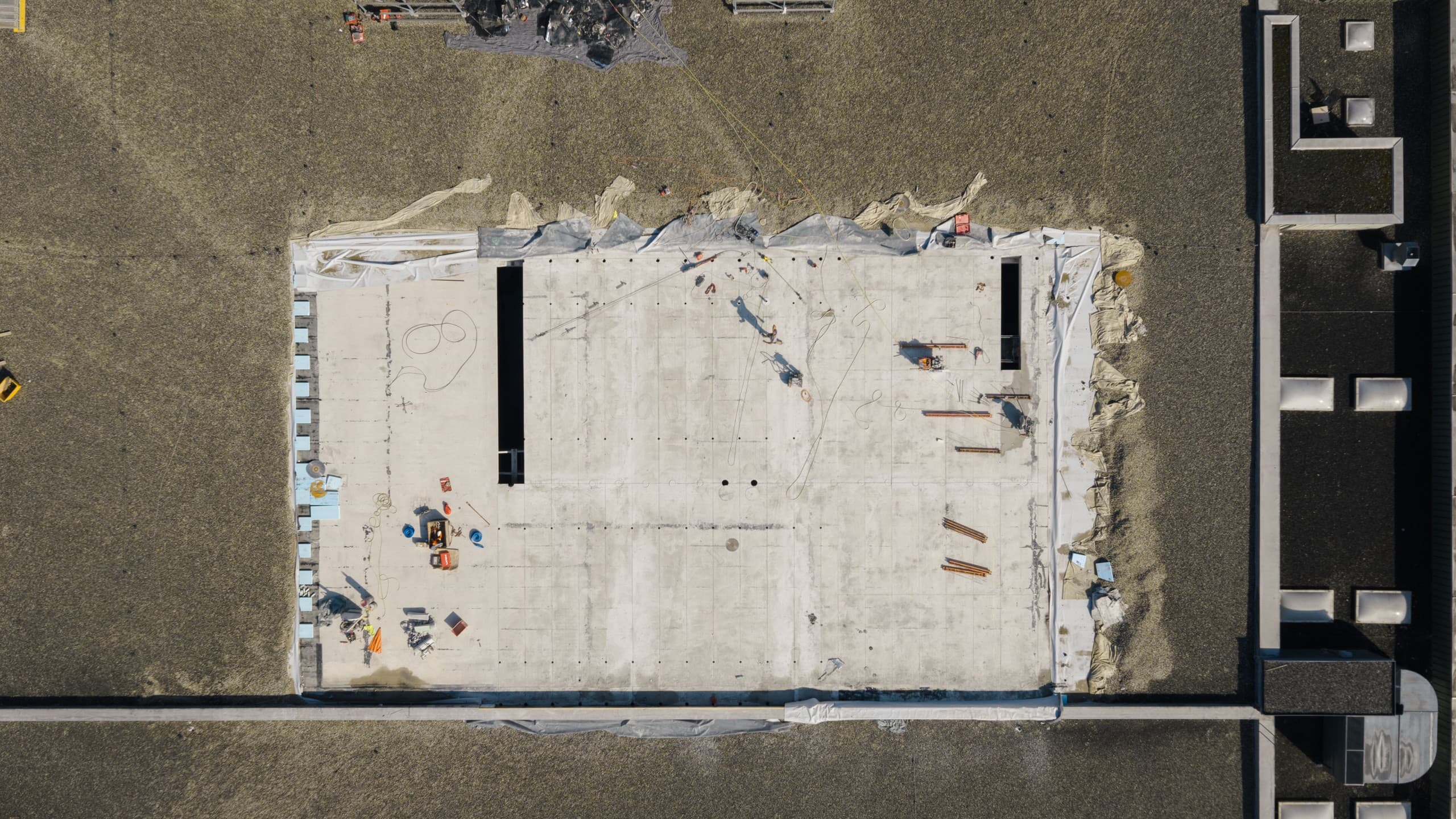 Ein besonderer Meilenstein war das Öffnen des Daches, durch das nun Licht in das Gebäude fällt. Mit zwei großen Mobilkränen wurde das massive Dach Stück für Stück ausgebaut. Die Betonelemente sind aktuell zwischengelagert und kommen beim Bau von Sitzstufen im Eingangsbereich wieder zum Einsatz.