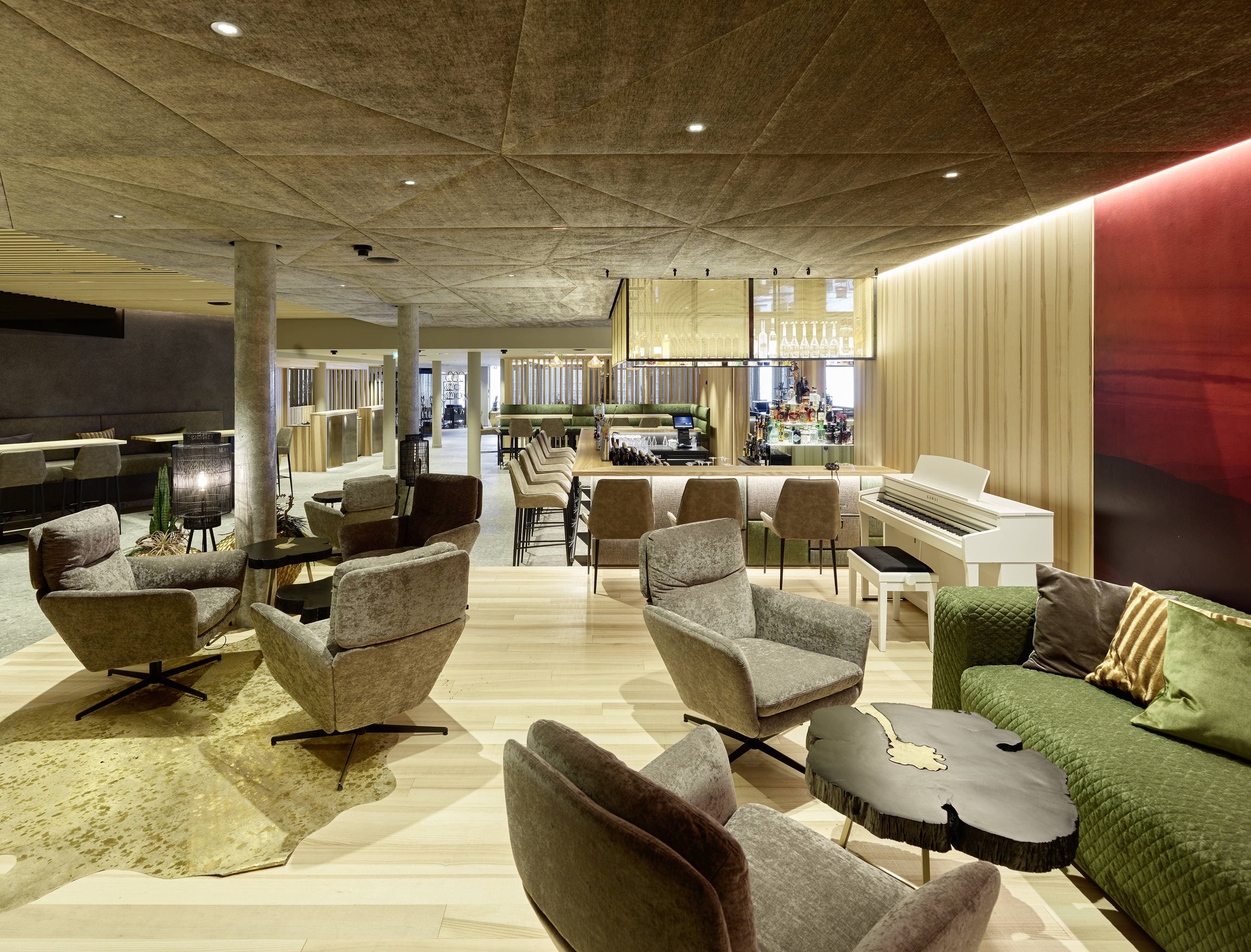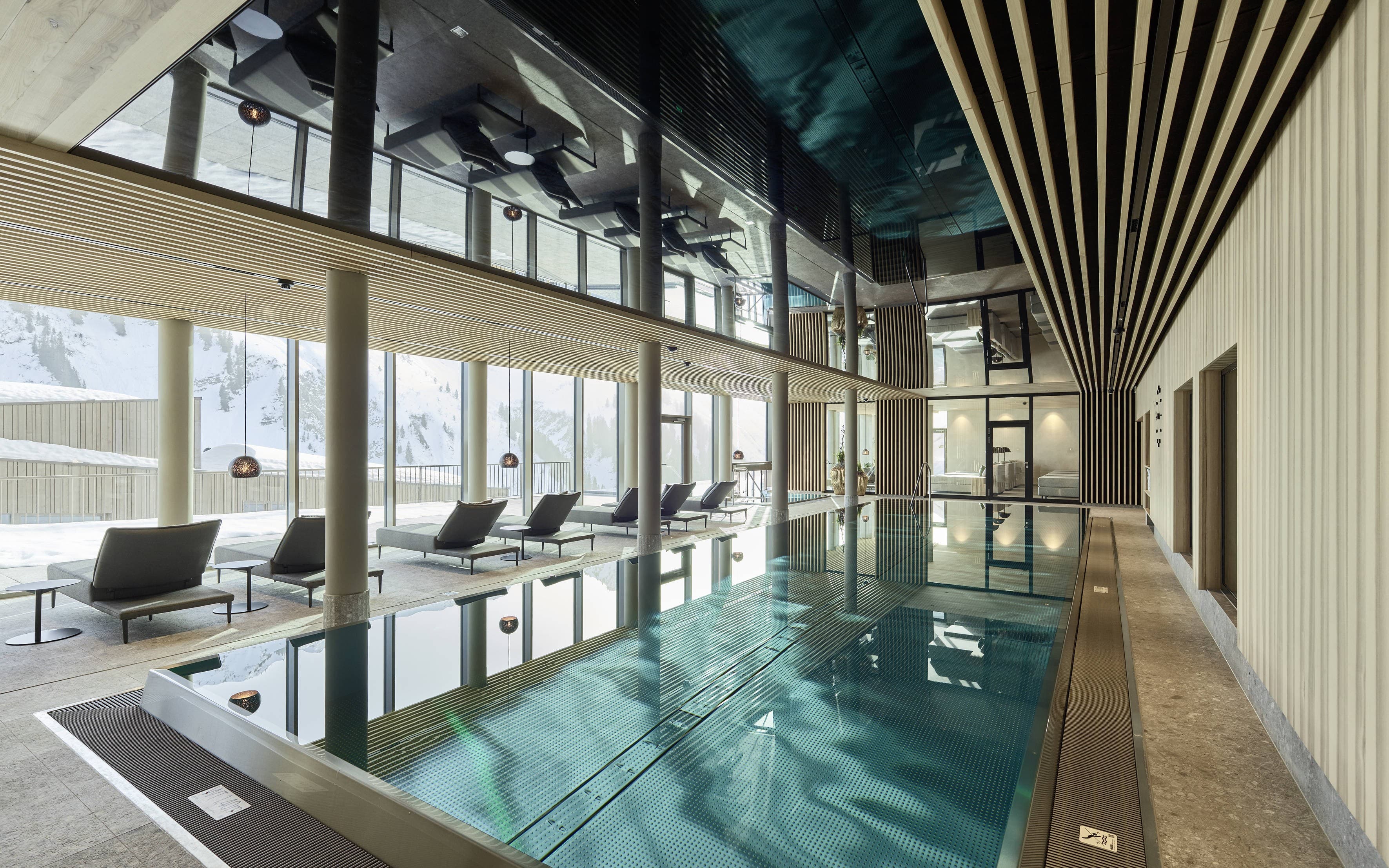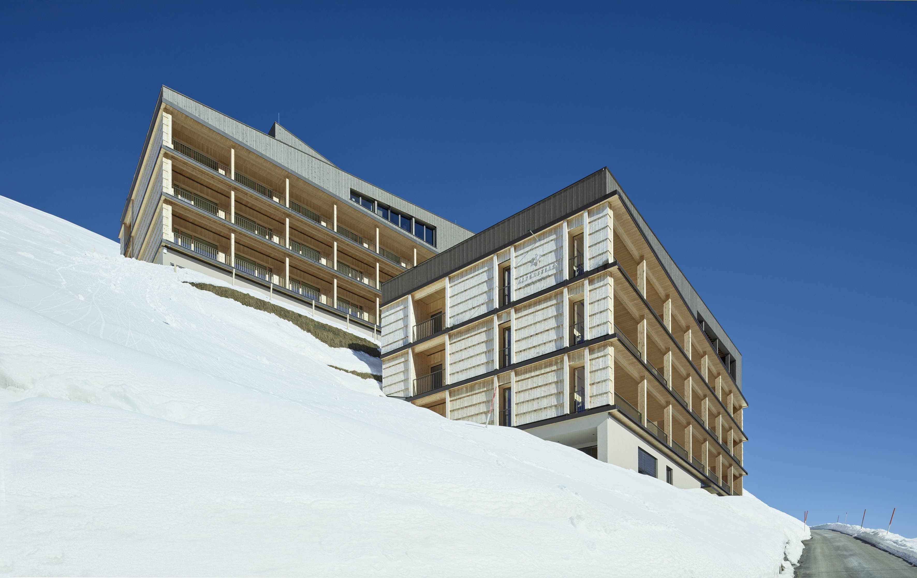 In Form und Material orientiert sich das Projekt an der traditionellen Bauweise mit massiven Sockeln, hölzernen Obergeschossen und geneigten Dächern, interpretiert diese jedoch neu und der Gebäudegröße angepasst.