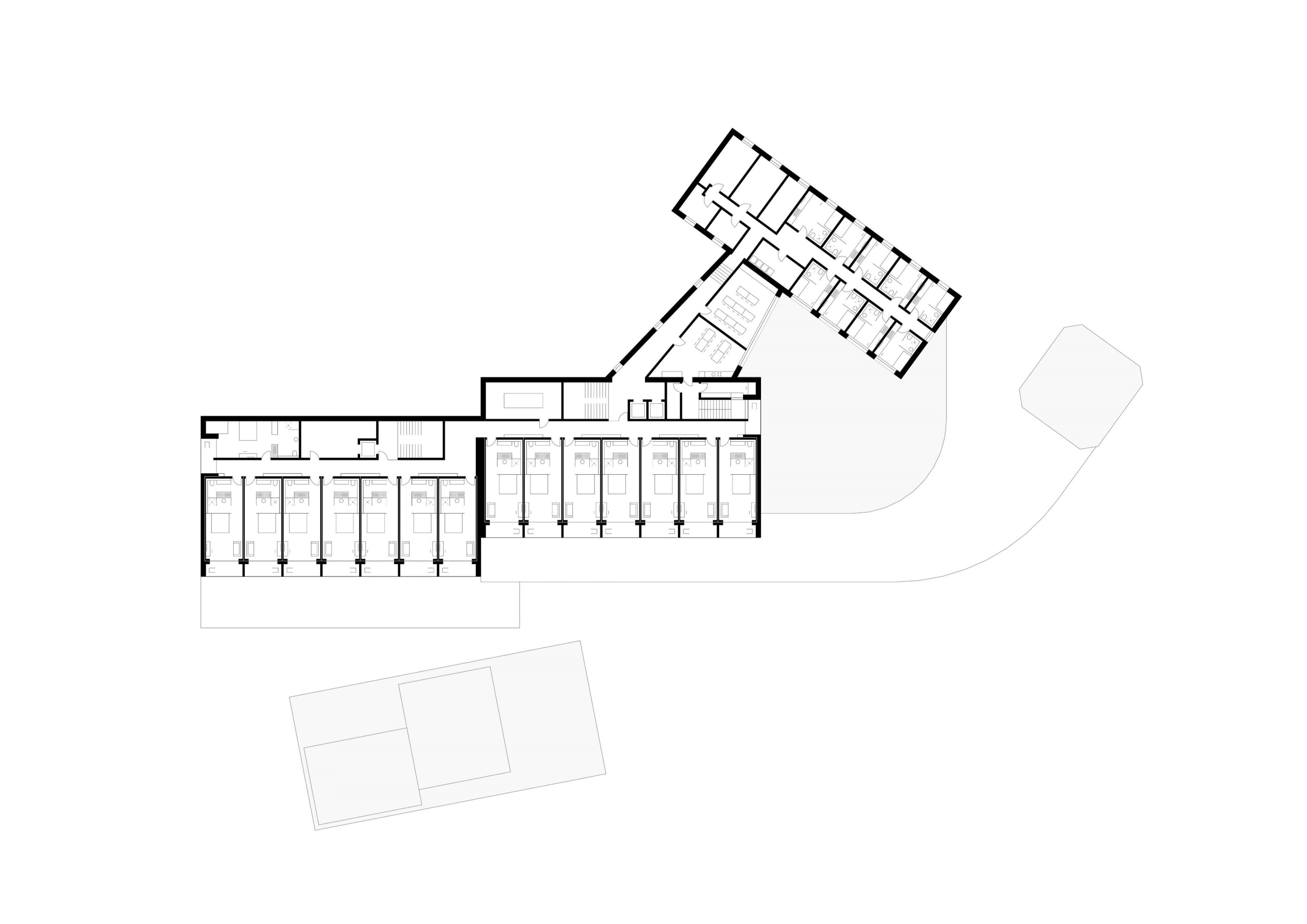 Um die Gesamtanlage der eher kleinteiligen Nachbarbebauung anzupassen wird der Gesamtkomplex in Einzelbaukörpern gegliedert, die in ihrer Größe in etwa dem bestehenden Pultdachgebäude entsprechen. Die Anlage erscheint somit aus mehreren kleineren Baukörpern zu bestehen, die in Lage und Höhe versetzt zueinander angeordnet sind.