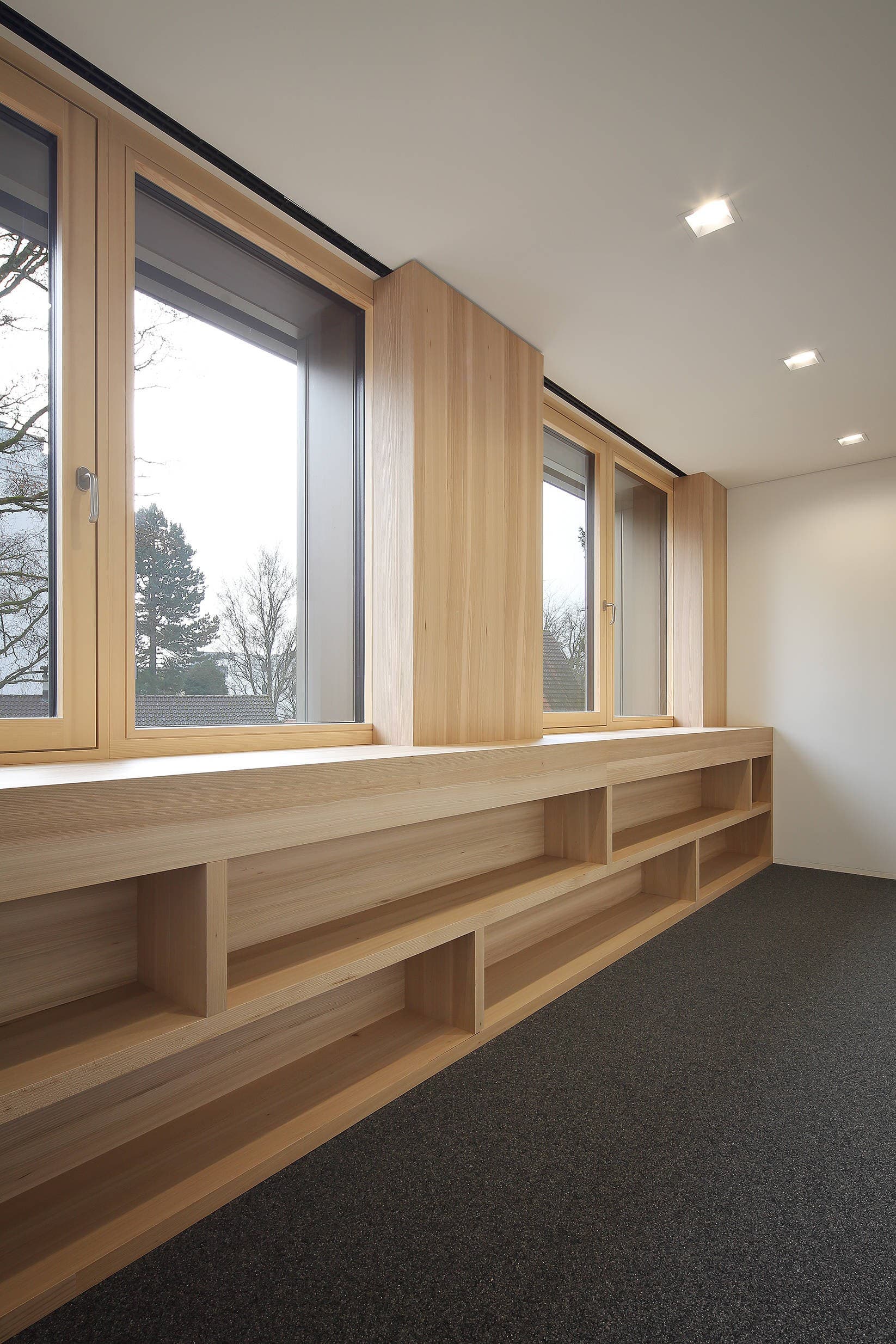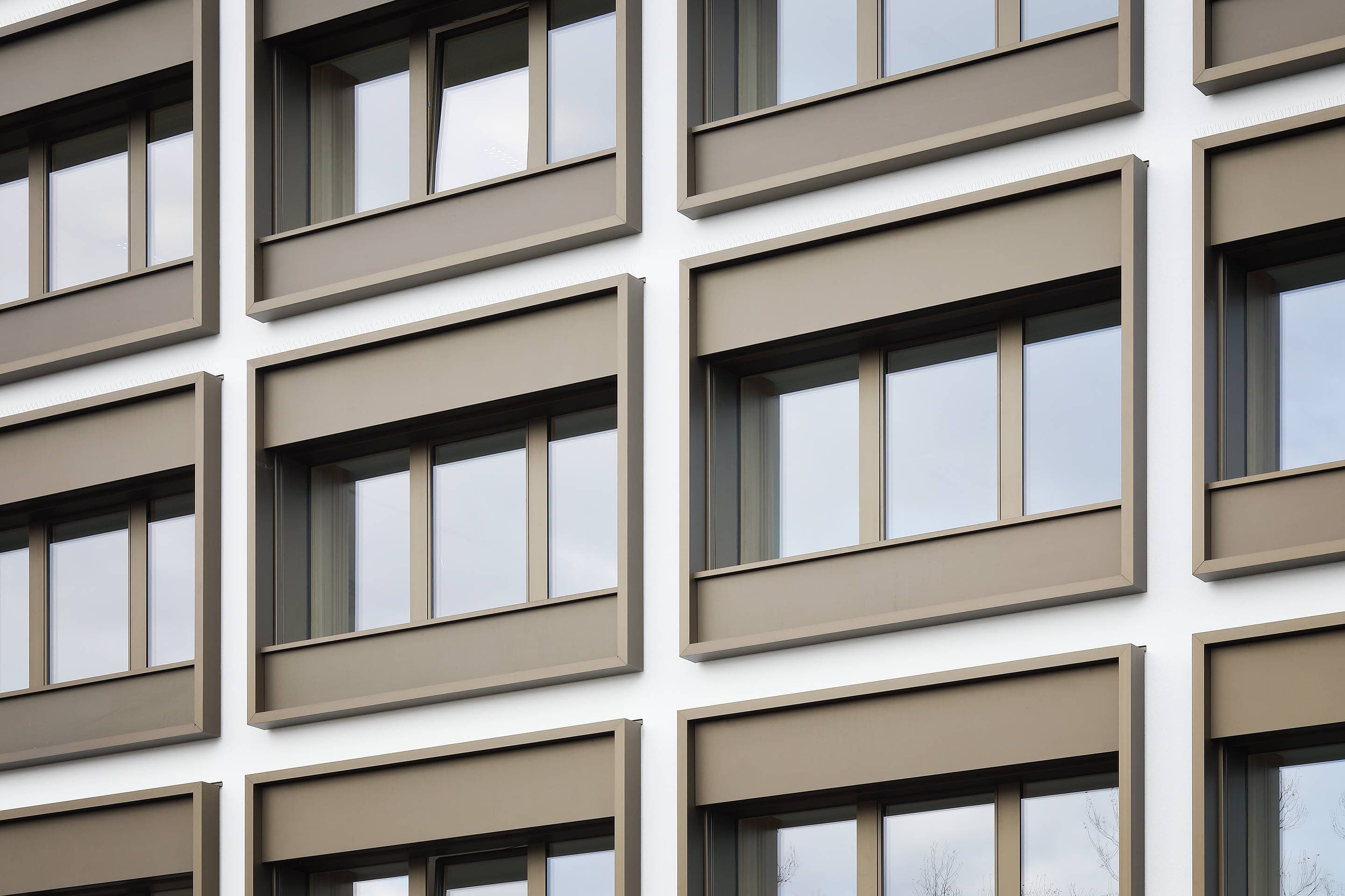 Eine weitere architektonische Tiefenwirkung wird durch die, im Bereich der Fensterelemente, nochmals um eine Ebene zurückversetzten Öffnungsflügel erreicht. Die Rahmenkonstruktionen sind mit Verblechungen aus farblich eloxierten Aluminium gegenüber den Putzflächen abgesetzt.