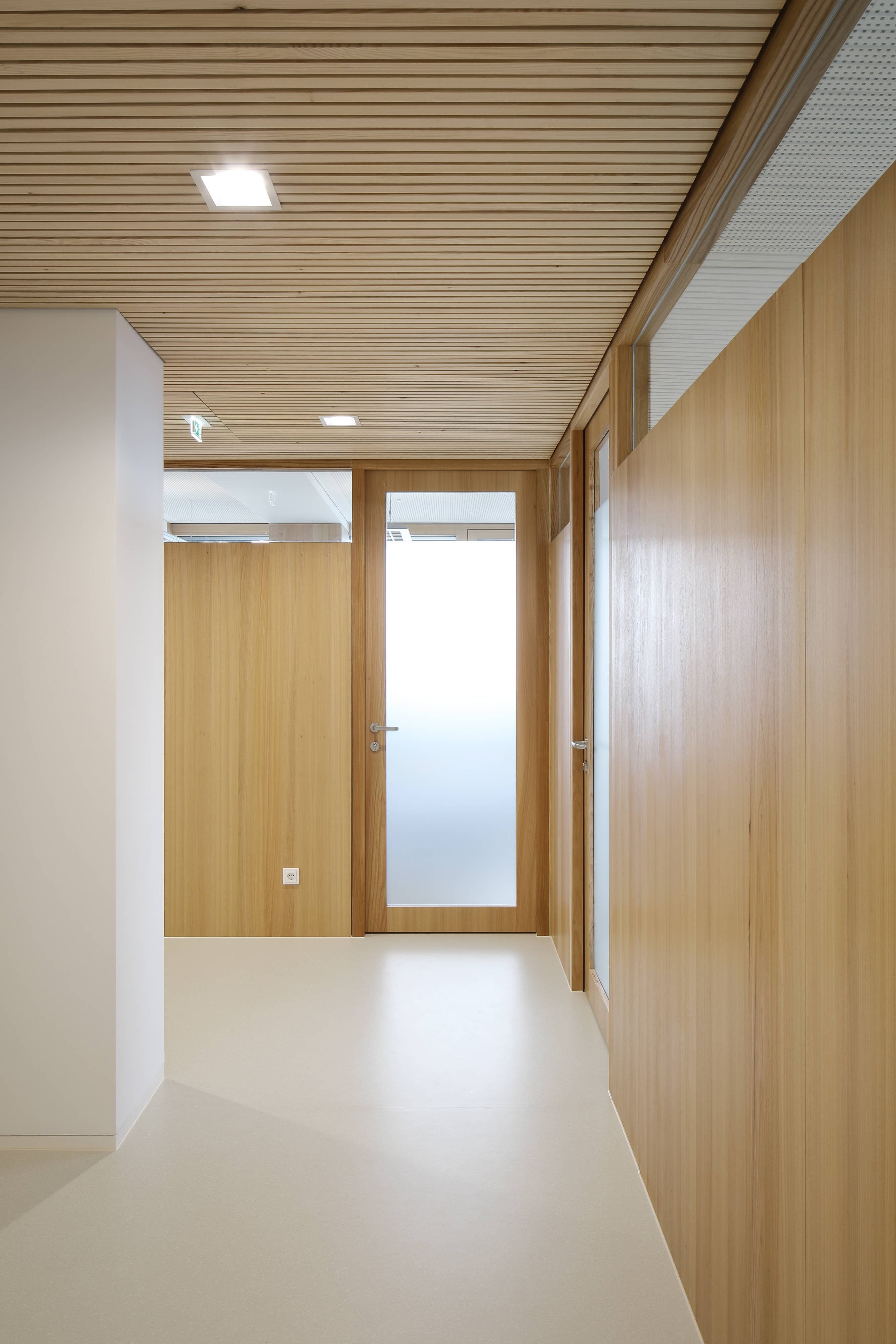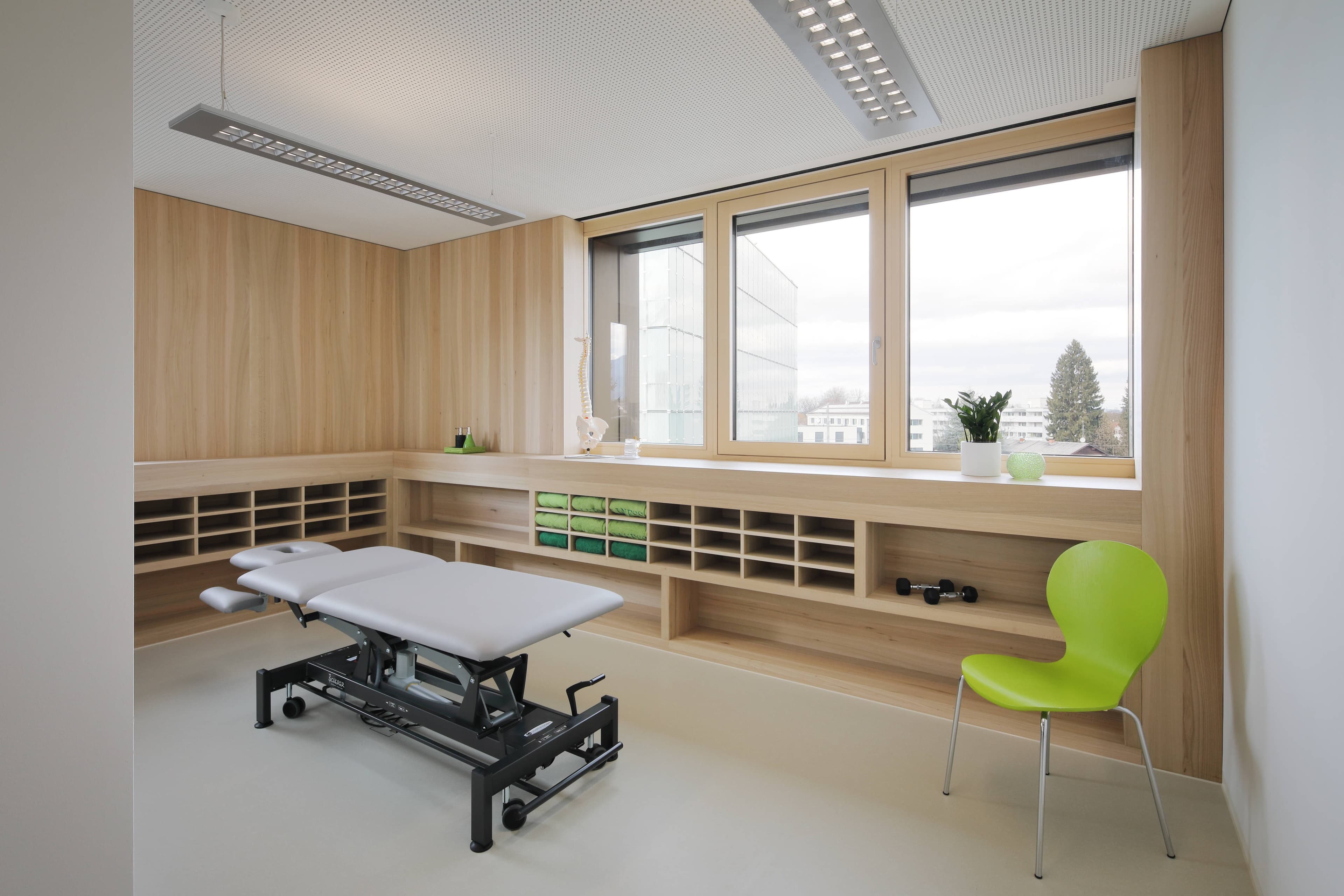 Die Gebäudehülle des Massivbaues wurde dabei thermisch saniert und gesamthaft verbessert. Dabei wurden die bestehenden Putzflächen mit einem Vollwärmeschutz versehen. Die Fensterflächen wurden durch 3-fach verglaste Holz-Alu-Fenster ersetzt. Die Fassadenbereiche um die Fenster werden ergänzt durch außenseitig aufgesetzte Holzrahmenkonstruktionen, mit gedämmten Brüstungs- und Sturzbereichen und integriertem Sonnenschutzanlagen.