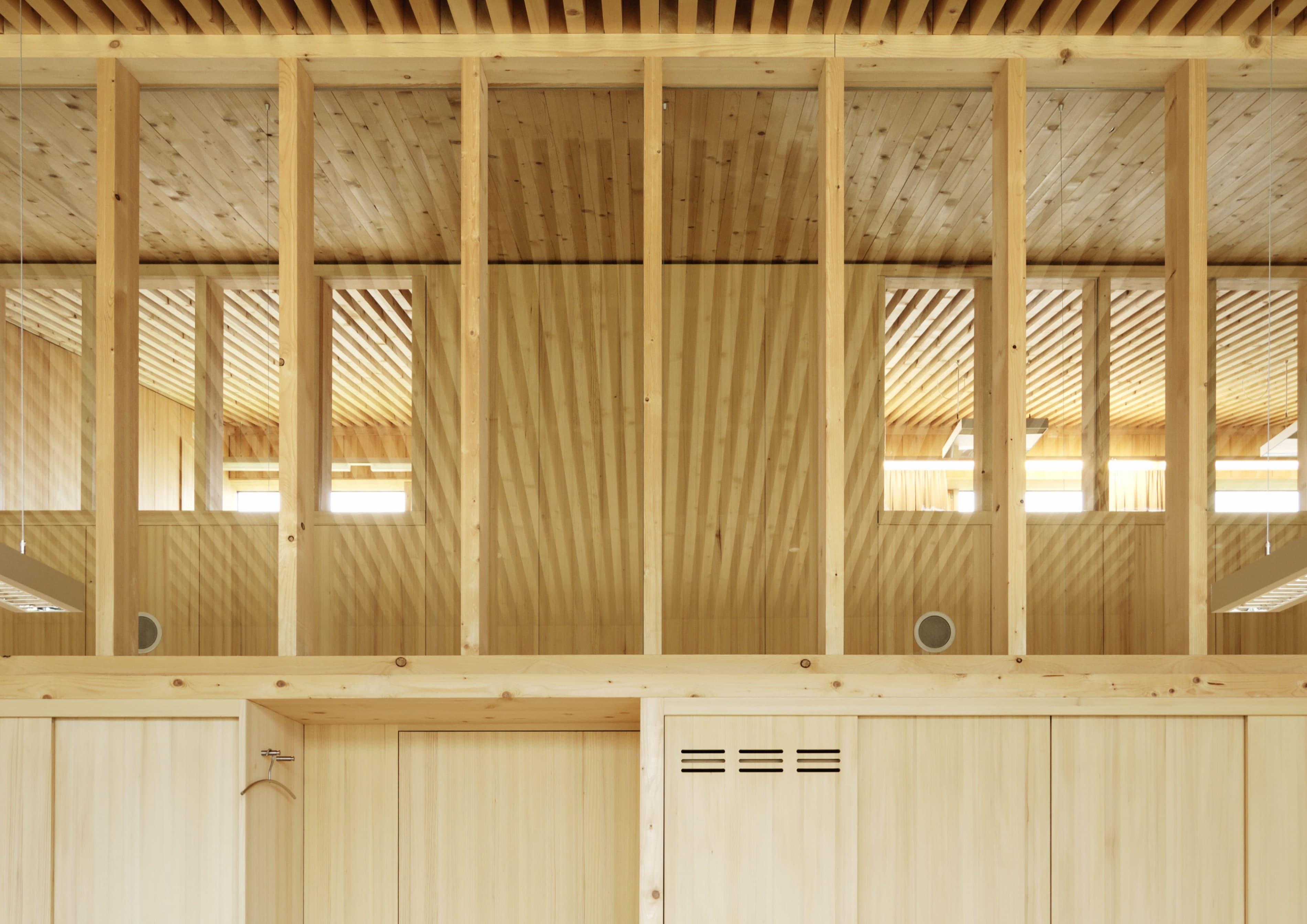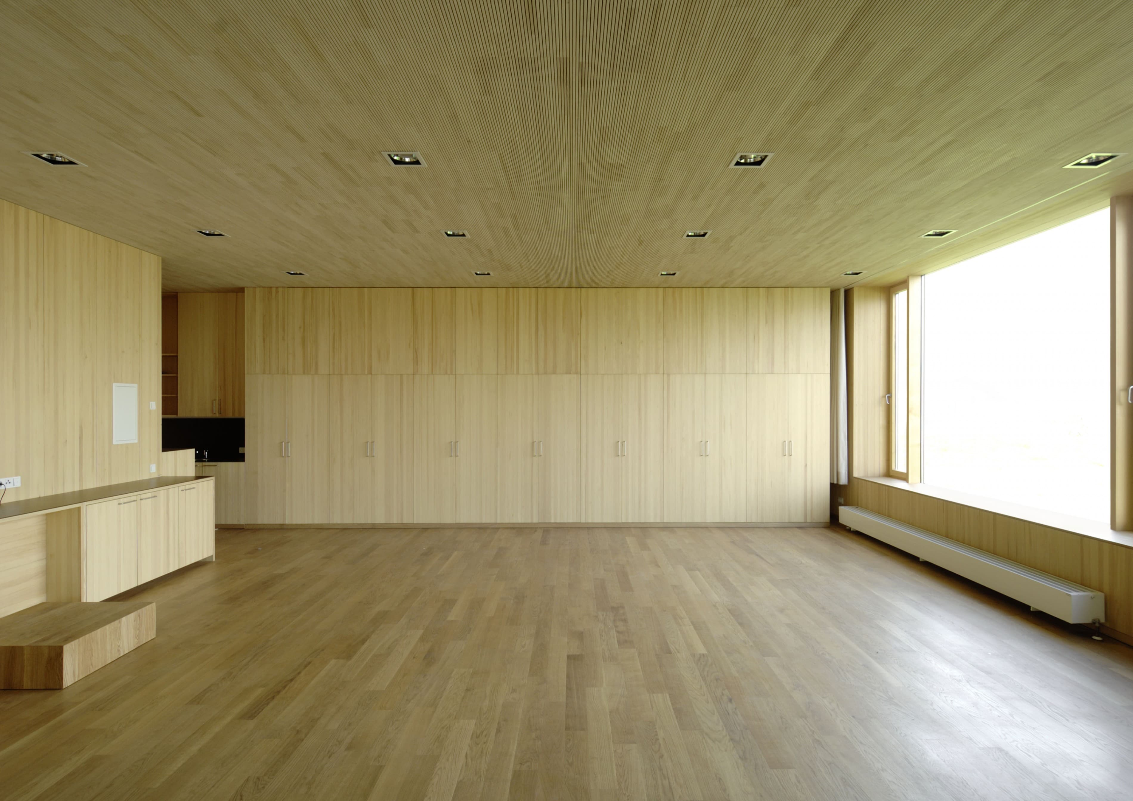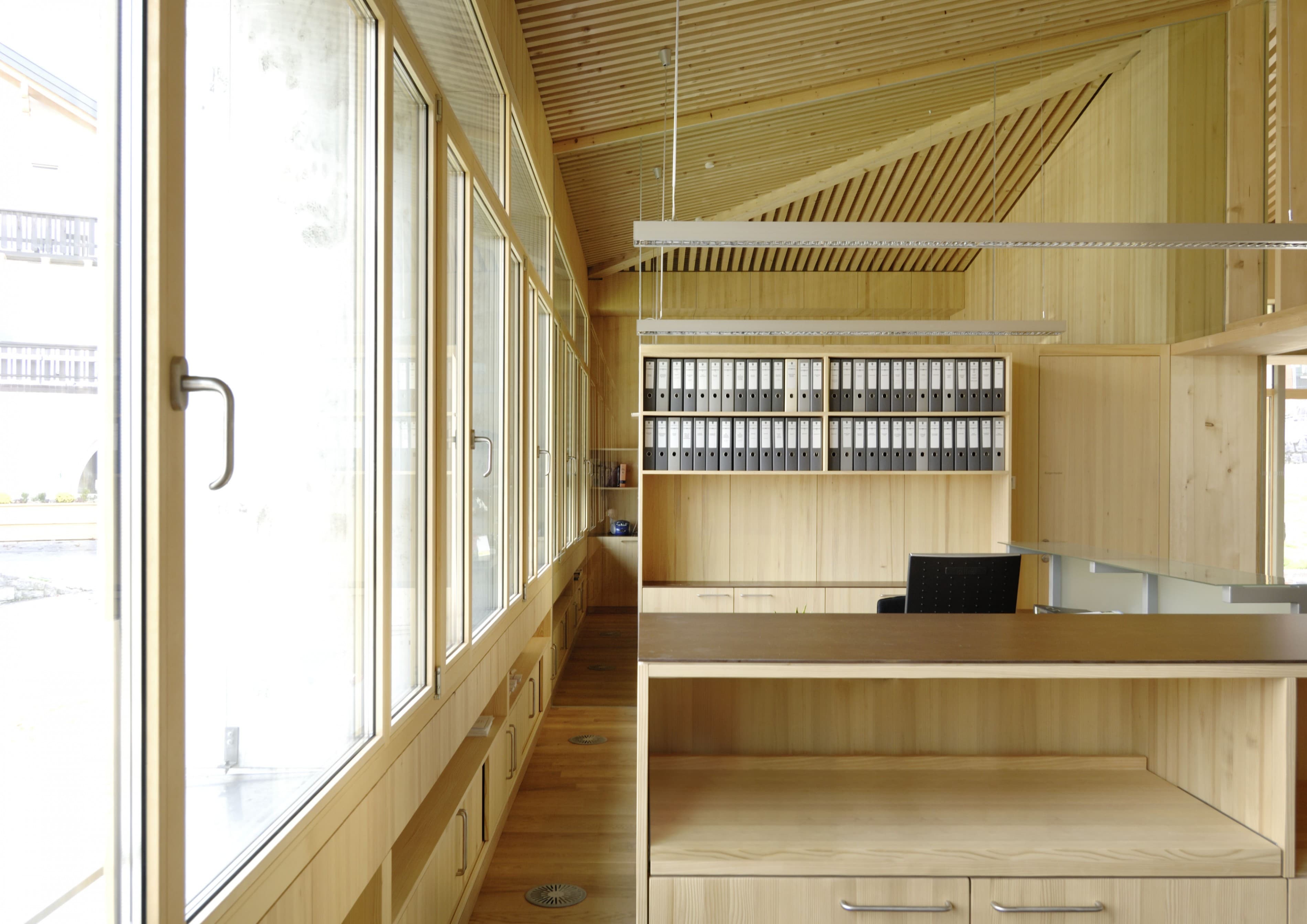 Das Gebäude tritt nach außen hin insbesondere mit einer Holzfassade und wenigen, aber großzügigen Öffnungen in Erscheinung. Das Dach wurde als zweiseitig geneigtes Pultdach in Blech ausgeführt. Im Inneren spielt Holz neben wenigen anderen Materialien die wesentlichste Rolle. Für Wand-, Deckenverkleidungen und Einrichtung wurden fast ausschließlich massive Weißtannenplatten verwendet, die zusammen mit den großzügigen Raumhöhen und Verglasungen eine angenehme Raumatmosphäre erzeugen.