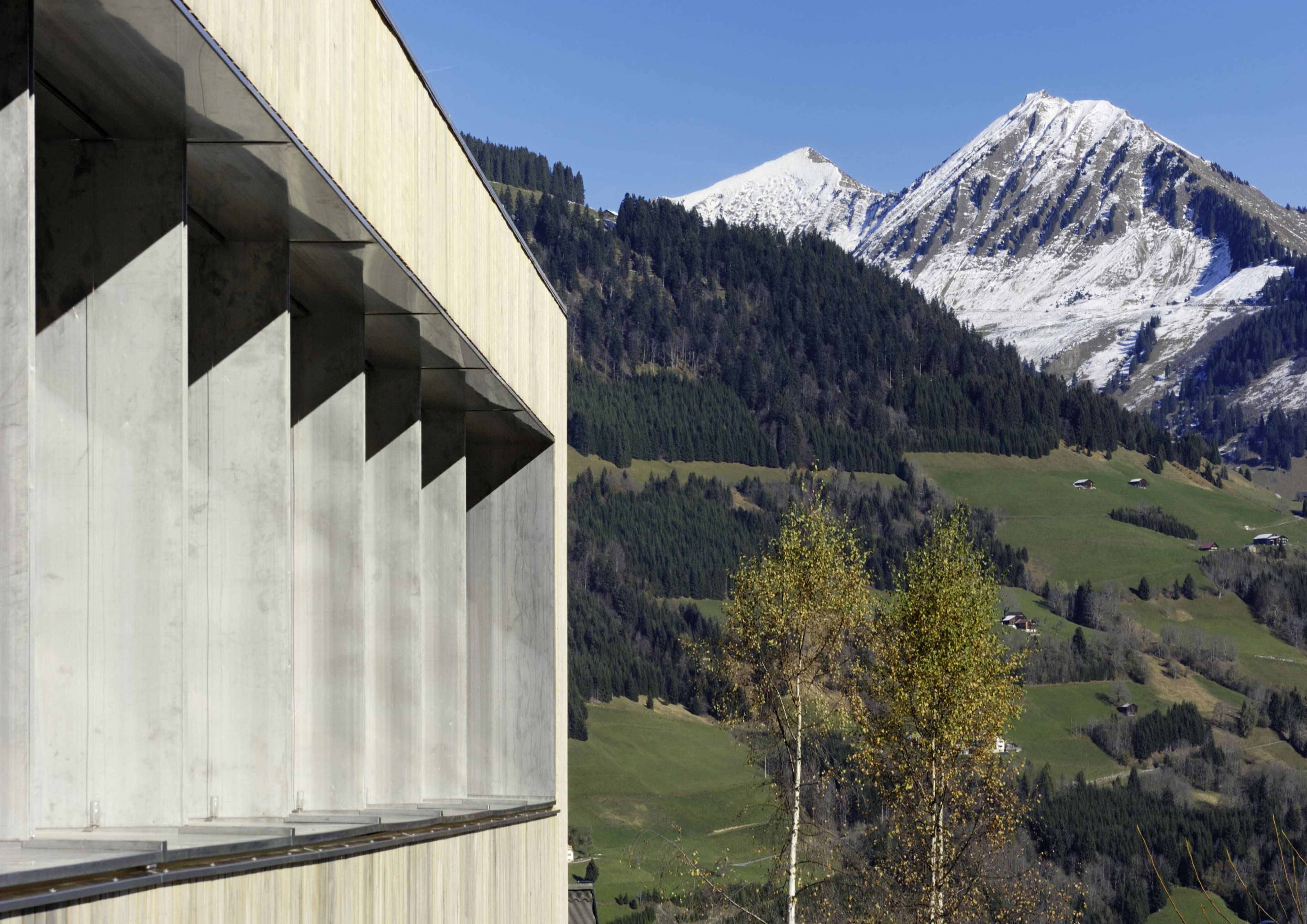 Der Neubau des Gemeindehauses ist zum bestehenden Dorfplatz hin situiert und ergänzt das bestehende Ensemble mit Kirche, Schulhaus und Gasthof. Um die Aussicht vom Kirchplatz taleinwärts möglichst wenig zu beeinträchtigen, wurde an der Straße ein eingeschossiger, nach Norden ansteigender Baukörper situiert. Die Dachform entwickelt sich aus der räumlichen Situation mit dem aufgesetzten Sitzungssaal, der Zuschnitt erzeugt spannende, großzügige Raumsituationen. Das neue Gebäude umfasst Untergeschoss, Erdgeschoss und ein Obergeschoss.