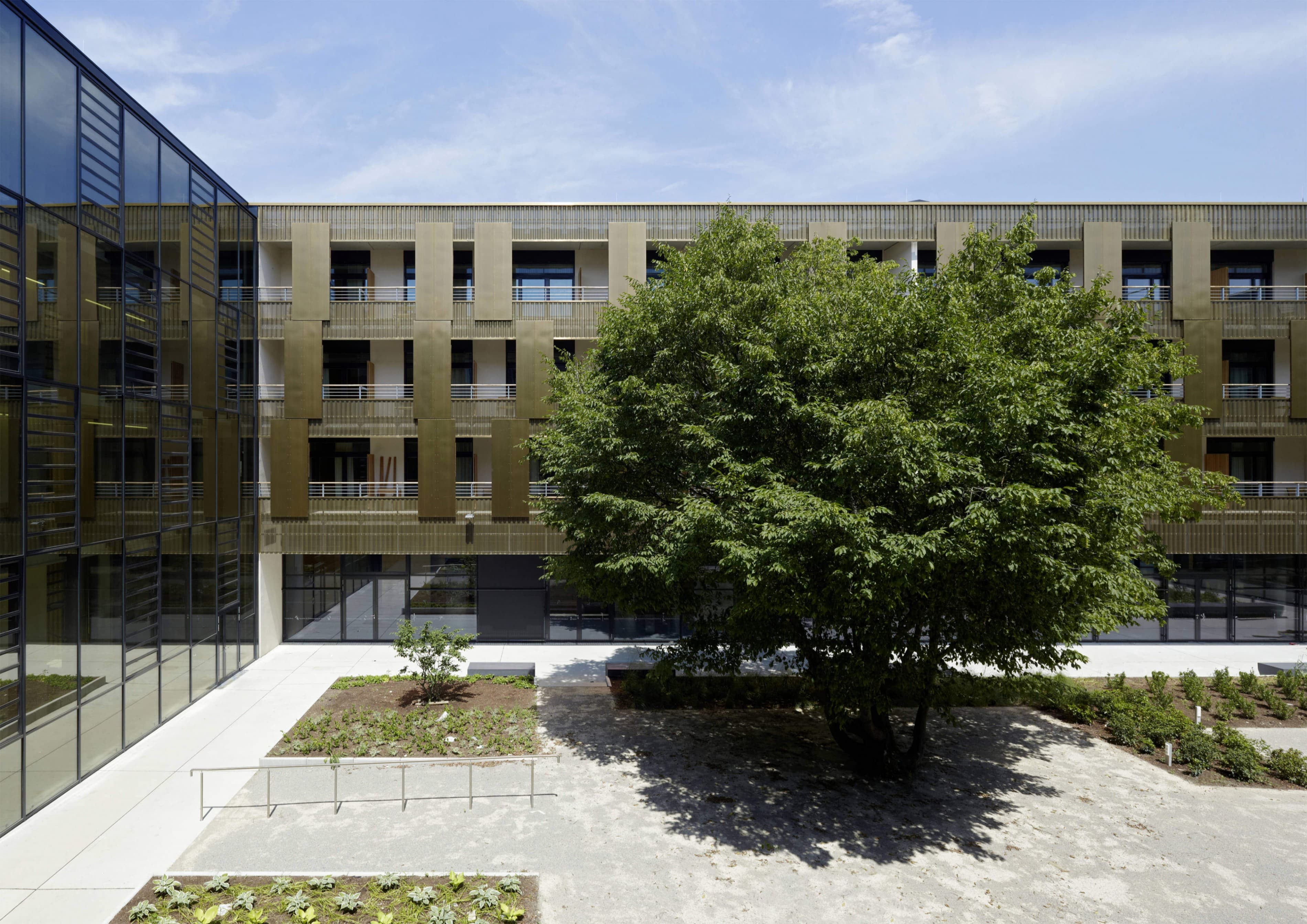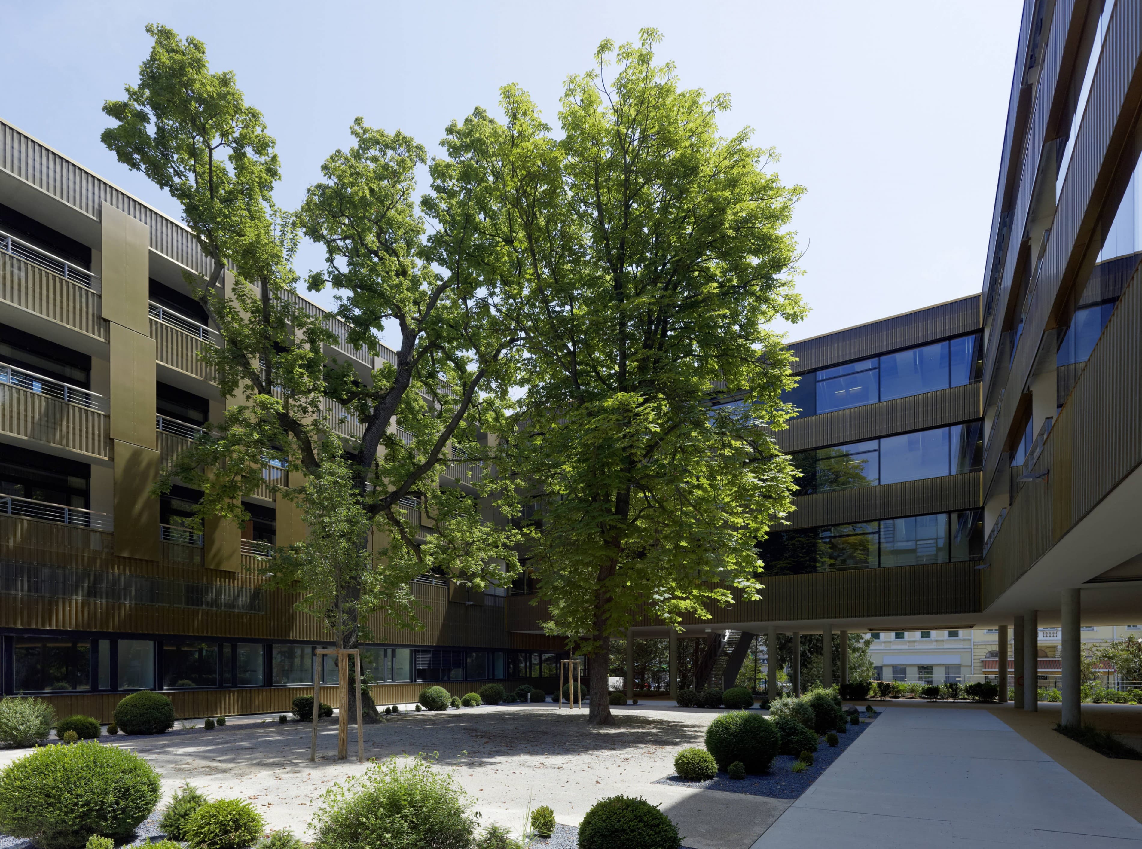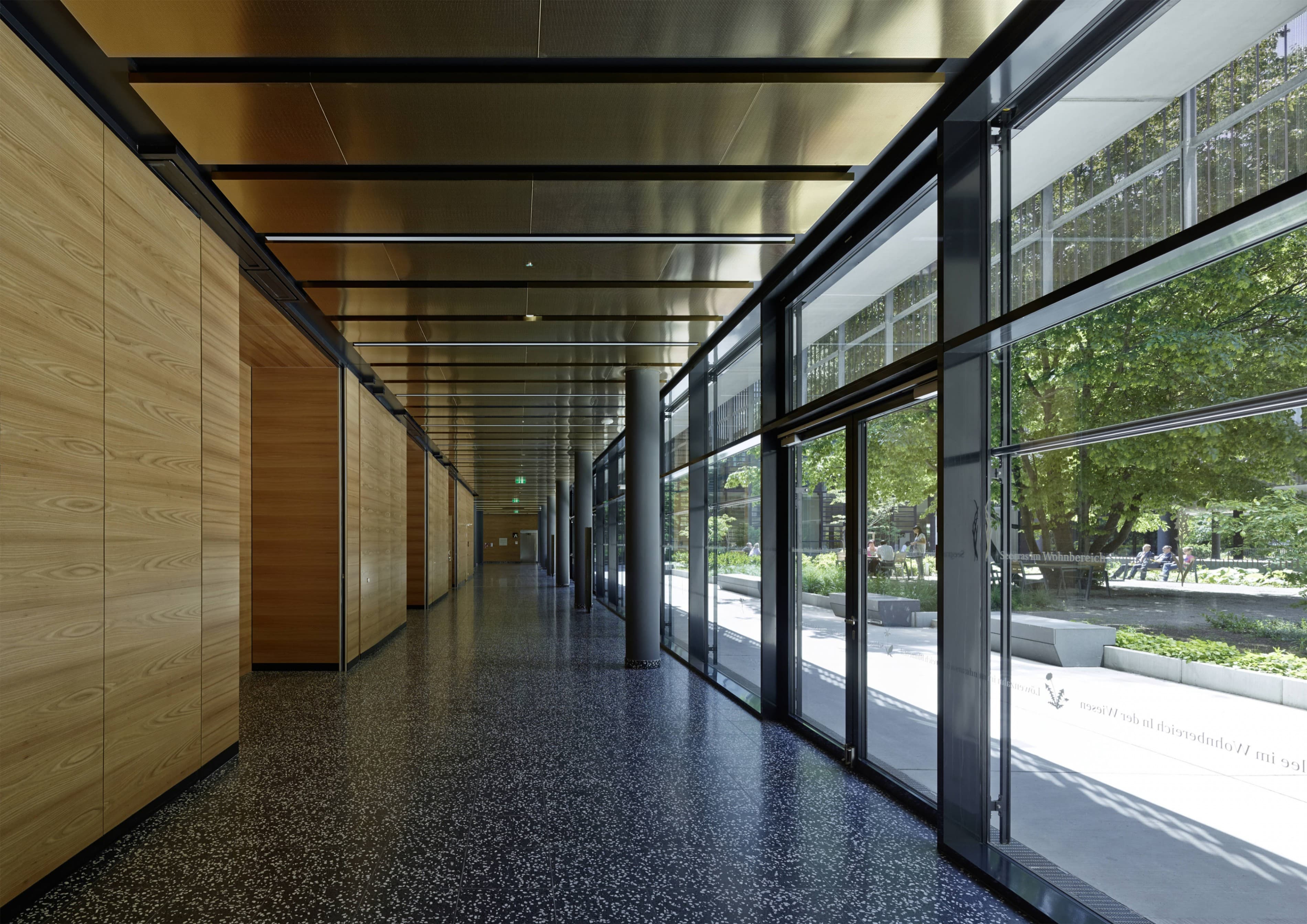 Die Neue Geriatrie ist kein hermetischer Block, sondern raumgreifend offen strukturiert, um – zu Gunsten der Bewohner – vielfältige Freiraumbezüge zu ermöglichen. Der großzügige, durch zwei gläserne Brückenspangen gegliederte Innenhof ergibt abwechslungsreiche, spannungsvolle Beziehungen zwischen Park und Bauwerk. Der Park ist nicht nur „draußen“, sondern wird zum bestimmenden Bestandteil der gesamten Anlage. Es entstehen differenzierte Freiraumsituationen, die dem breiten Spektrum an Nutzungserfordernissen besser entsprechen als allgemeingültige Lösungen. Die Erdgeschosszone bleibt weitgehend durchlässig und barrierefrei. Es entfalten sich verschiedene Ambiente, die zwischen Geborgenheit und Offenheit changieren. Gedeckte Bereiche bilden „weiche“ Übergänge und bieten beschattete Plätze inmitten der Parks. Wenn auch eine klare Abgrenzung für das Geriatriezentrum erforderlich ist, so bietet die vorgeschlagene Strukturierung der Parkfläche auch für die Bewohner des Bezirks zusätzliche Nutzungsmöglichkeiten und insgesamt vielfältige attraktivere Aufenthaltsqualitäten.