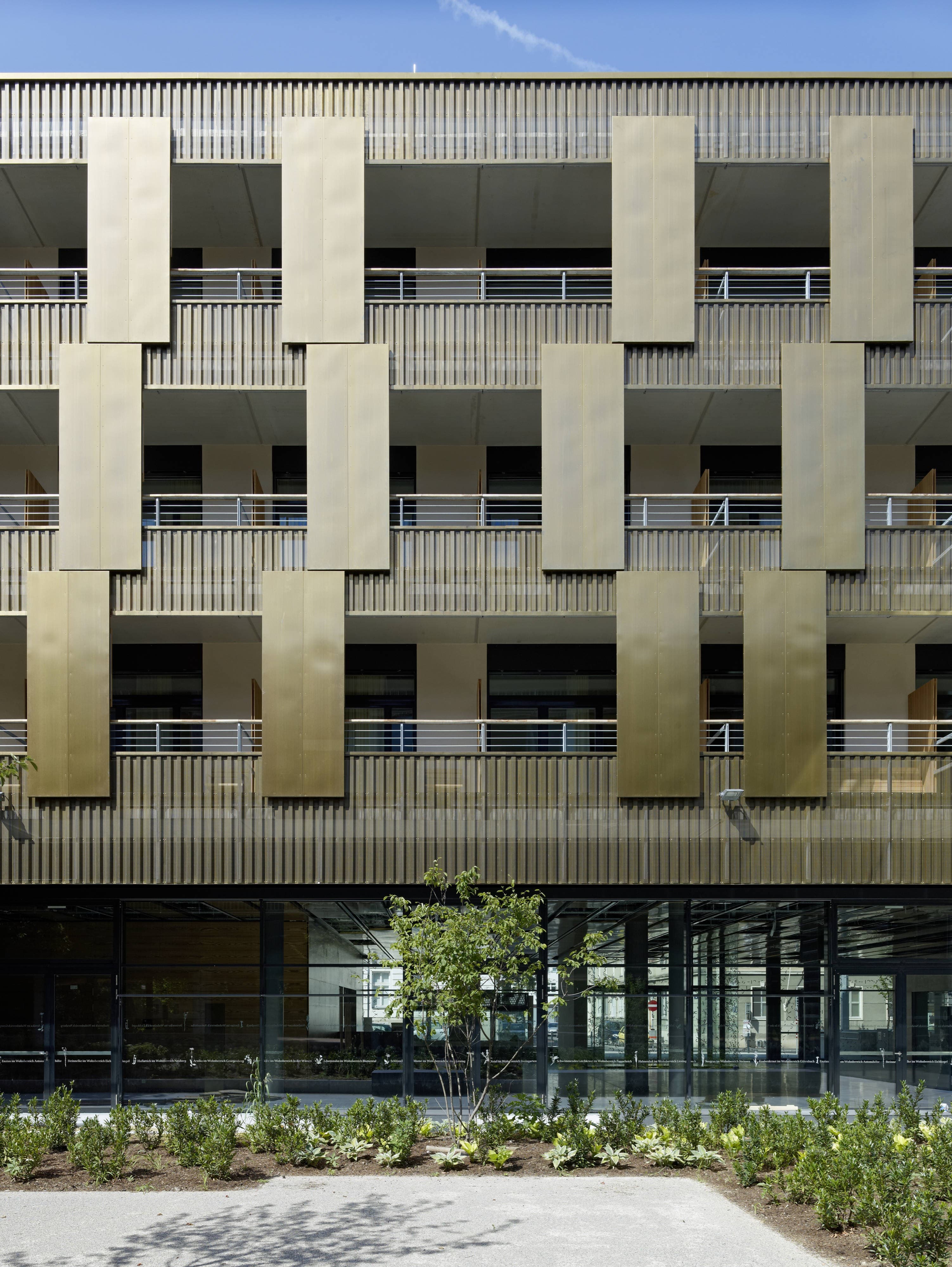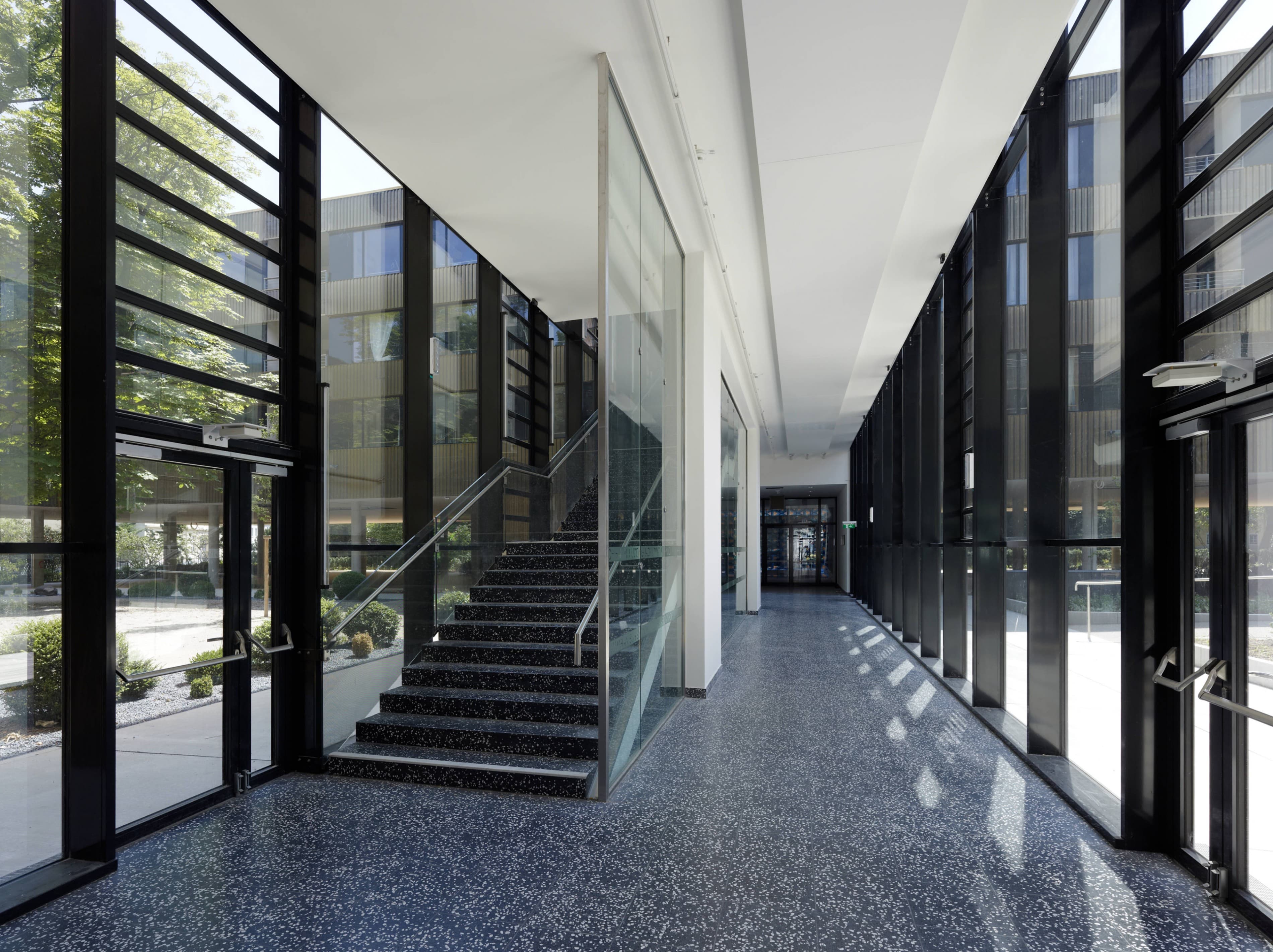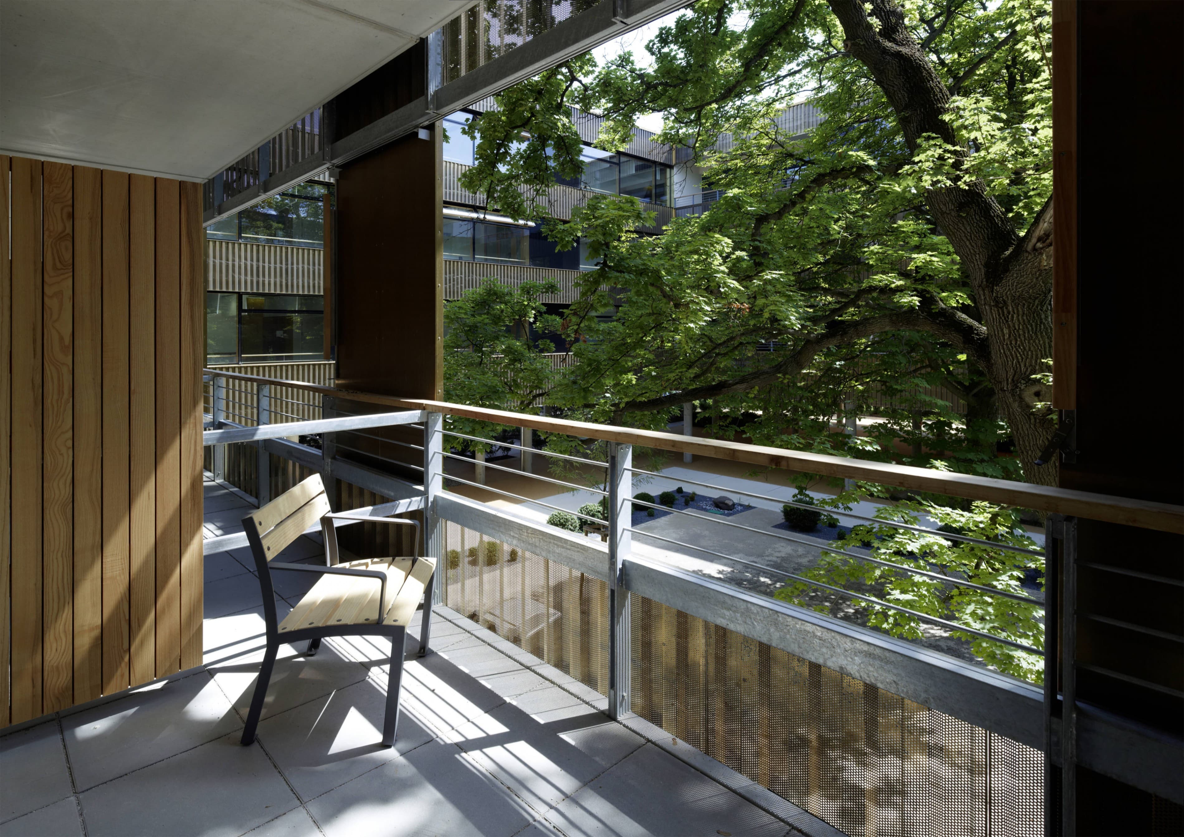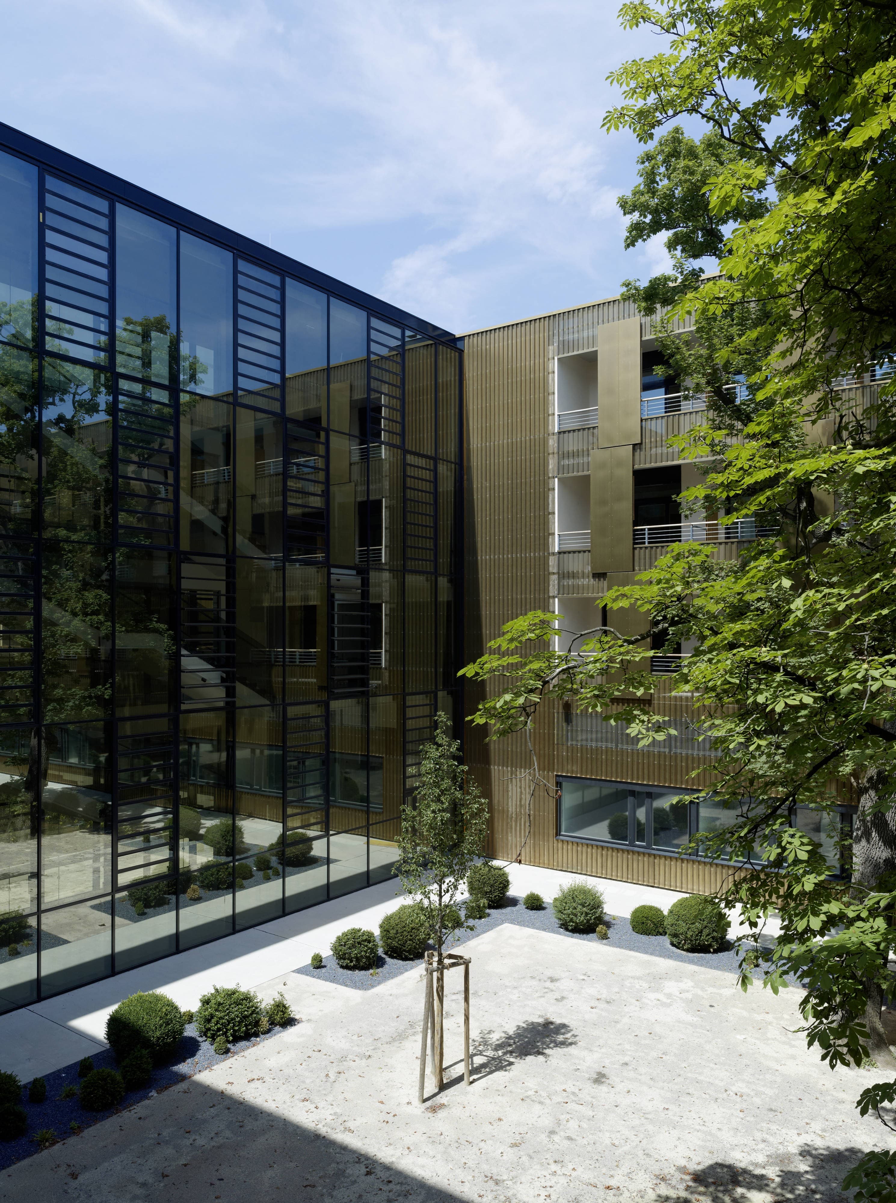 Die Neue Geriatrie ist kein hermetischer Block, sondern raumgreifend offen strukturiert, um – zu Gunsten der Bewohner – vielfältige Freiraumbezüge zu ermöglichen. Der großzügige, durch zwei gläserne Brückenspangen gegliederte Innenhof ergibt abwechslungsreiche, spannungsvolle Beziehungen zwischen Park und Bauwerk. Der Park ist nicht nur „draußen“, sondern wird zum bestimmenden Bestandteil der gesamten Anlage. Es entstehen differenzierte Freiraumsituationen, die dem breiten Spektrum an Nutzungserfordernissen besser entsprechen als allgemeingültige Lösungen. Die Erdgeschosszone bleibt weitgehend durchlässig und barrierefrei. Es entfalten sich verschiedene Ambiente, die zwischen Geborgenheit und Offenheit changieren. Gedeckte Bereiche bilden „weiche“ Übergänge und bieten beschattete Plätze inmitten der Parks. Wenn auch eine klare Abgrenzung für das Geriatriezentrum erforderlich ist, so bietet die vorgeschlagene Strukturierung der Parkfläche auch für die Bewohner des Bezirks zusätzliche Nutzungsmöglichkeiten und insgesamt vielfältige attraktivere Aufenthaltsqualitäten.
