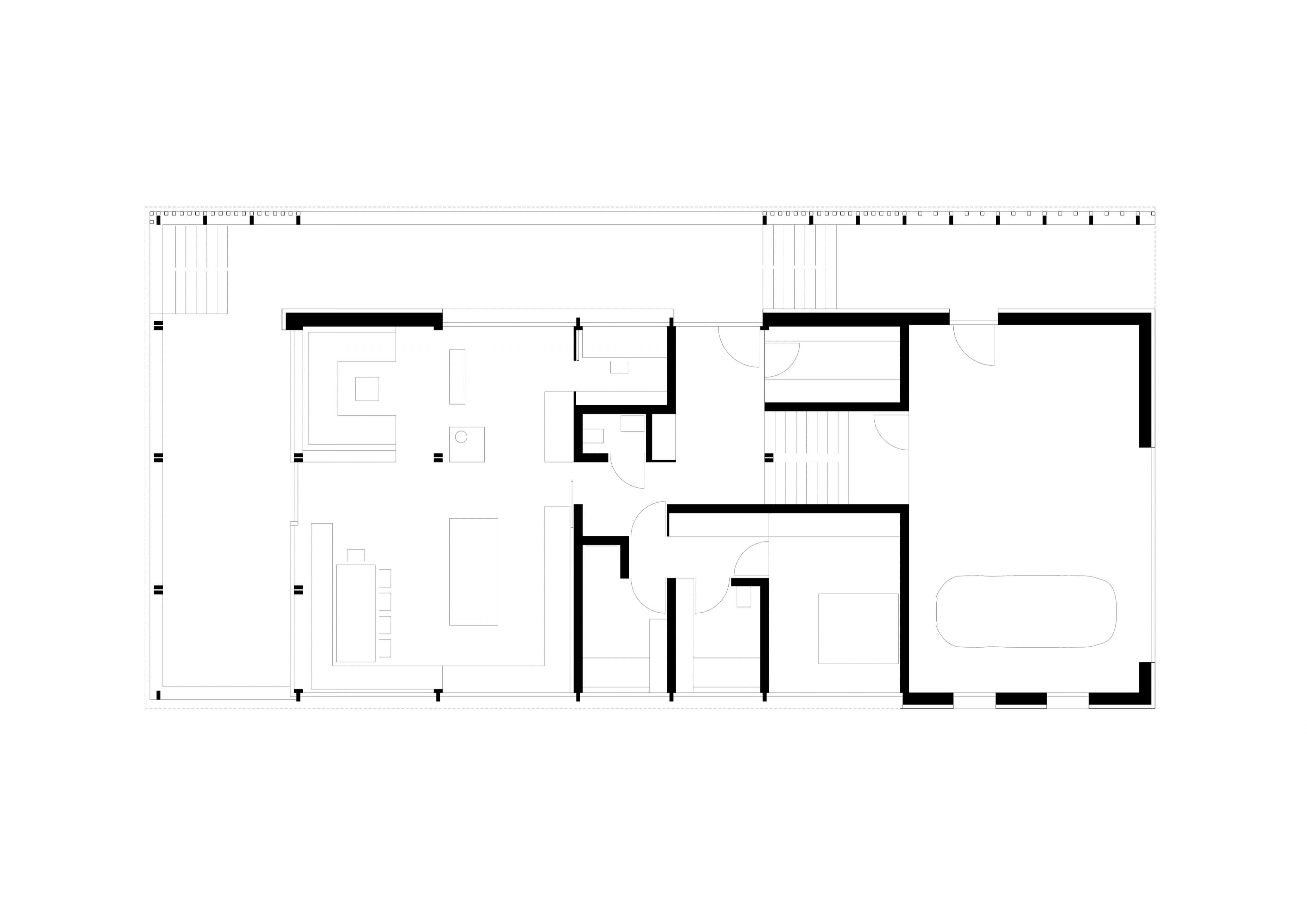 Ursprünglich sollte ein klassisches EFH entstehen, im Laufe der Planung entwickelte sich daraus ein flexibel nutzbares Gebäude mit mehreren Wohneinheiten. Eher zufällig ergaben sich viele Ähnlichkeiten zu der traditionellen Bautypologie eines Bregenzerwälder Hauses. Proportion und Größe sind vergleichbar. Auch das UG ist wie beim traditionellen Wälderhaus nur halb im Erdreich eingebettet, um eine natürliche Belichtung zu ermöglichen. Auch die Traufhöhe von 5 m mit einem vorgelagerten "Schopf" ergeben den Übergang zwischen Freiraum und Gebäude, wie beim traditionellen Bautypus. Und die Erschließung erfolgt über eine Mittelerschließung ergänzt durch ein "Hinterhaus" mit Garage und Mitarbeiterwohnung sind vergleichbar.