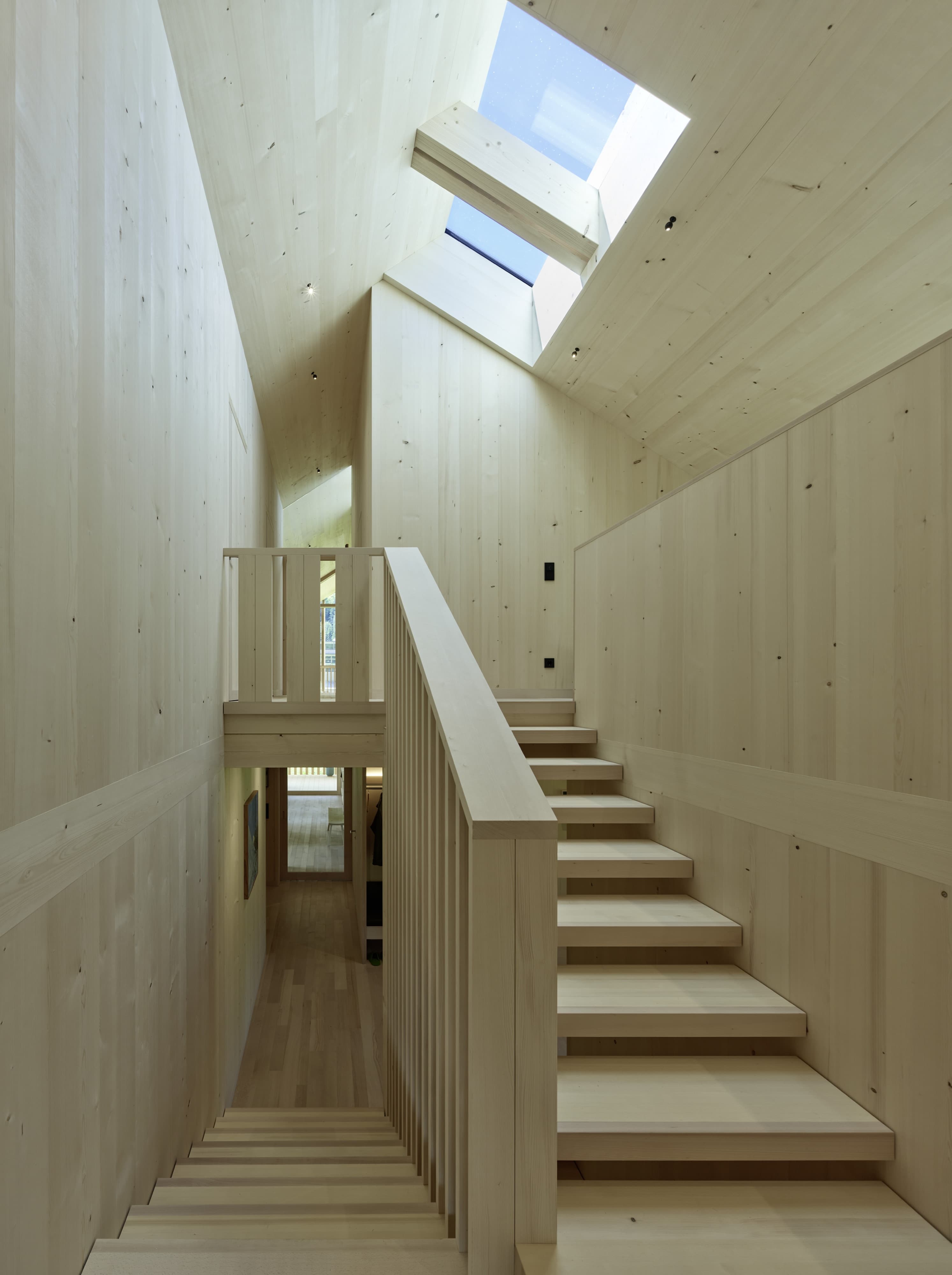 Das Holz, aus nordseitig am Hang gewachsenen Fichten, wurde mit nur ganz wenigen Querschnitten eingeschnitten. Das beste Holz wurde für die sichtbaren Balkenquerschnitte und Dielen verwendet. Aus dem Rest machte man Diagonalschalungen, Lattungen etc. Jeder Kubikzentimeter des Baumes fand seine Anwendung. Mit Ausnahme ganz weniger Dreischichtplatten, wurde alles leimfrei konstruiert. Beim Holz für die Tischlermöbel im Innenraum wurde ergänzend zur Fichte heimisches Buchenholz verwendet.