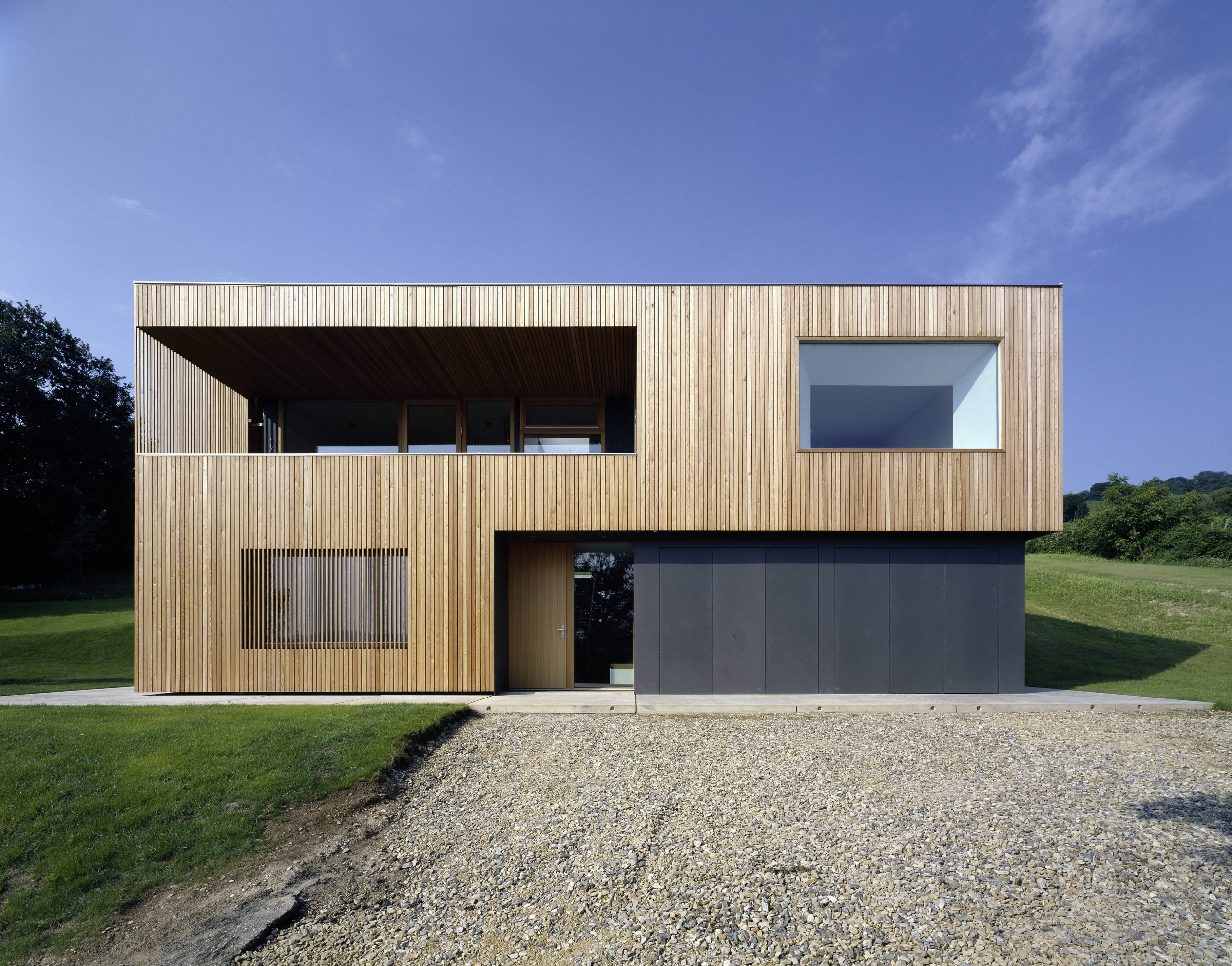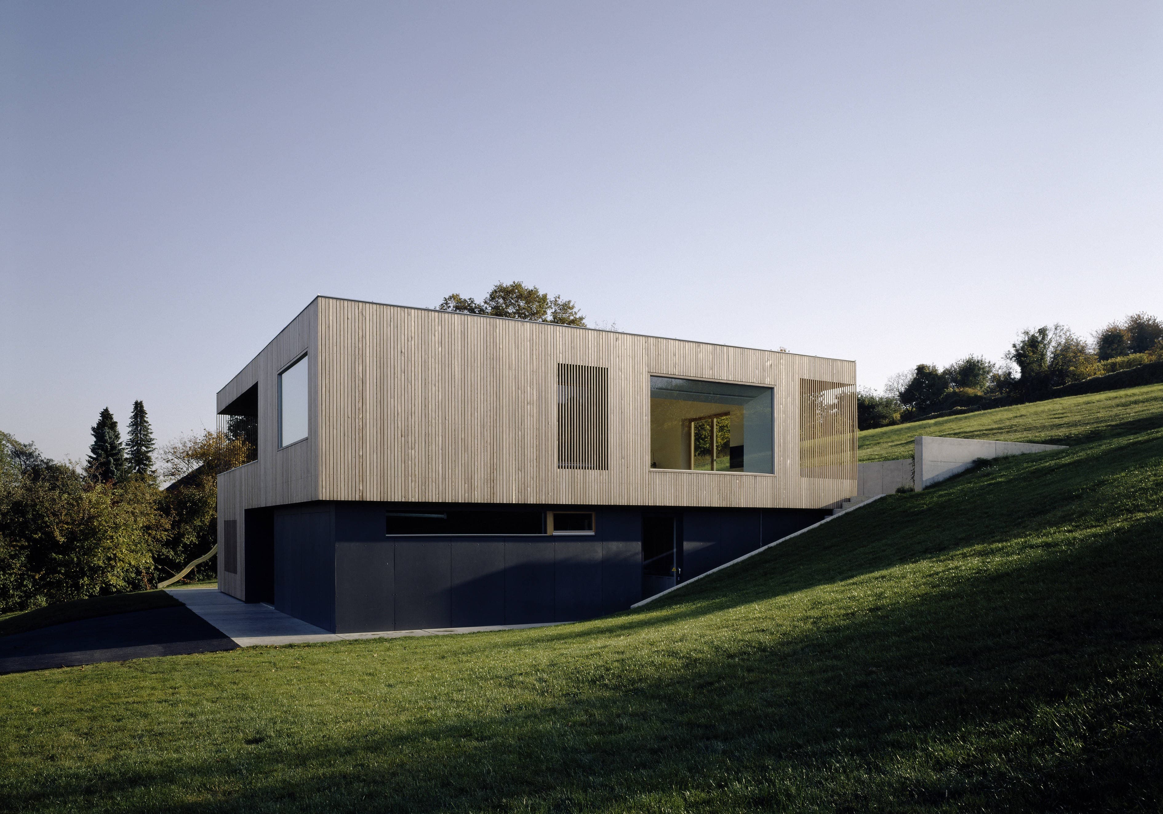 Sanft, aber massiv in den nordseitigen Hang gegraben, erhebt sich das Obergeschoss in Holz über die Weinberge von Niederösterreich. Die Terrassen und der Pool lassen den Wohnraum mit der Landschaft verschmelzen. Schlicht und echt die Materialisierung, sowohl im Hanggeschoss mit Eingang, Kinderzimmern und Nebenräumen, als auch im Obergeschoss mit Aufenthaltsräumen der Bauherren.