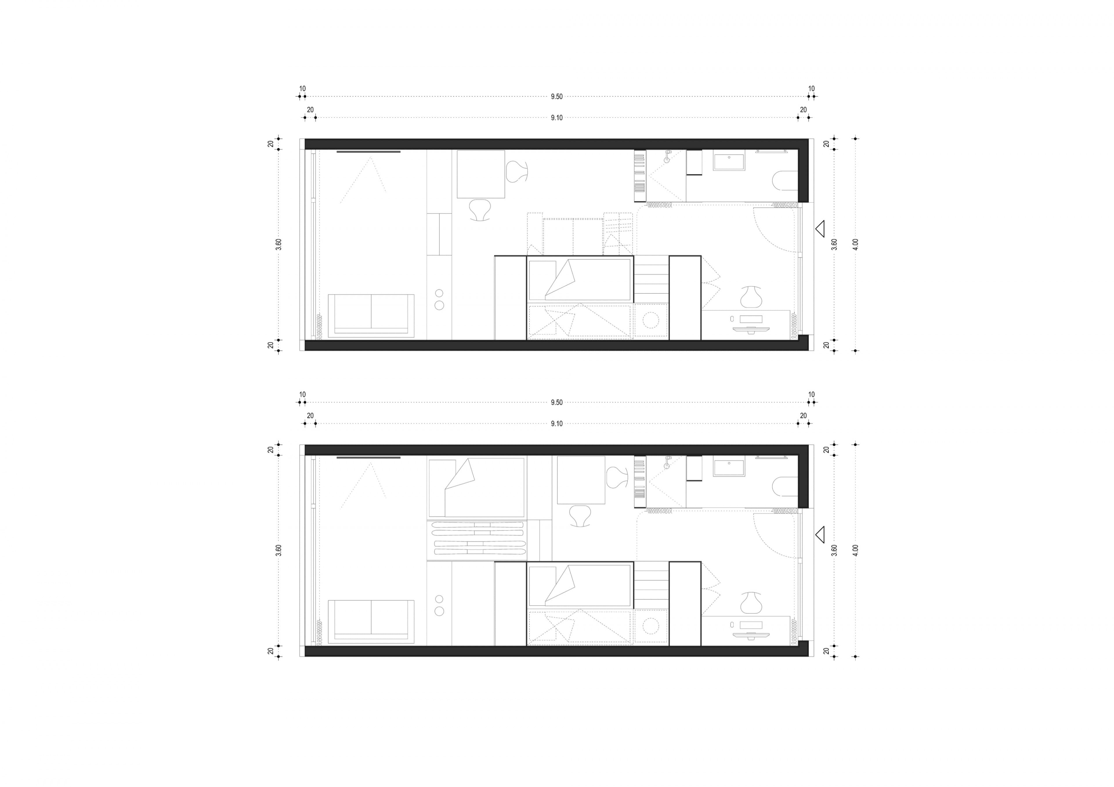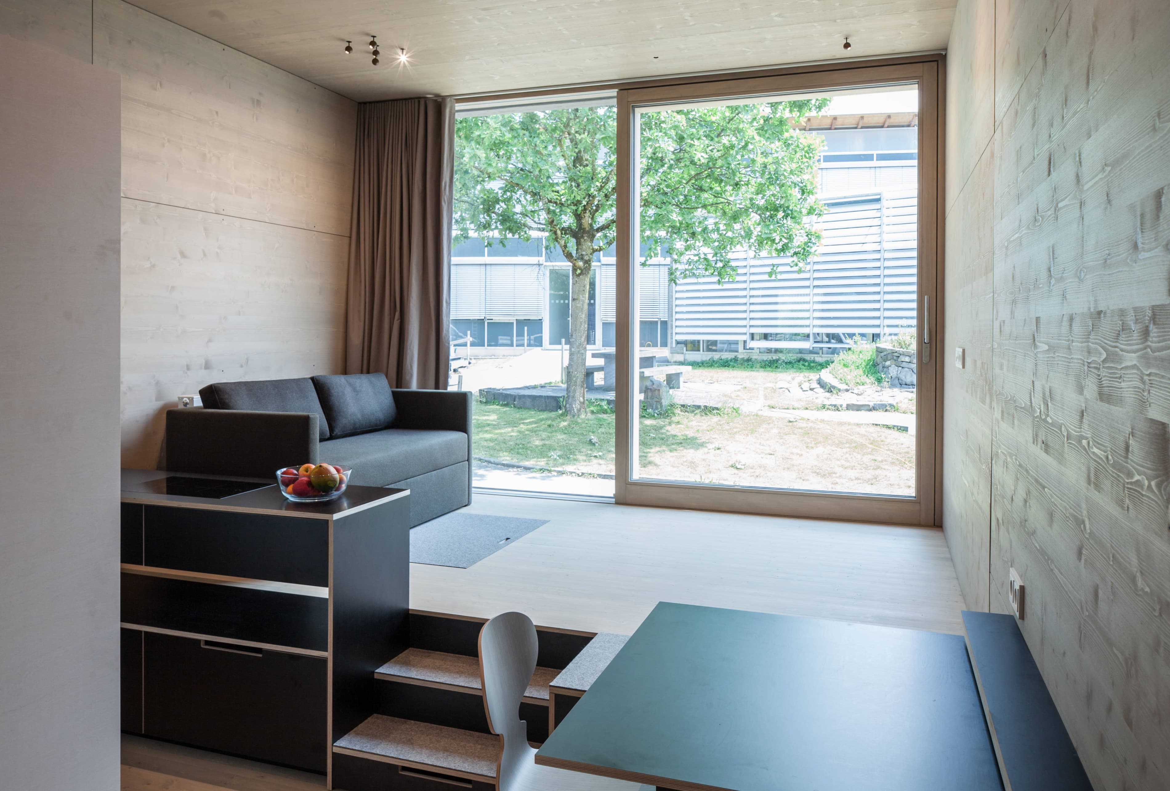 K33 ist sowohl als Einzelgebäude einsetzbar, zeigt aber bei der Stapelung von vielen Modulen seine wahre Stärke. Das längliche Modul ist an beiden Schmalseiten belichtet, somit gibt es einen privaten Freiraum beim Wohnzimmer und einen kommunikativen Freiraum beim Eingang, um mit anderen Gleichgesinnten die Erschließungszone des Gebäudes zu beleben. Konstruiert ist das modulare Gebäude in reiner Holzbauweise als Rahmenbau mit dem Ansatz, sehr wenige Materialien im Ausbau zu verwenden. Boden, Decke und Wand aus gebeizter, heimischer Fichte werden ergänzt durch Sperrholzmöbel.