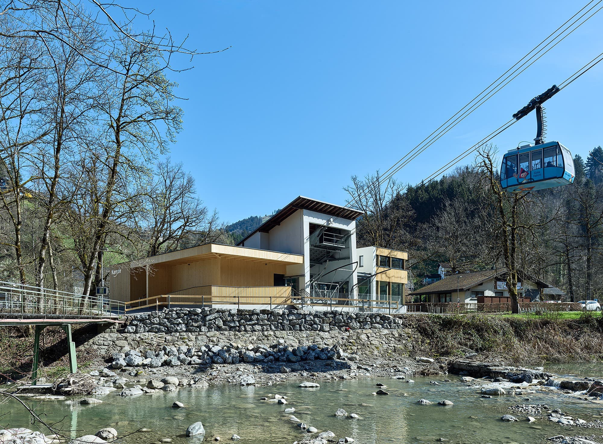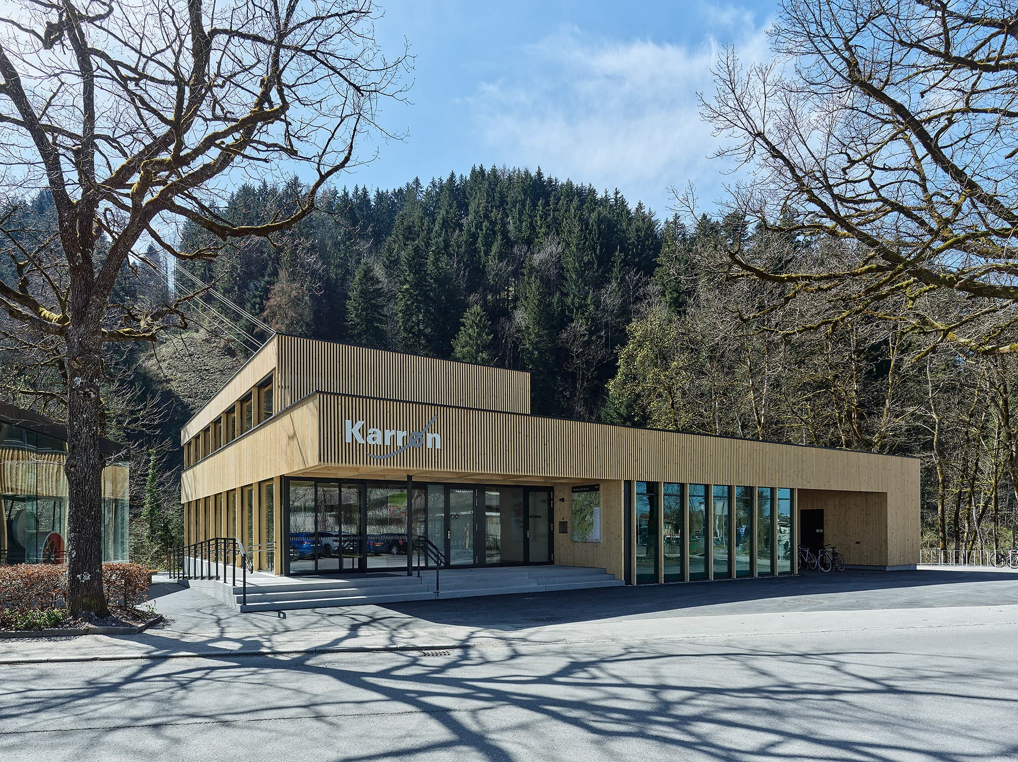Der Umbau und die Erweiterung der Talstation wurden durchgeführt, um diese für die aktuellen und zukünftigen Anforderungen zu rüsten. Als beliebte Attraktion ist die Seilbahn ganzjährig in Betrieb, weshalb eine kurze Bauzeit von nur drei Monaten ein entscheidendes Kriterium in der Planung war. Besonderer Wert wurde daraufgelegt, den Bestand weitestgehend zu erhalten und durch gezielte Anbauten in Holzbauweise sinnvoll zu ergänzen. Die Eingangshalle mit Kassen- und Wartebereich wurde erweitert, und im Obergeschoss entstanden Büroräume, die den modernen Arbeitsanforderungen gerecht werden. Auf der westlichen Seite der Station wurde eine Anlieferung für den Gastronomiebetrieb der Bergstation geschaffen. Zudem wurden öffentliche Toiletten sowie überdachte Fahrradabstellplätze eingerichtet. Die bestehende Teilunterkellerung wird heute als Fläche für Personal- und Technikräume genutzt.