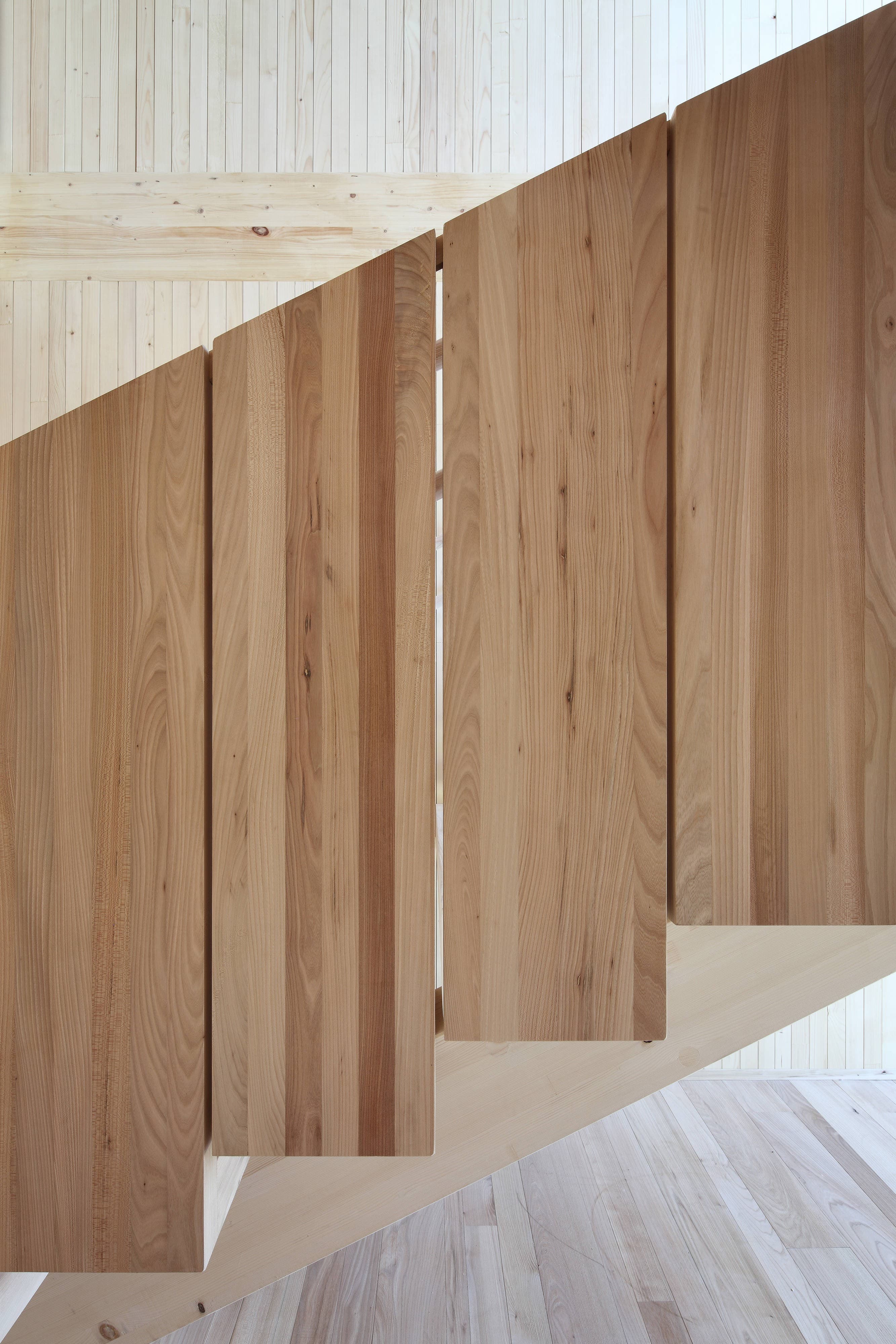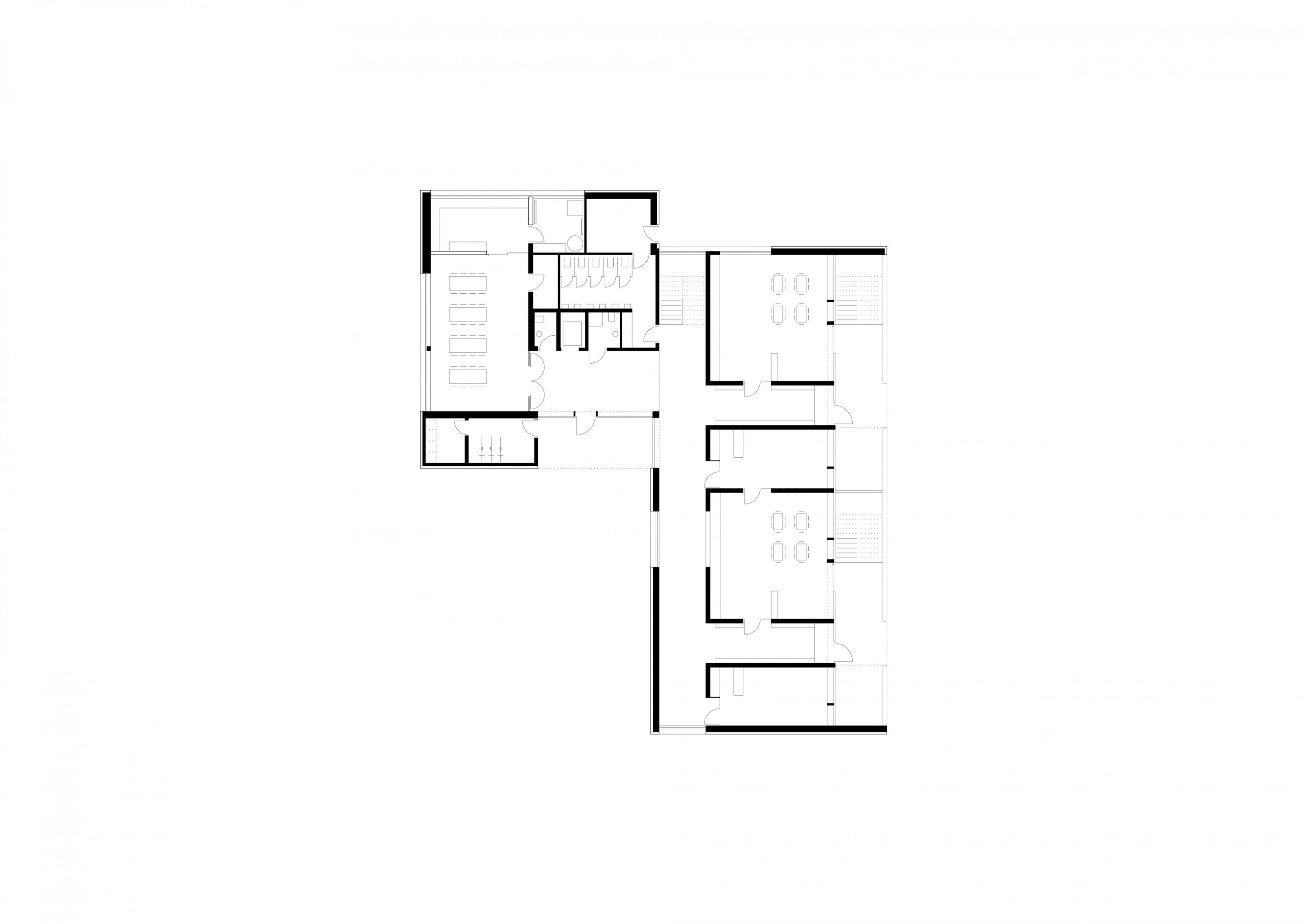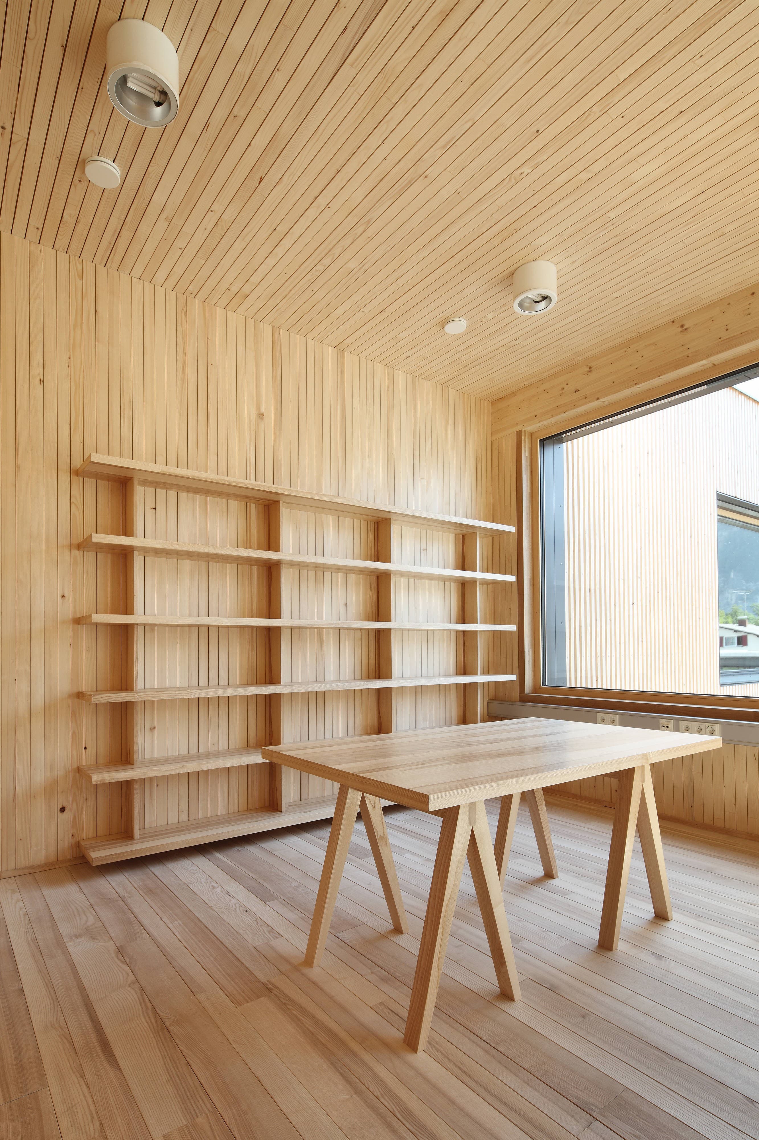 Der Baukörper besteht im Grunde aus zwei Quadern die zueinander verschoben sind. Dadurch ist es möglich einen respektvollen Abstand zu den Klassenzimmern der Schule zu wahren, gleichzeitig entsteht ein gefasster Außenraum mit definiertem Eingang.