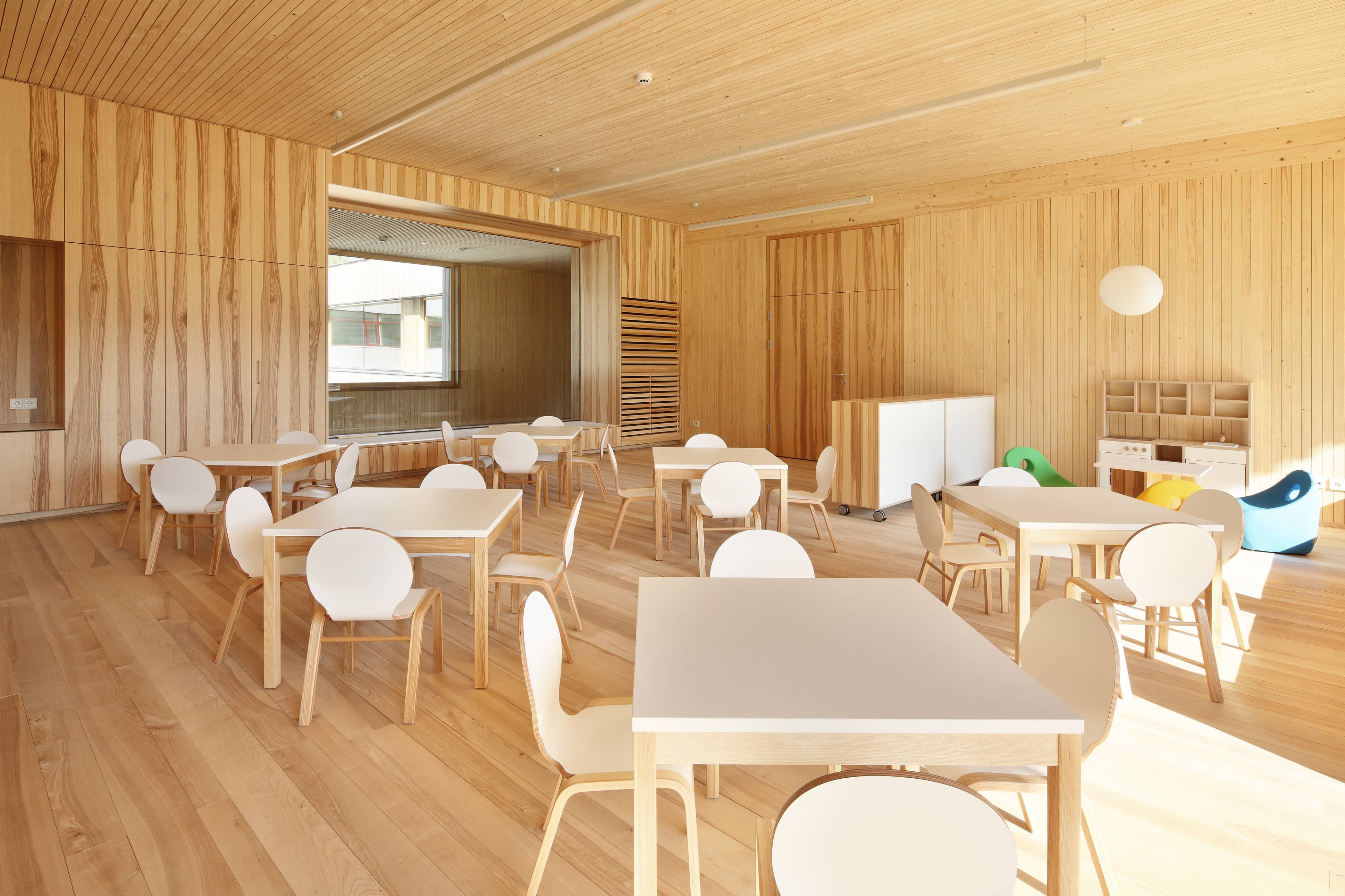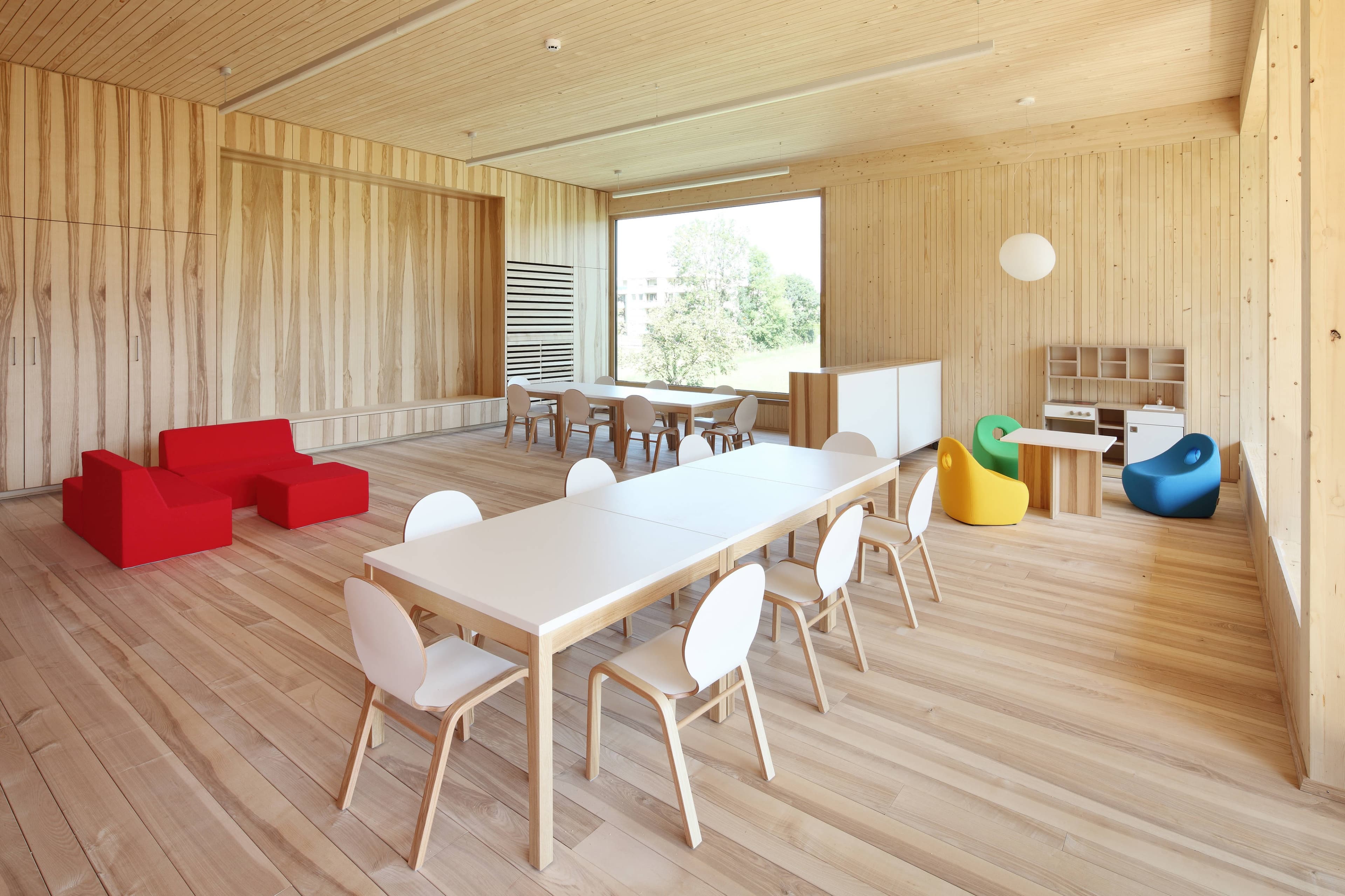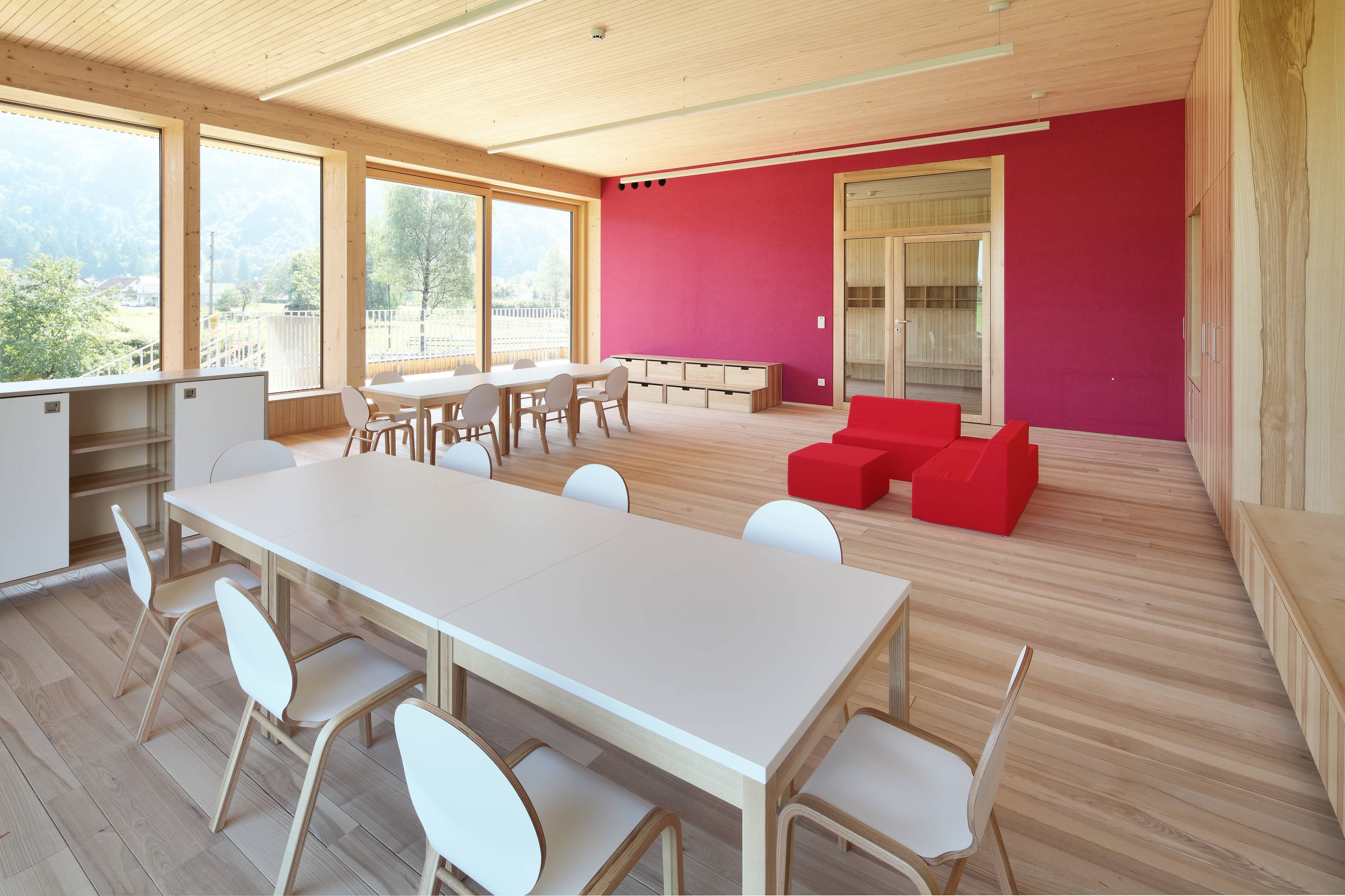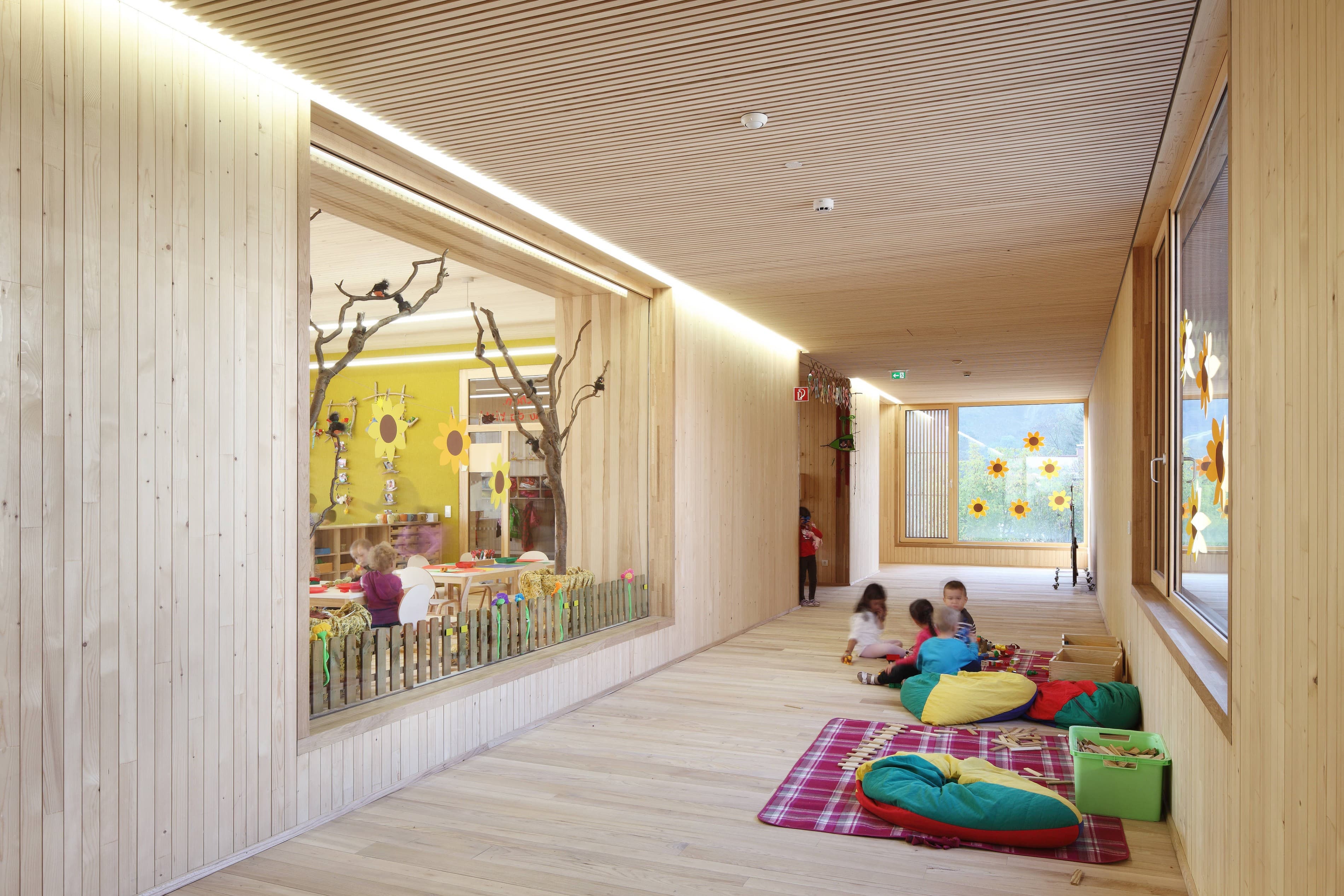 Die Gruppencluster organisieren sich um den zentralen Garderobenbereich, von dem aus der Gruppenraum, der Ausweichraum sowie der überdachte Außenbereich erreichbar sind. Über außen liegende Stiegen im Bereich der Überdachung wird auch den Gruppen im Obergeschoss der direkte Gartenzugang ermöglicht. Die Gruppenräume sind zu den überdachten Außenbereichen großzügig verglast, mit den gegenüberliegenden Oberlichtern wird eine angenehme Belichtungssituation geschaffen.