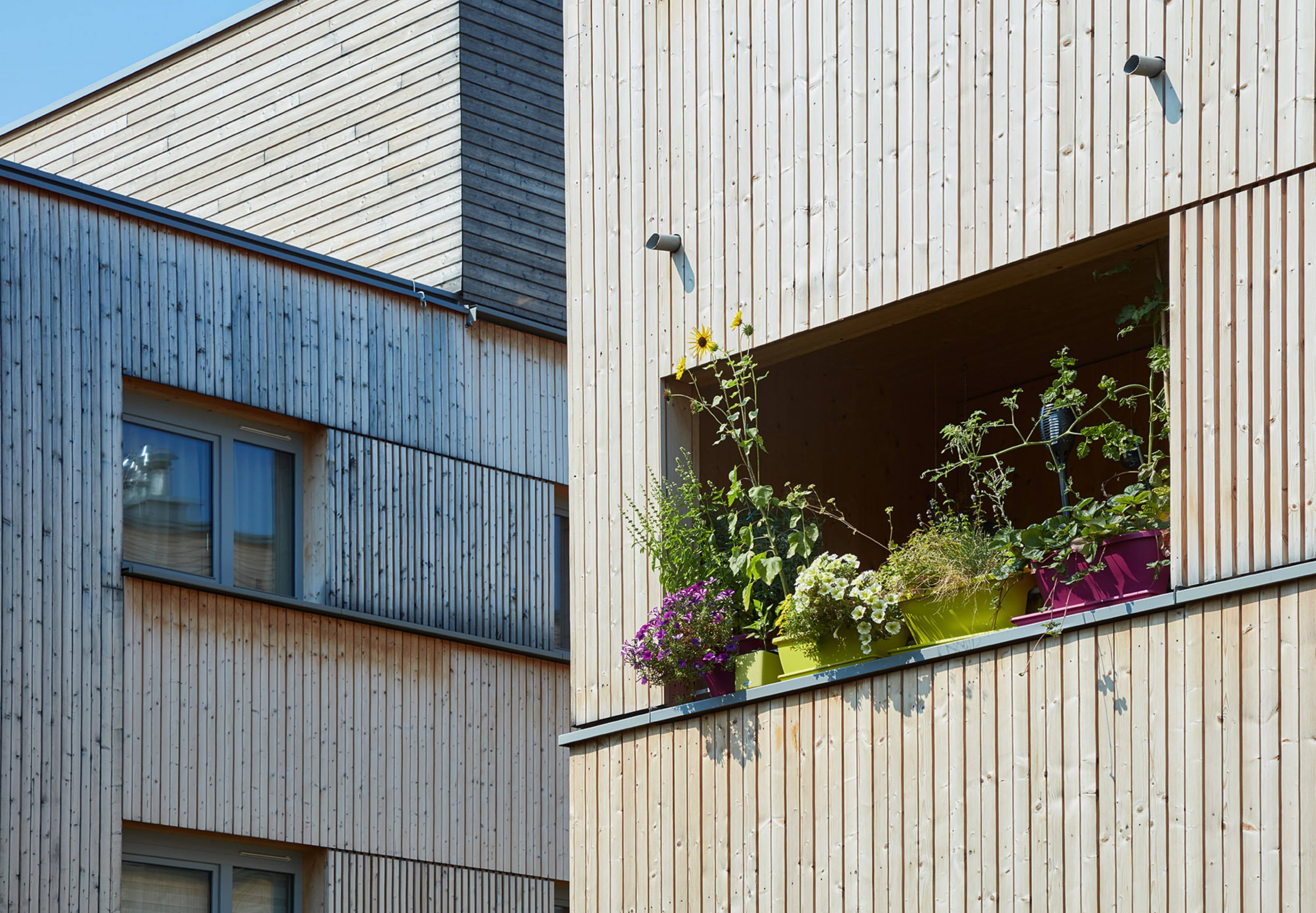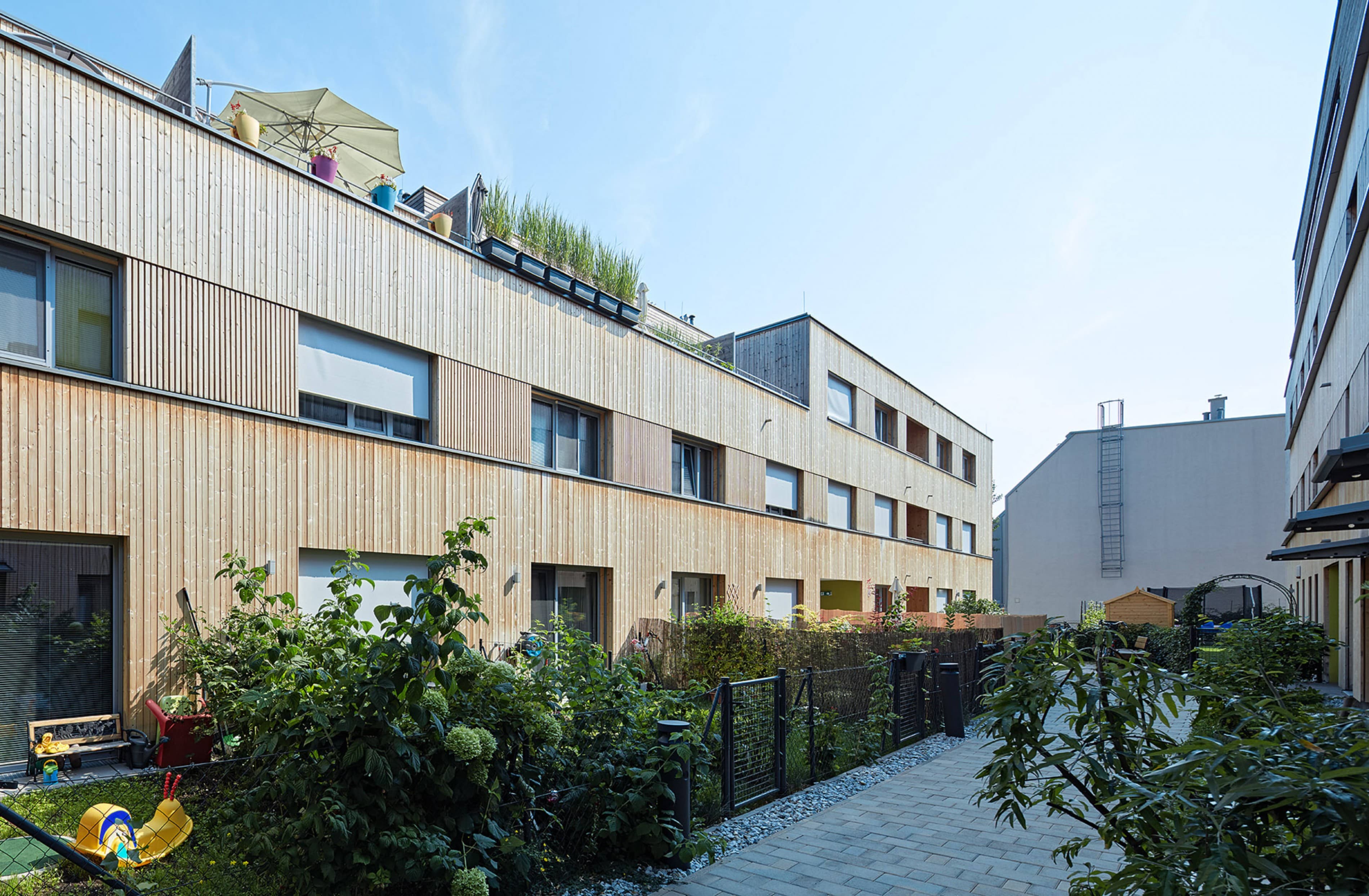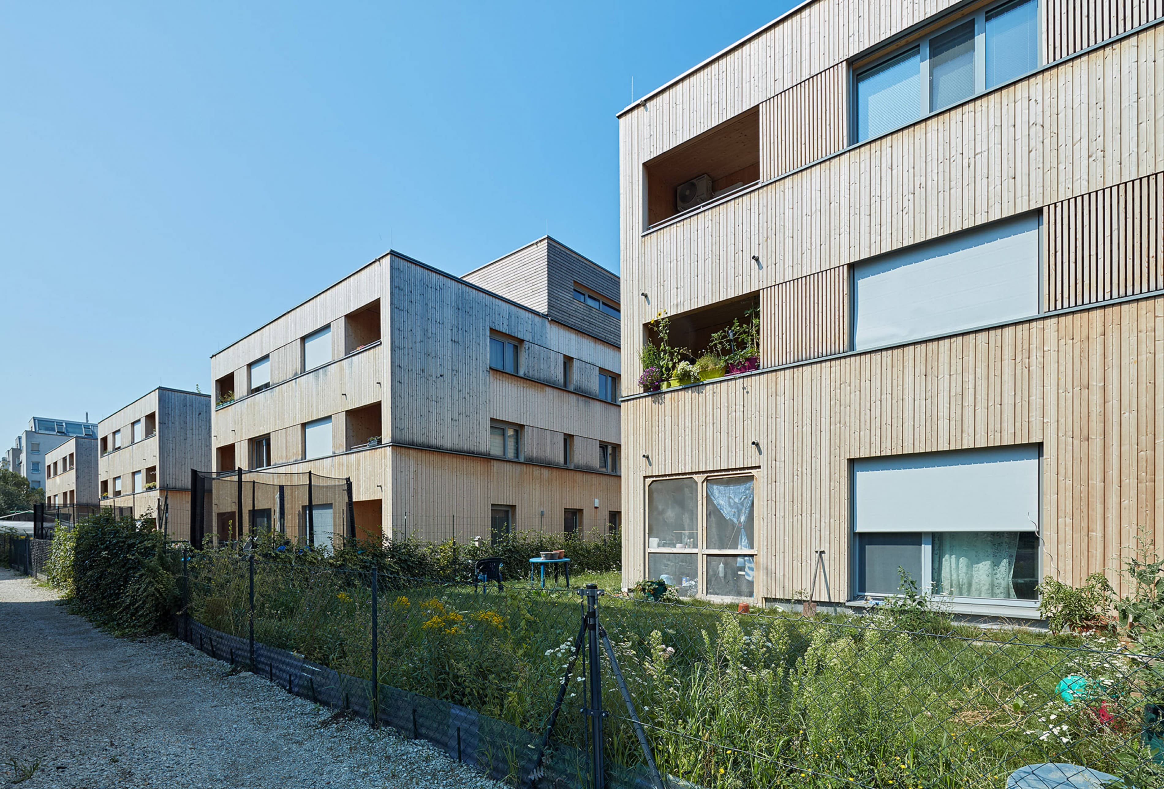 Die städtebauliche Struktur des Gebietes ist geprägt von zeilenartigen Bebauungen. Die vier Häuser nehmen dieses Thema auf und führen es weiter. Den Erdgeschosswohnungen sind Gärten vorgelagert, welche den halböffentlichen vom privaten Raum trennen. Dadurch entstehen in der Erdgeschosszone offene Kommunikationsräume und ein differenzierter, geschichteter Übergang zwischen dem öffentlichen Raum bis hin zur privaten Wohnung. Holz als Bauelement bleibt bewusst im Innen- als auch Außenbereich sichtbar. Dies schafft neben den ökonomischen und ökologischen Vorteilen eine angenehme Wohnatmosphäre und macht den Grundbaustoff sichtbar.