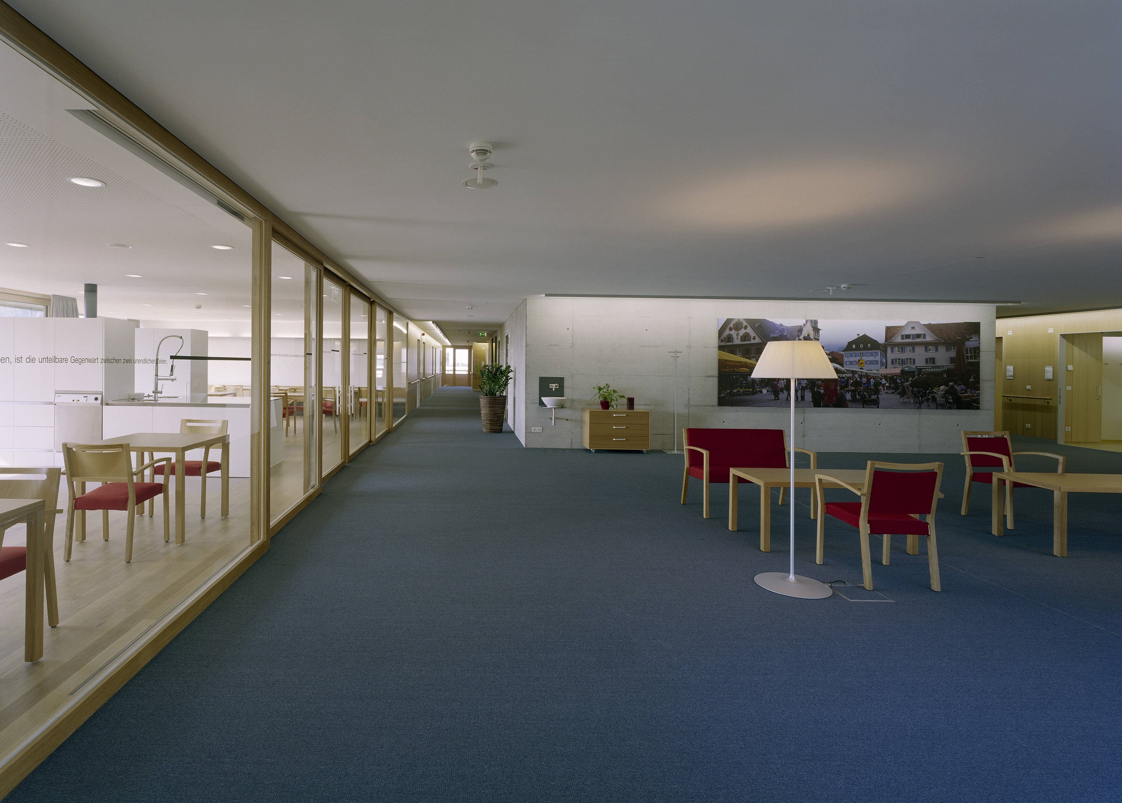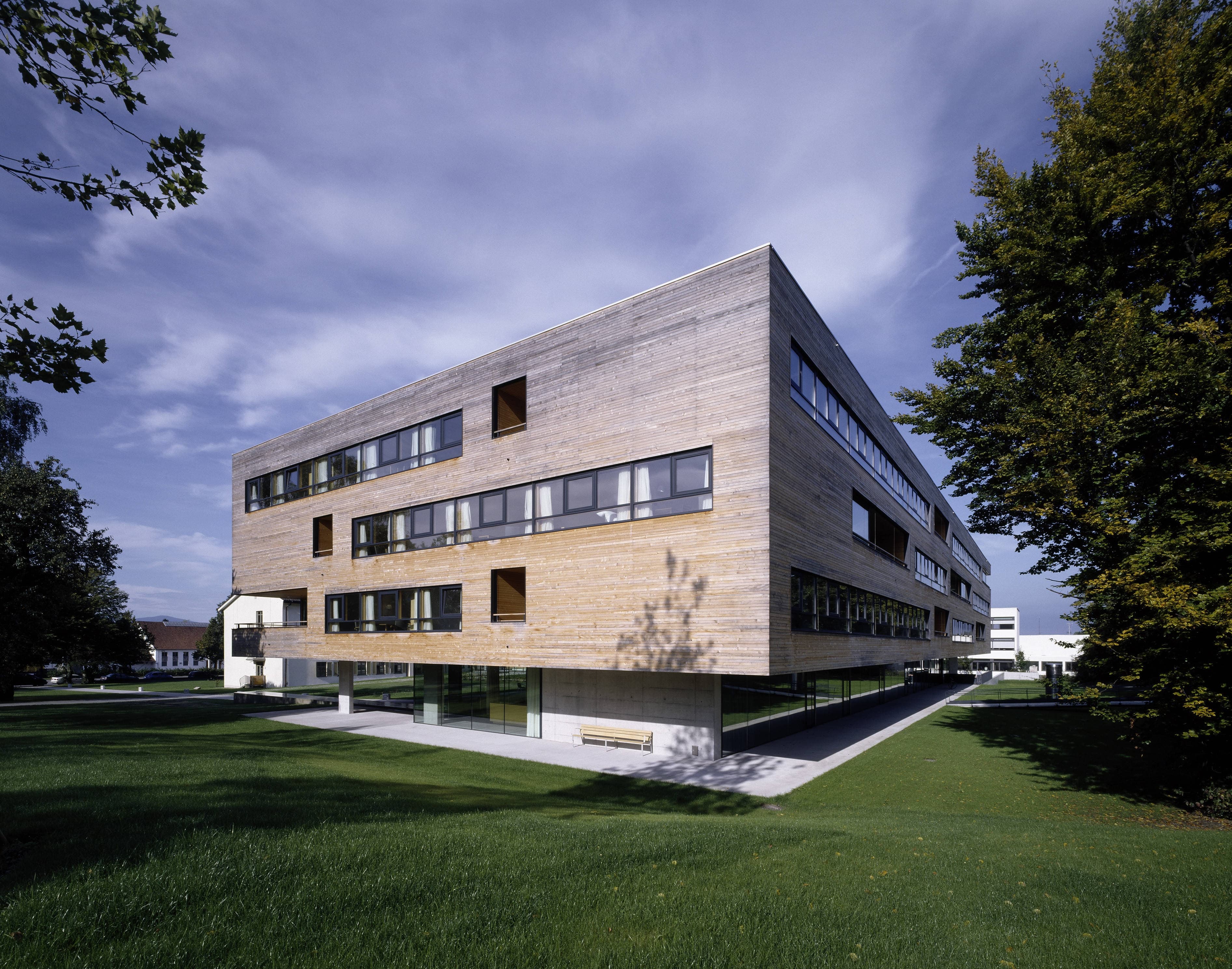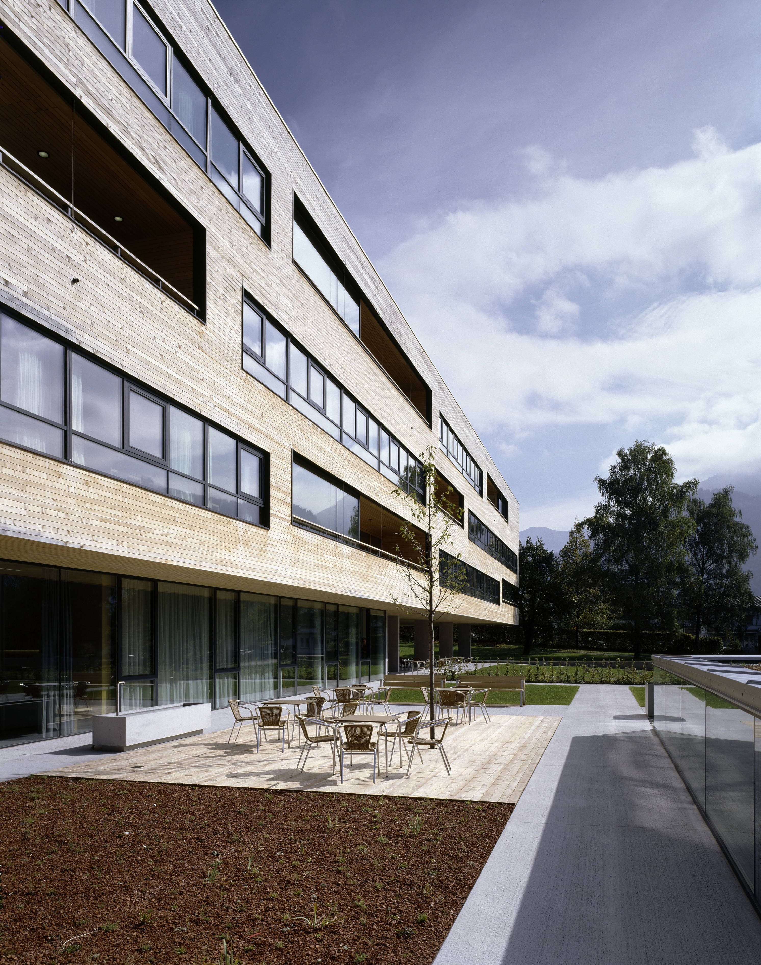 Pflegeheim mit 107 Zimmern, in einem parkähnlichen Grünraum entlang der Dornbirner Ache. Auf einem gläsernen Erdgeschoss (Eingang, Verwaltung, Kapelle, Mehrzweckräume und Dementenstation) schwebt ein dreigeschossiger Holzkubus. Die eingezogenen Loggien der versetzt angeordneten Aufenthaltsräume bilden tiefe Kerben, die sich mit den außen bündig liegenden Fensterbändern der Zimmer abwechseln.