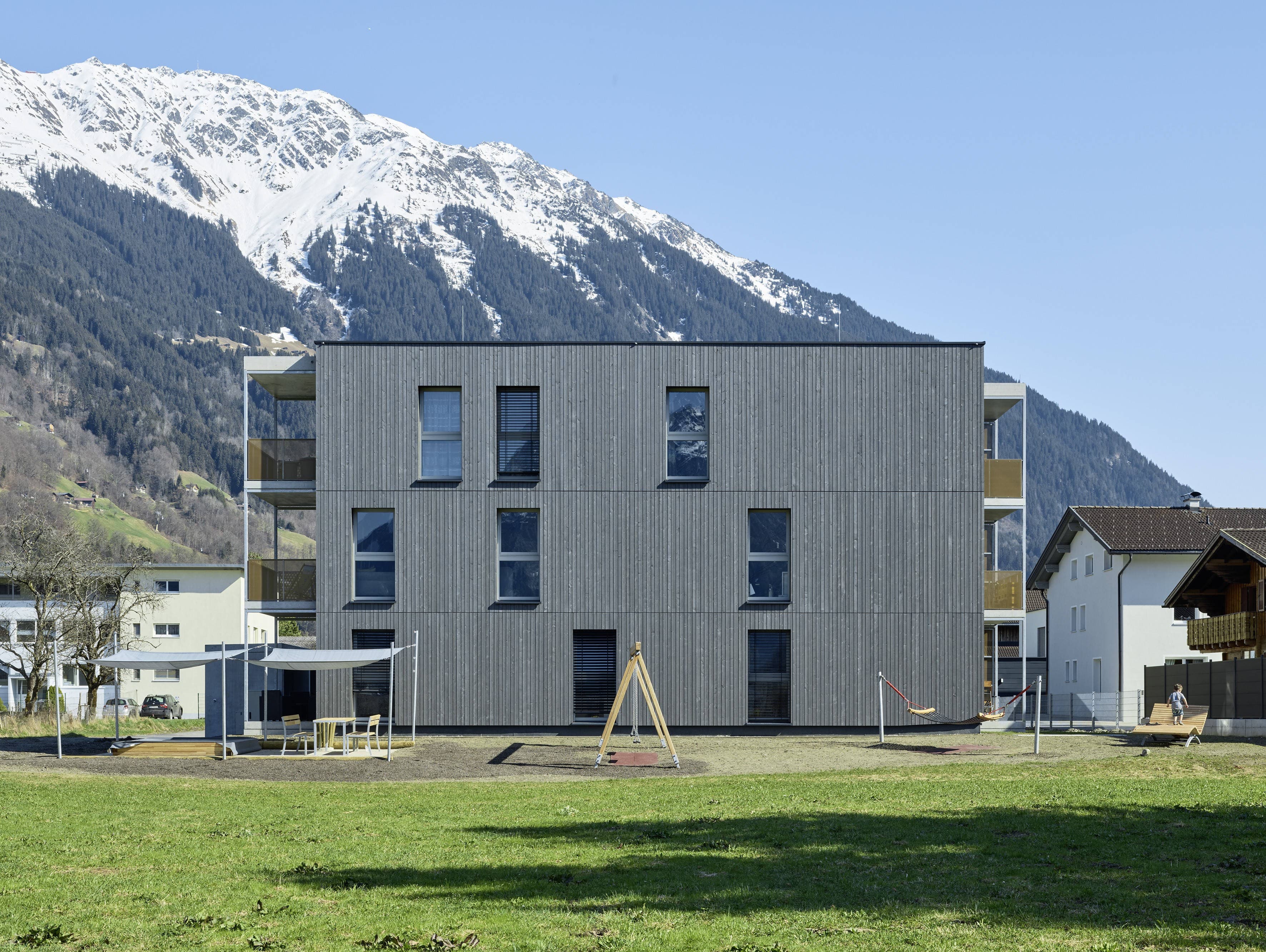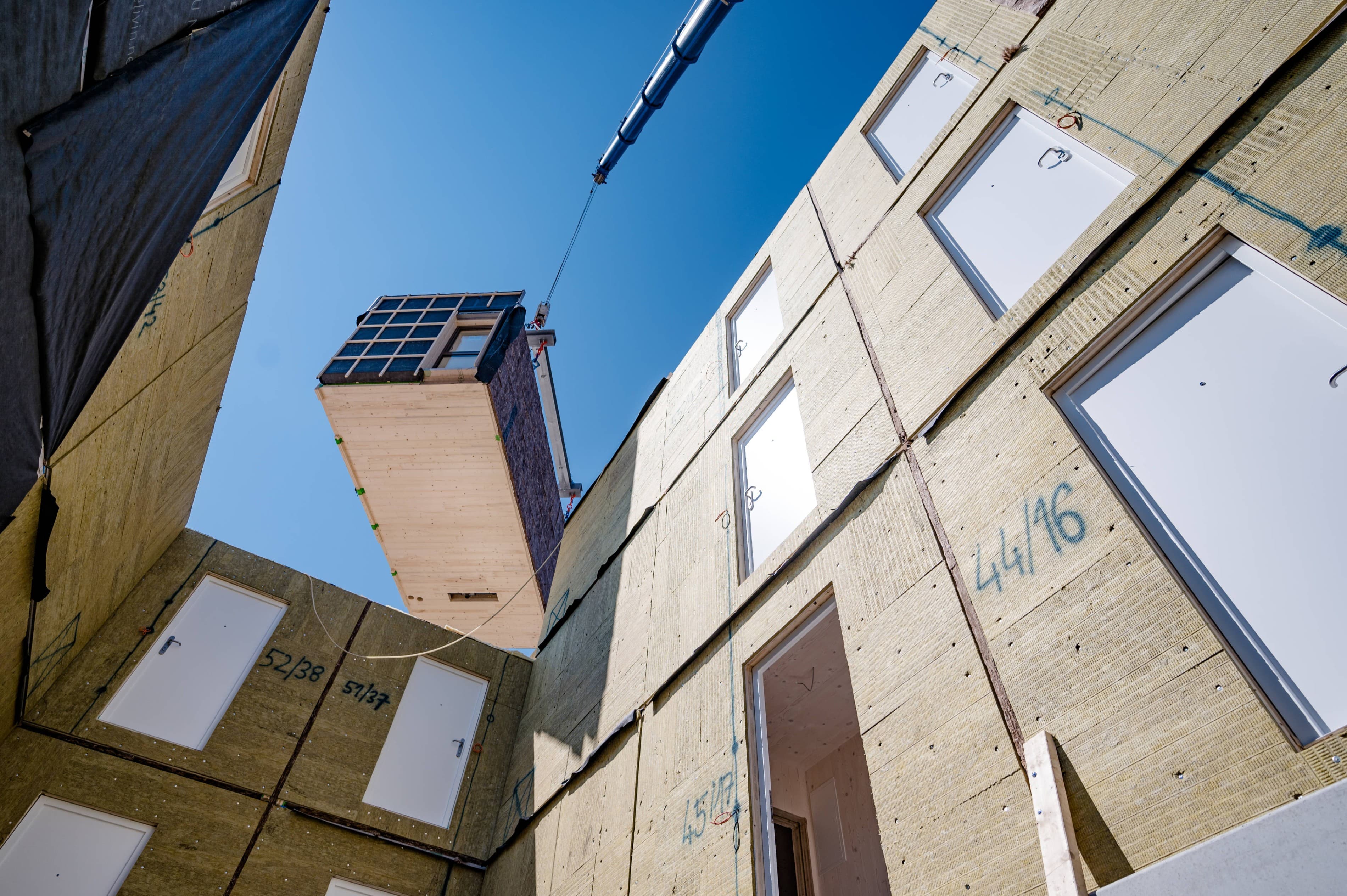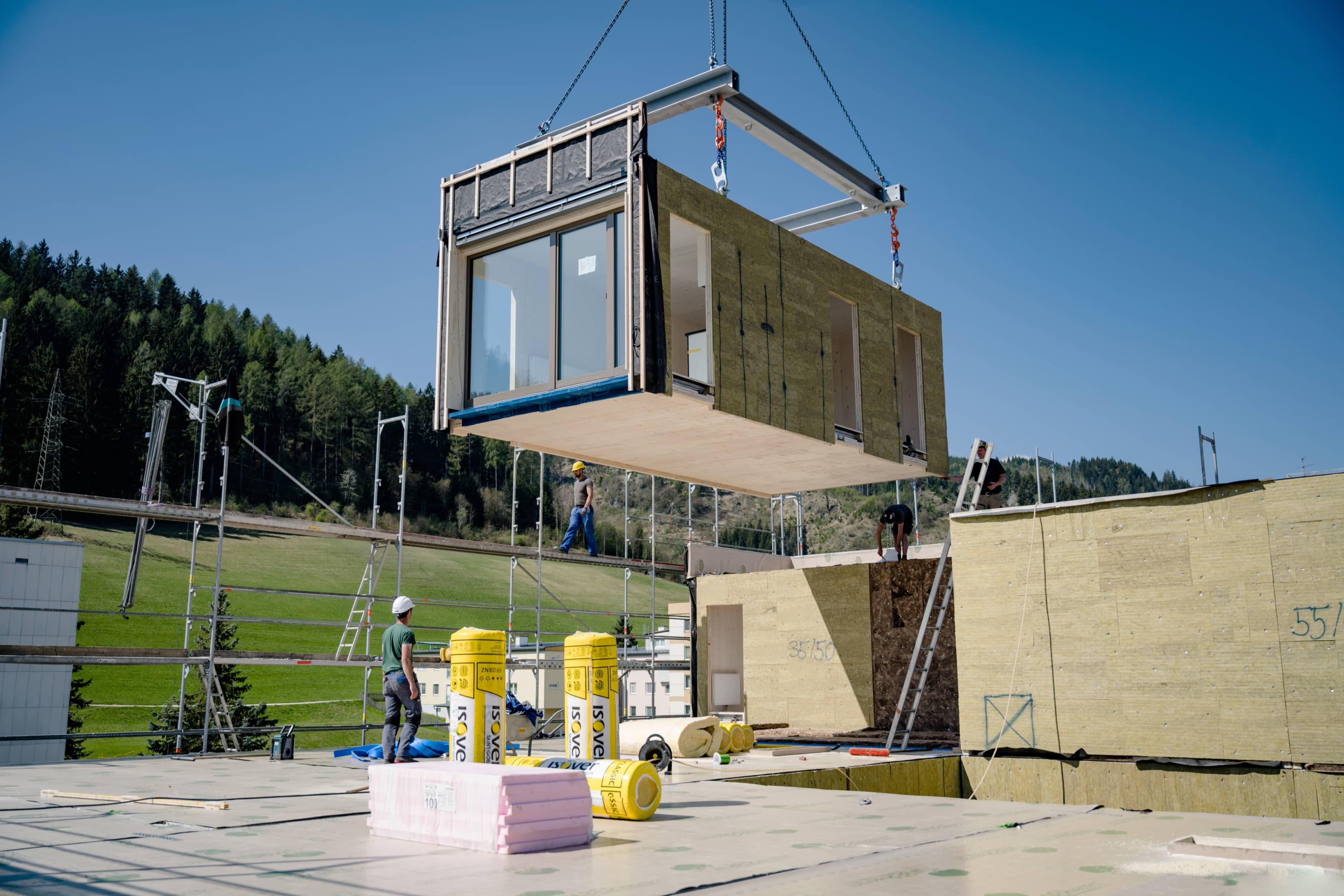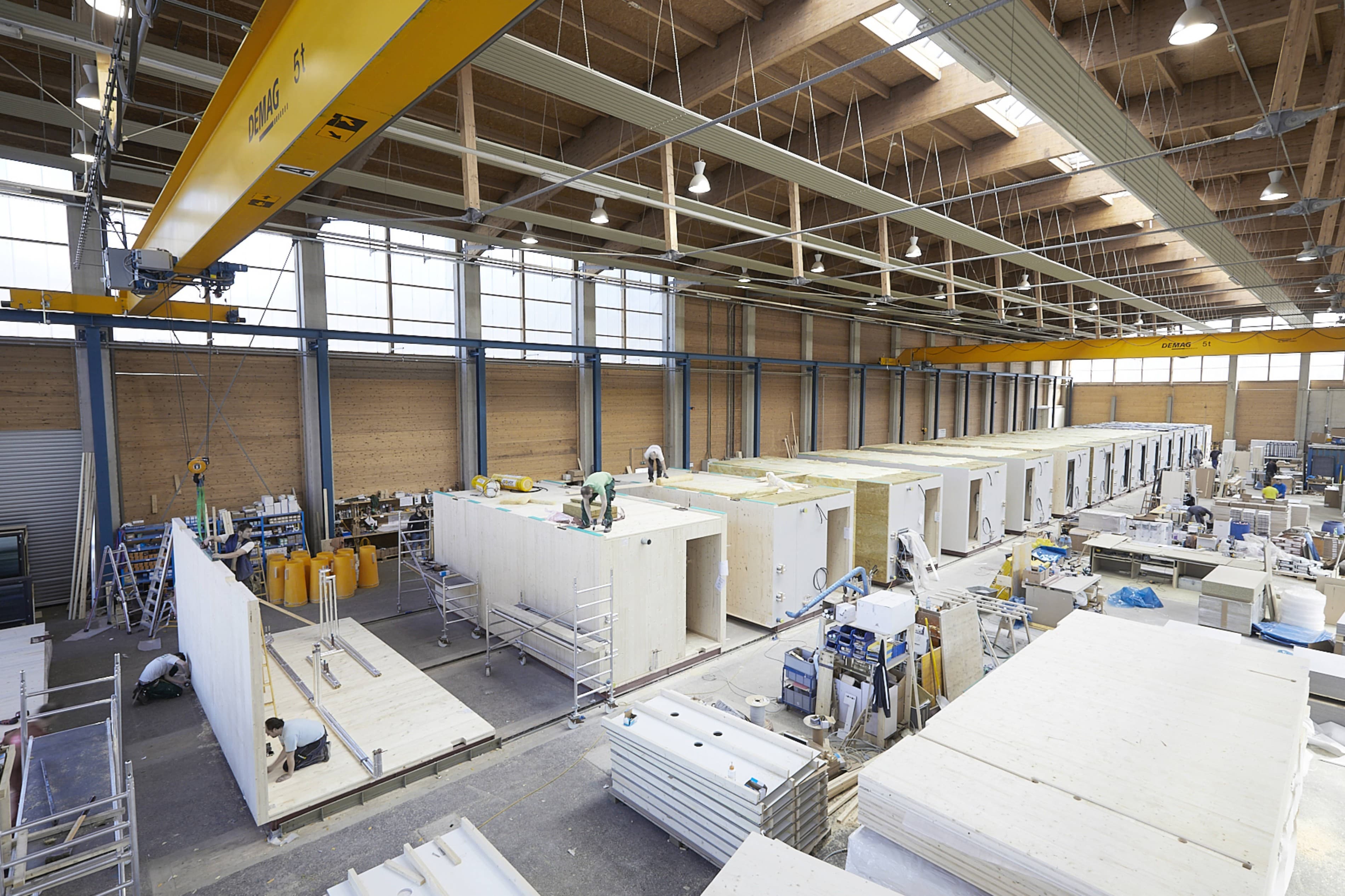Seriell vorgefertigte, komplette Raummodule aus Massivholz werden nach dem Prinzip „Plug & Play“ zu multifunktionalen, flexiblen Wohneinheiten kombiniert. Aus drei unterschiedlichen Grundmodulen lassen sich sämtliche Grundrisstypen und Wohnungsgrößen bauen.