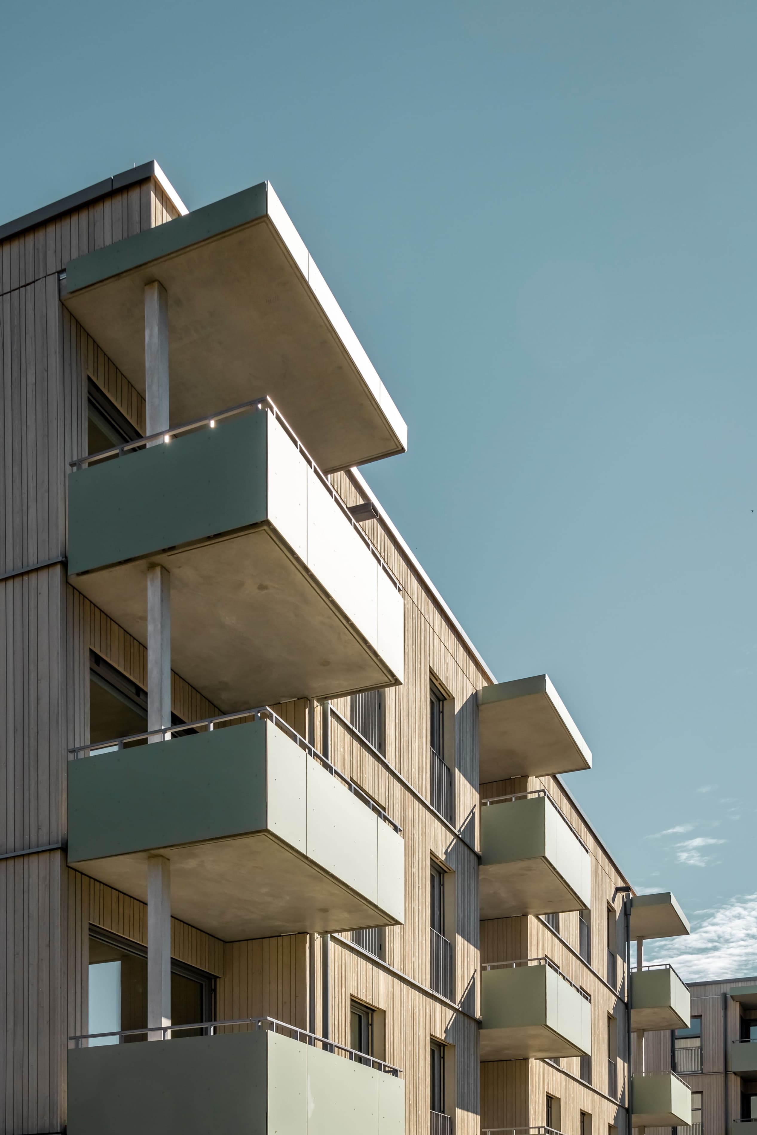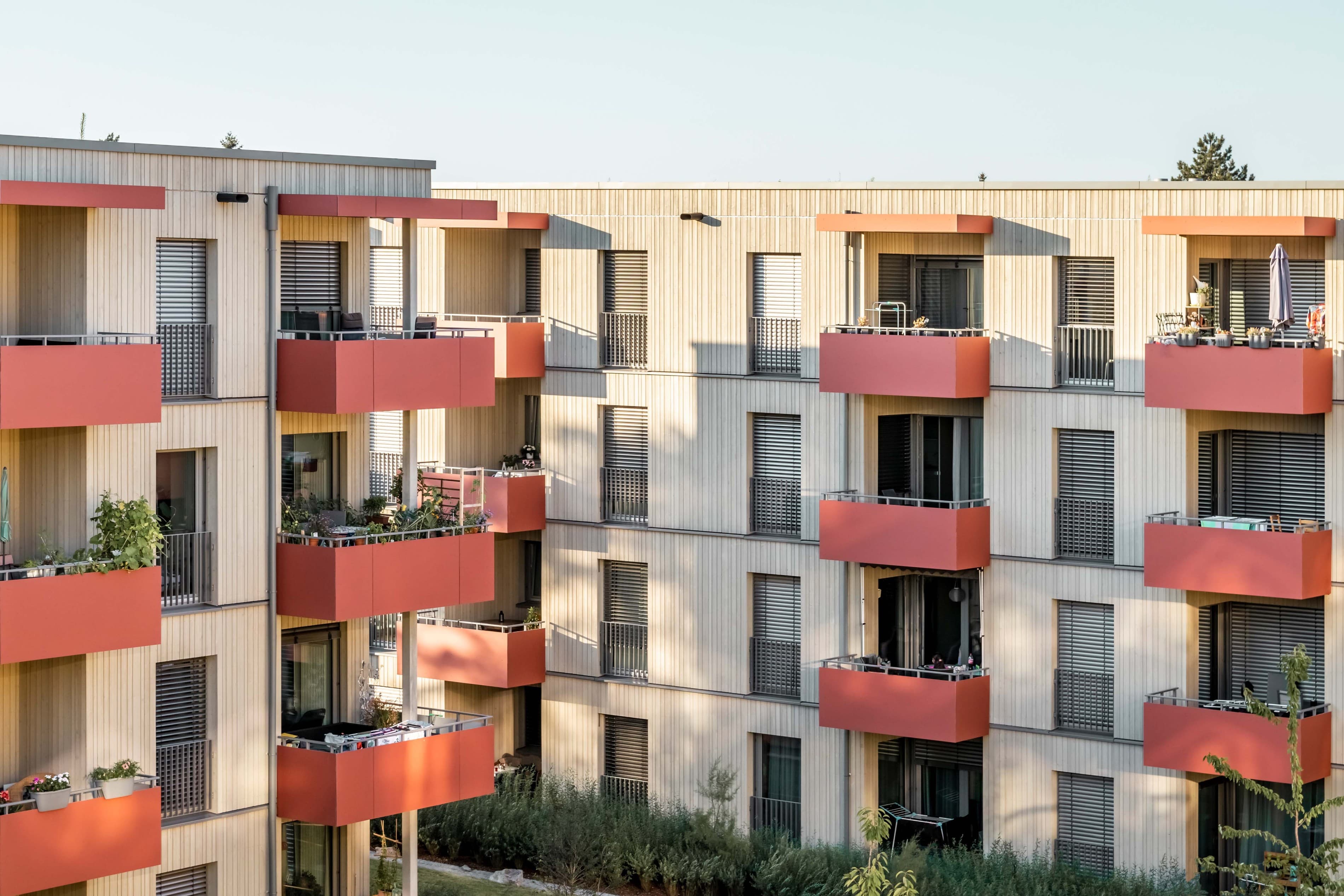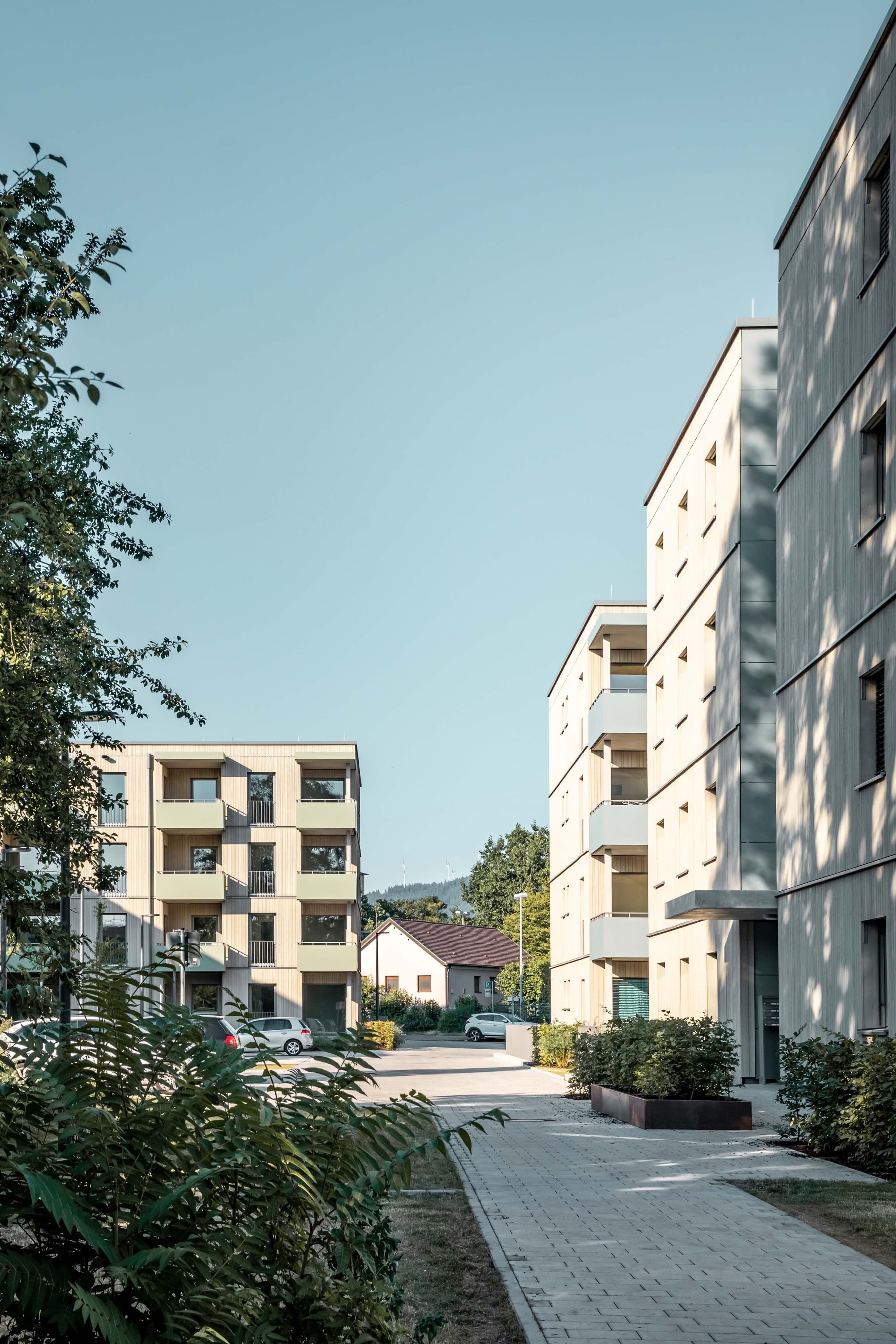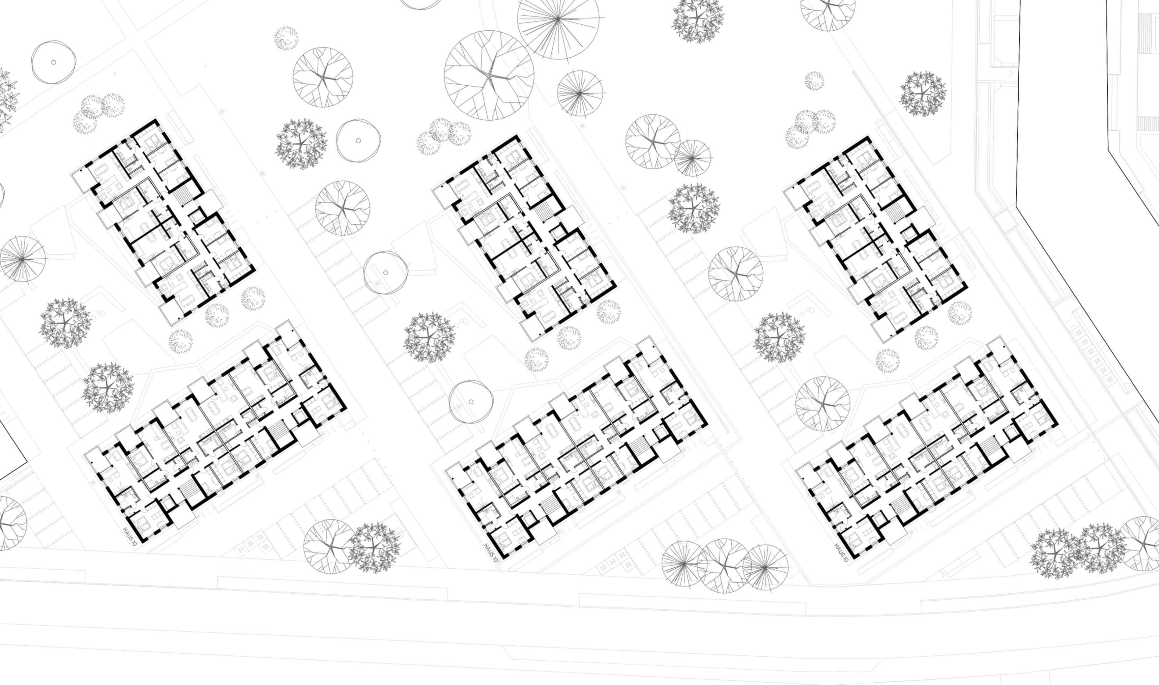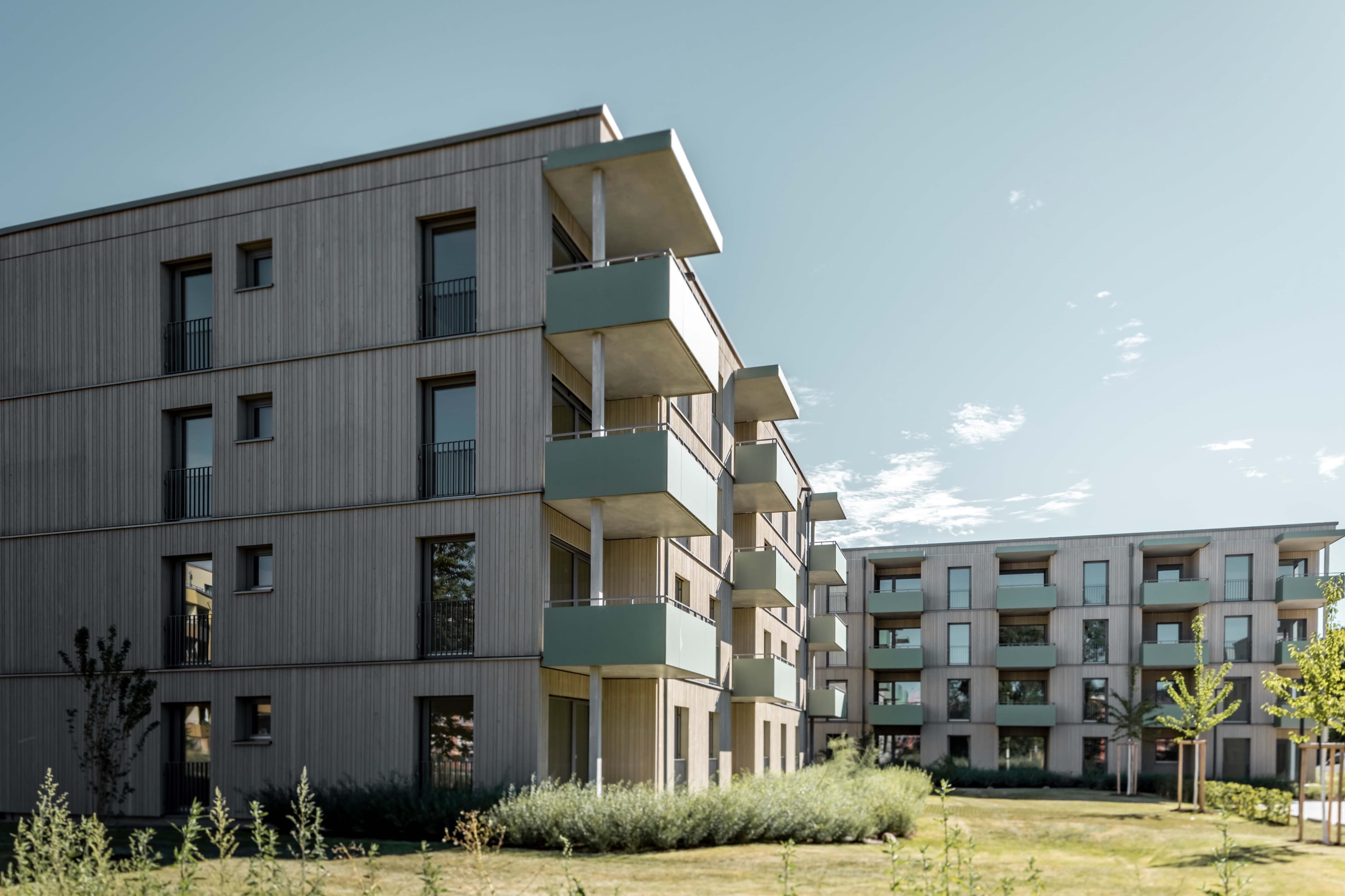 Um ein vielfältiges Wohnungsangebot zu ermöglichen, sind 3 Gebäudepaare als reine Holzbauten konzipiert. Zwei rechtwinkelig zueinanderstehende Gebäude bilden immer ein Paar mit differenzierten Wohnungsgrundrissen. Jedes dieser Gebäude ist mit einem Treppenhaus erschlossen und hat 4 exakt gleiche Regelgeschosse, was speziell beim Holzbau zu empfehlen ist. Nach intensiver Kostenbetrachtung ist dann die Wahl auf einen reinen Holzbau gefallen.