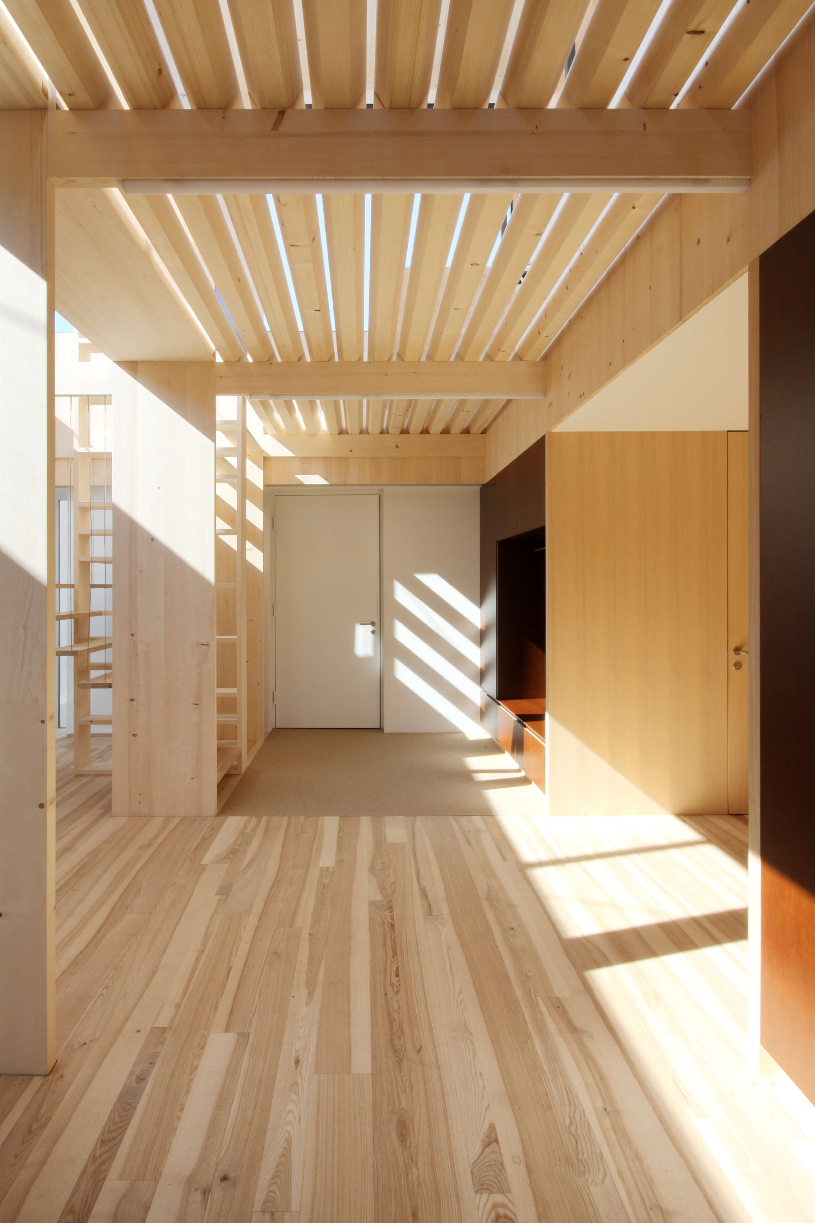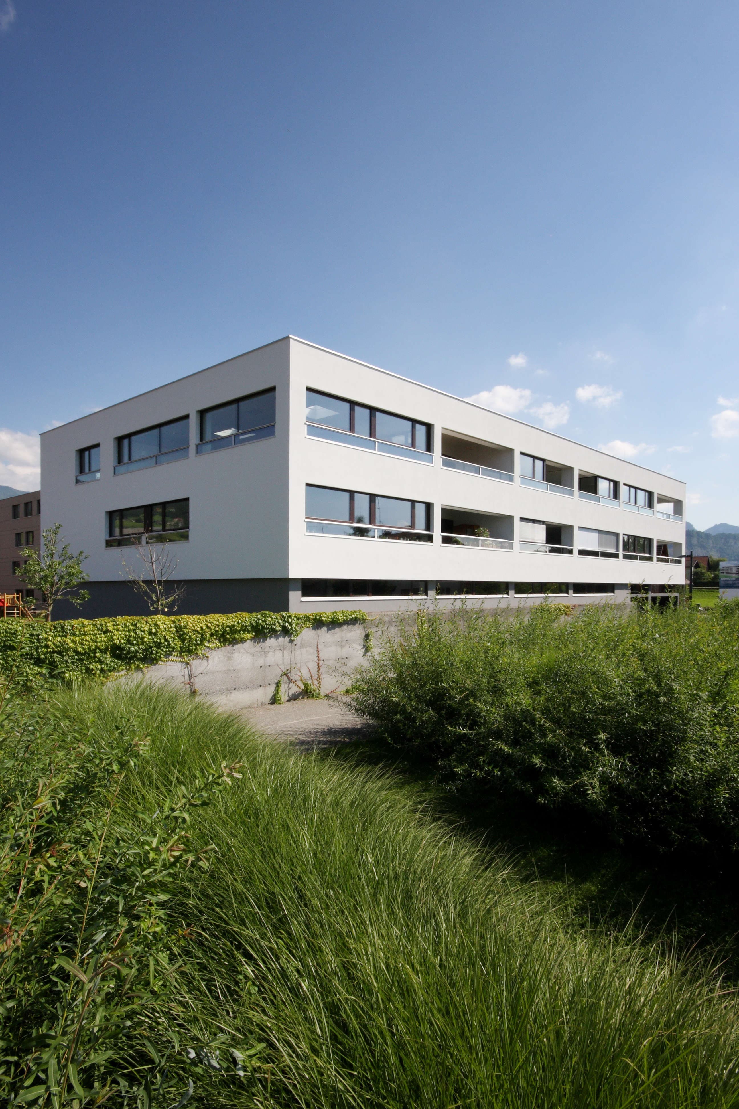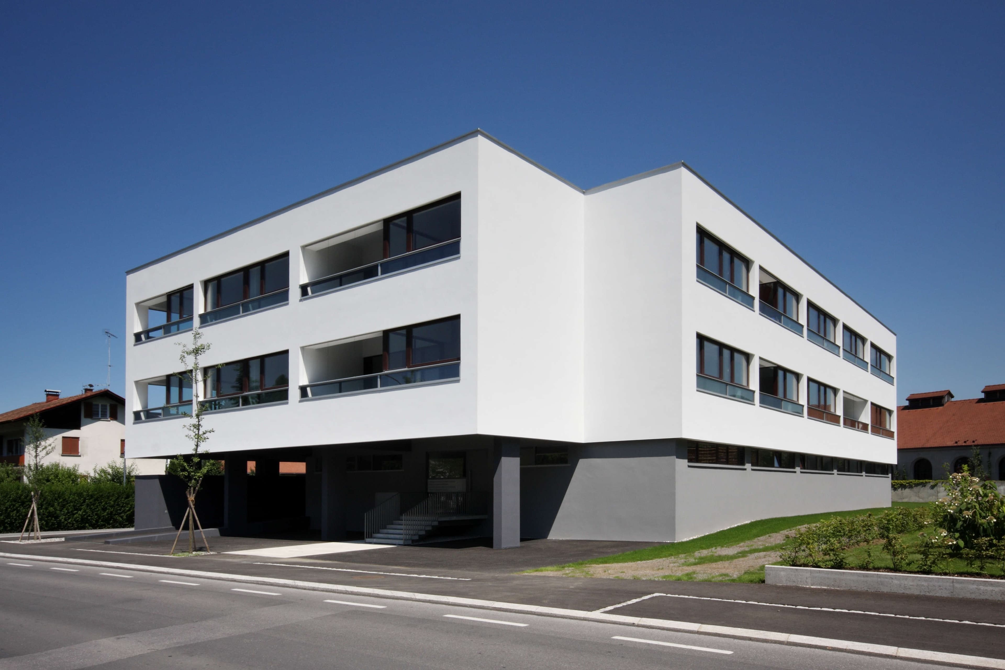 Der kompakte Baukörper, die hoch gedämmte Außenhaut mit 3-fach-verglasten Fenstern und eine luftdichte und wärmebrückenfreie Hülle machen den Einsatz einer Komfortlüftung mit Wärmerückgewinnung und Erdsonden zur Wärmegewinnung fast selbstverständlich. Auf den Eingangsbereich, die Parkgarage und Lagerräume im Erdgeschoss wurden die Wohnungen aufgesetzt.