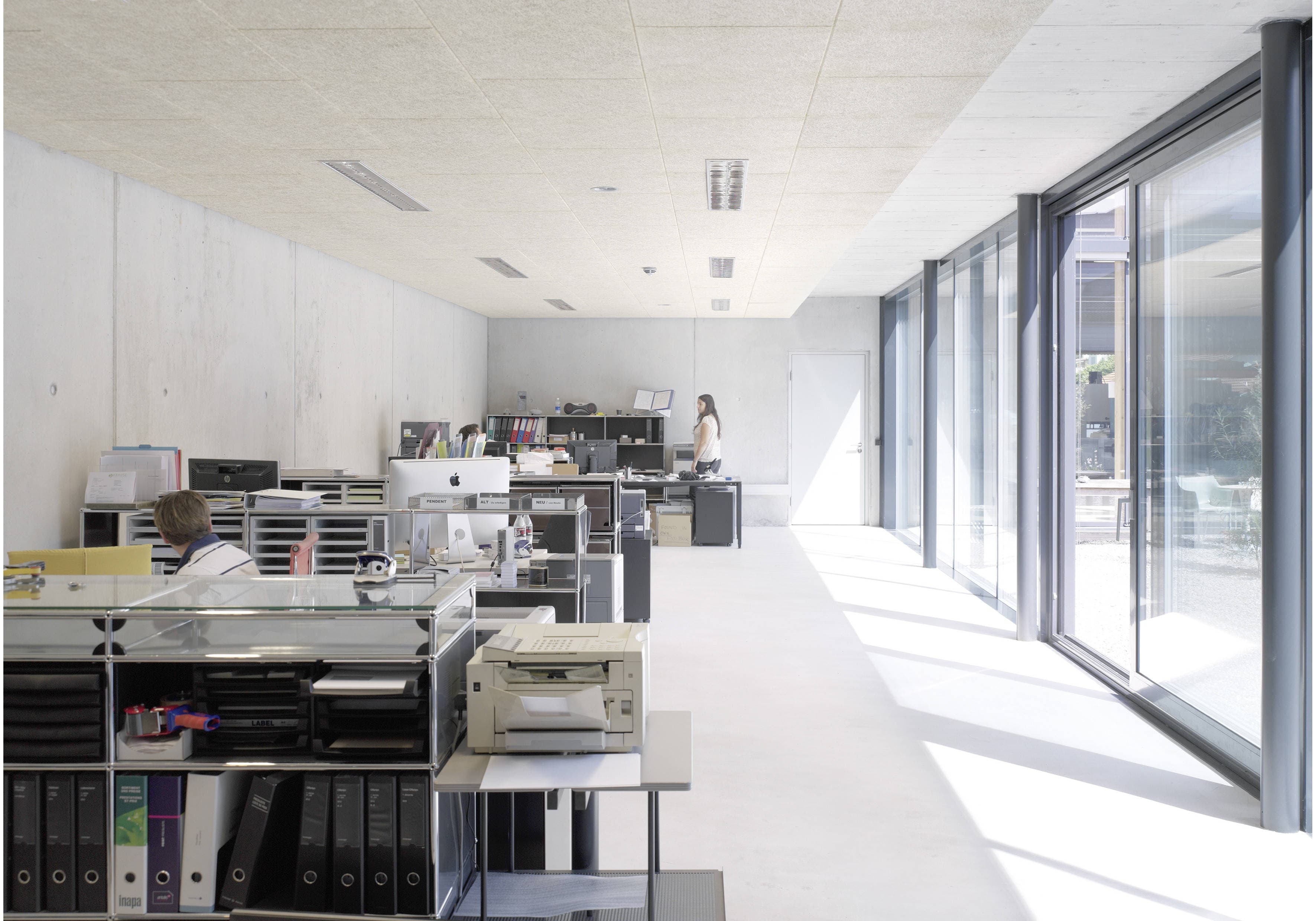 Die Bürozone ist zum Innenhof vollständig und Produktion hin teilweise verglast. Die umlaufende Produktionsfläche ist in der unteren Hälfte der Fassadenhöhe ebenfalls über weite Strecken verglast, der obere Fassadenteil ist mit Metallsandwichpaneelen ausgeführt. Die Gebäudehülle des Neubaus wurde mit einem offenen, vertikalen Holzschirm ausgeführt.