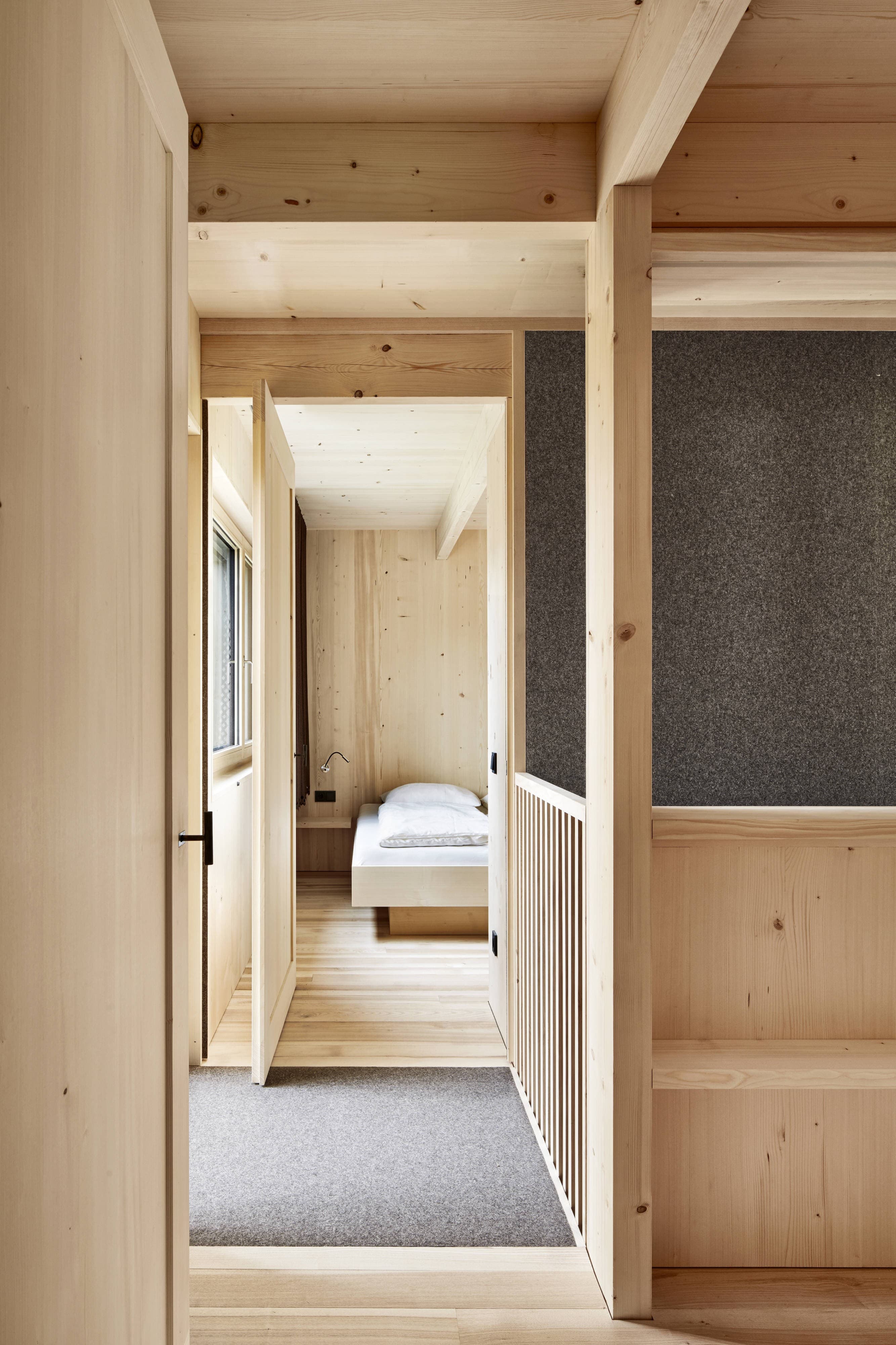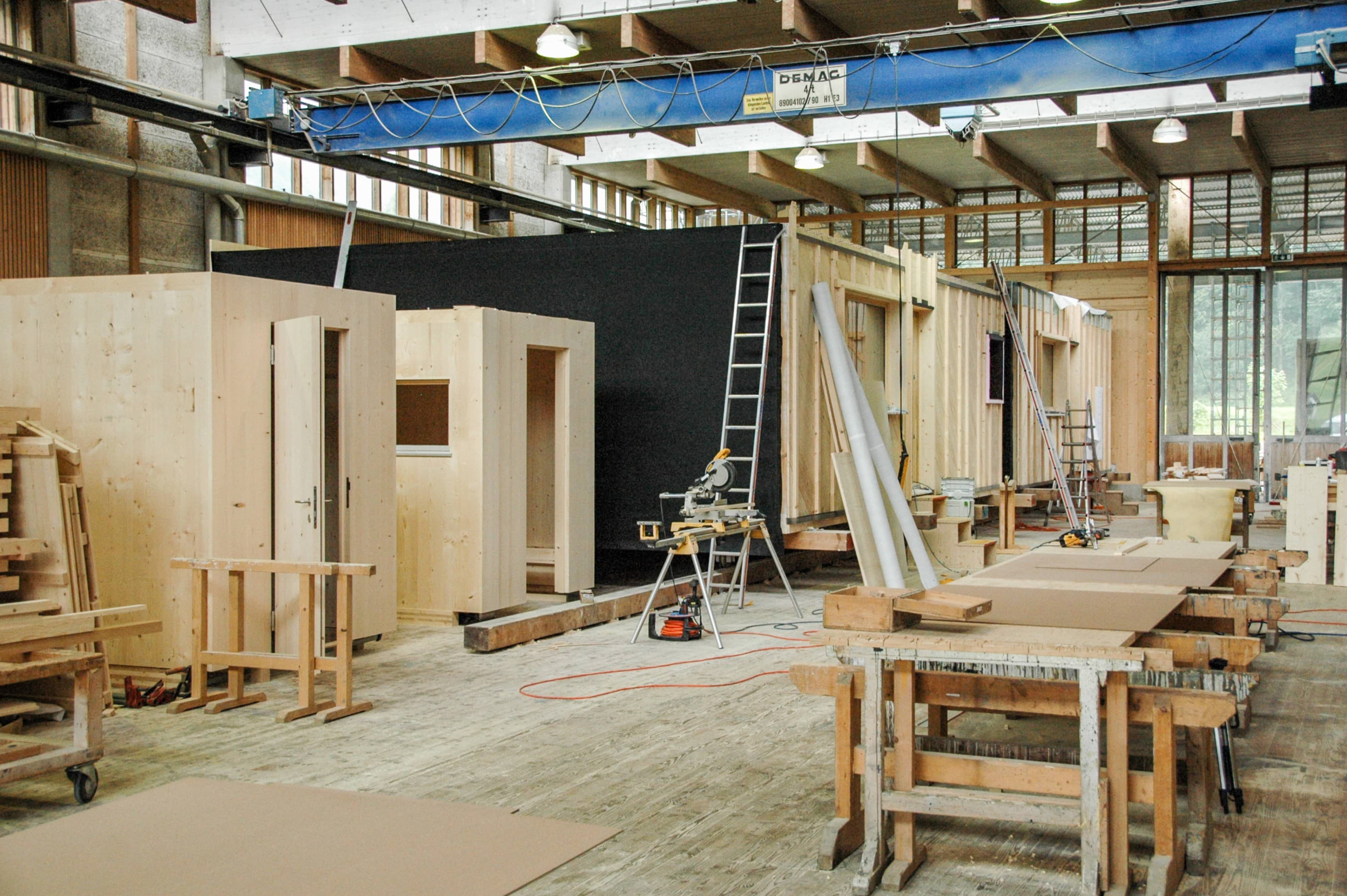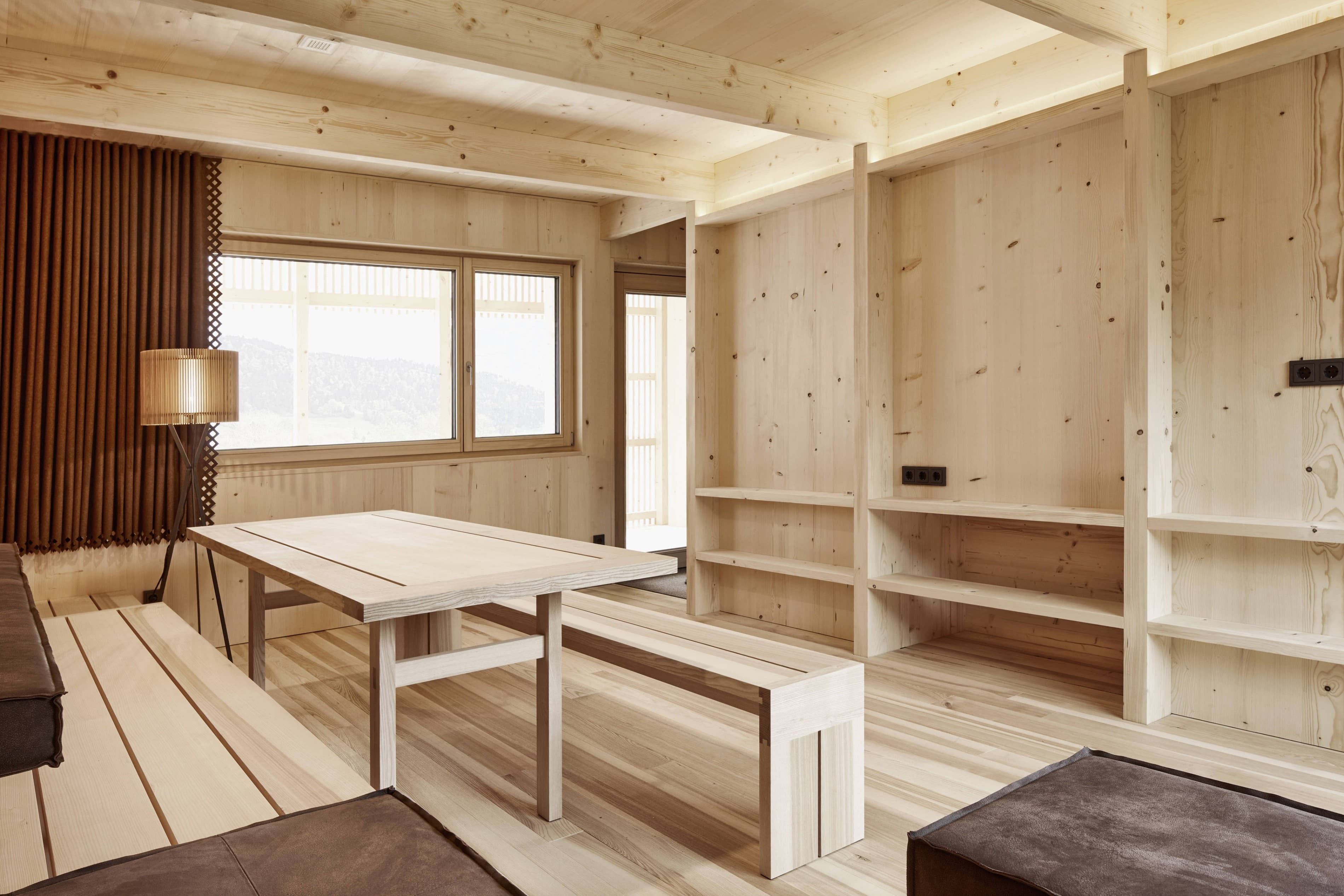 Die gesamten Möbel, von der Einbauküche bis zu den Schränken, dem Tisch, den Bänken und den Betten, werden in der hauseigenen Tischlerei angefertigt. Neben heimischem Fichten- und Eschenholz wird ein neues Material eingesetzt, das aus Reishülsen hergestellt und in Küche und Nasszelle eingesetzt wird.
