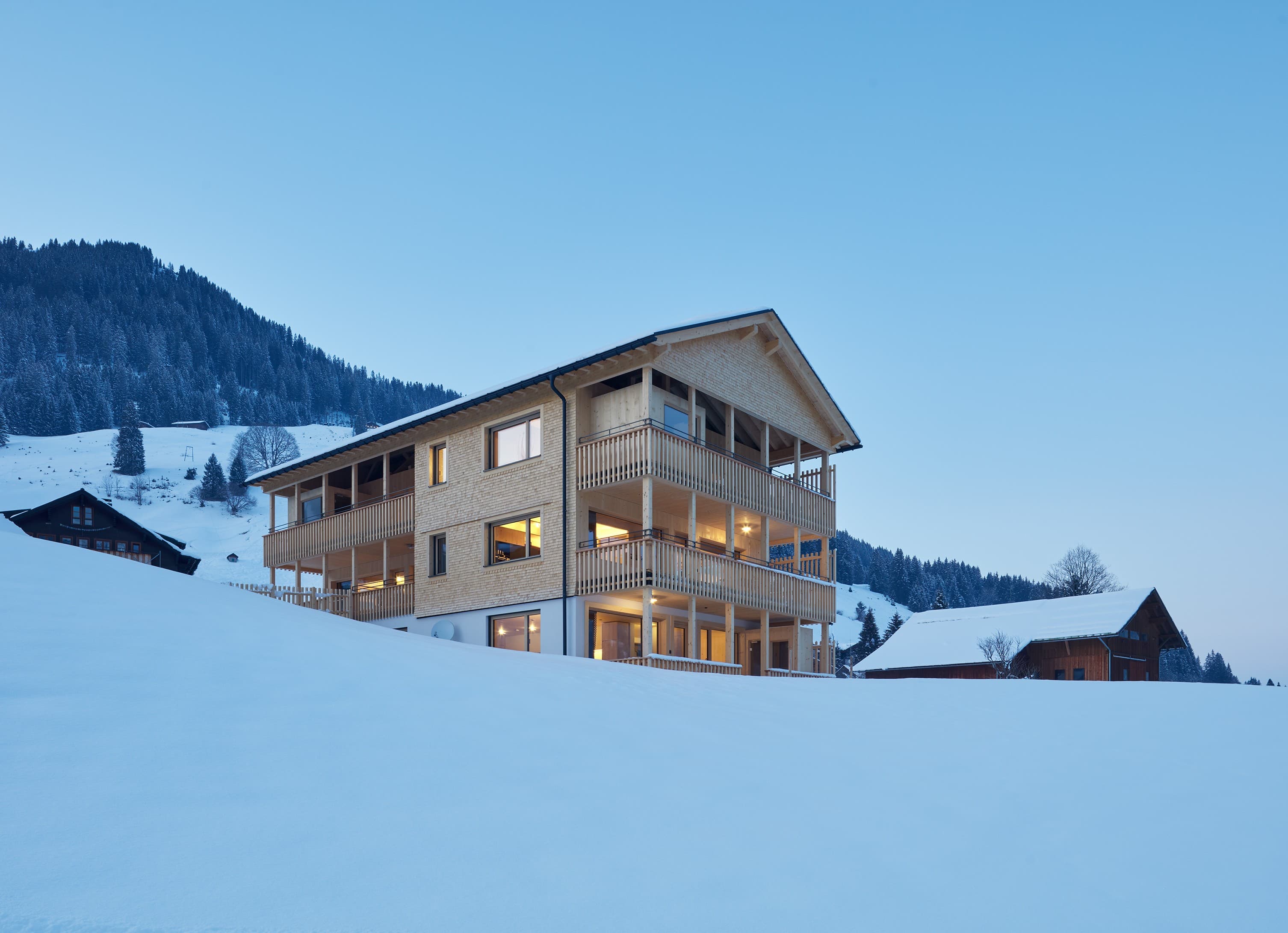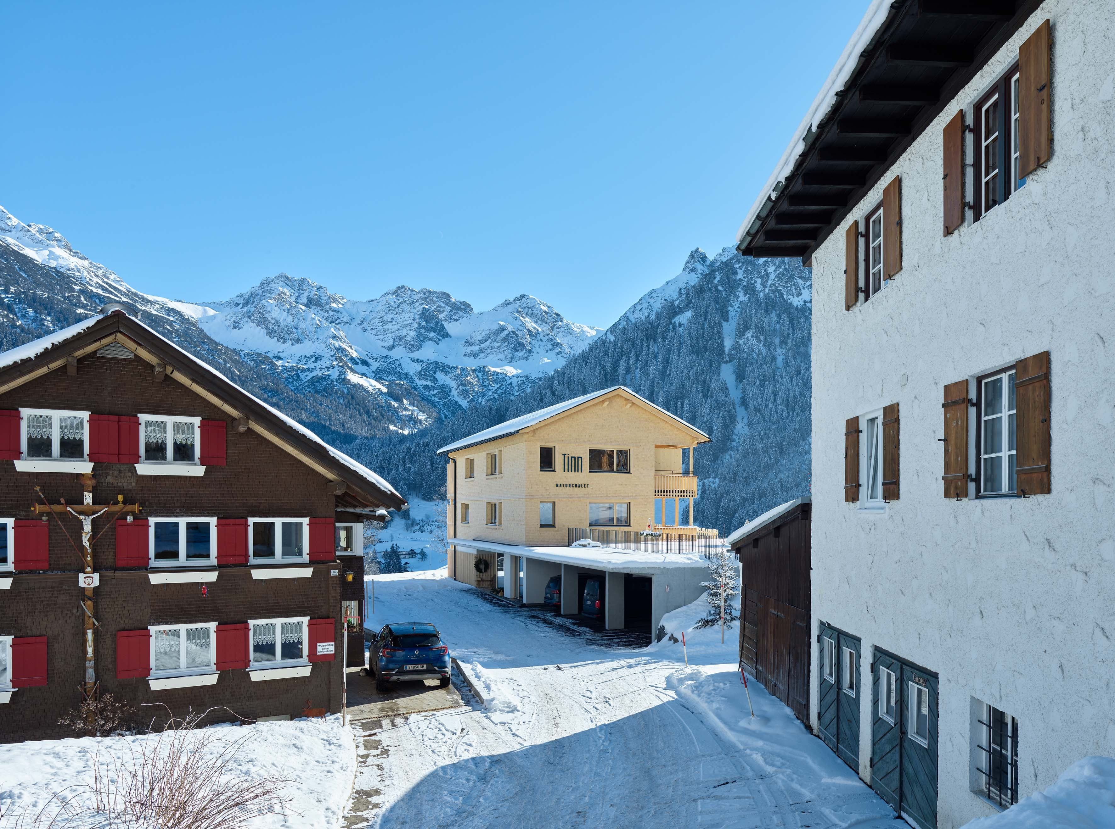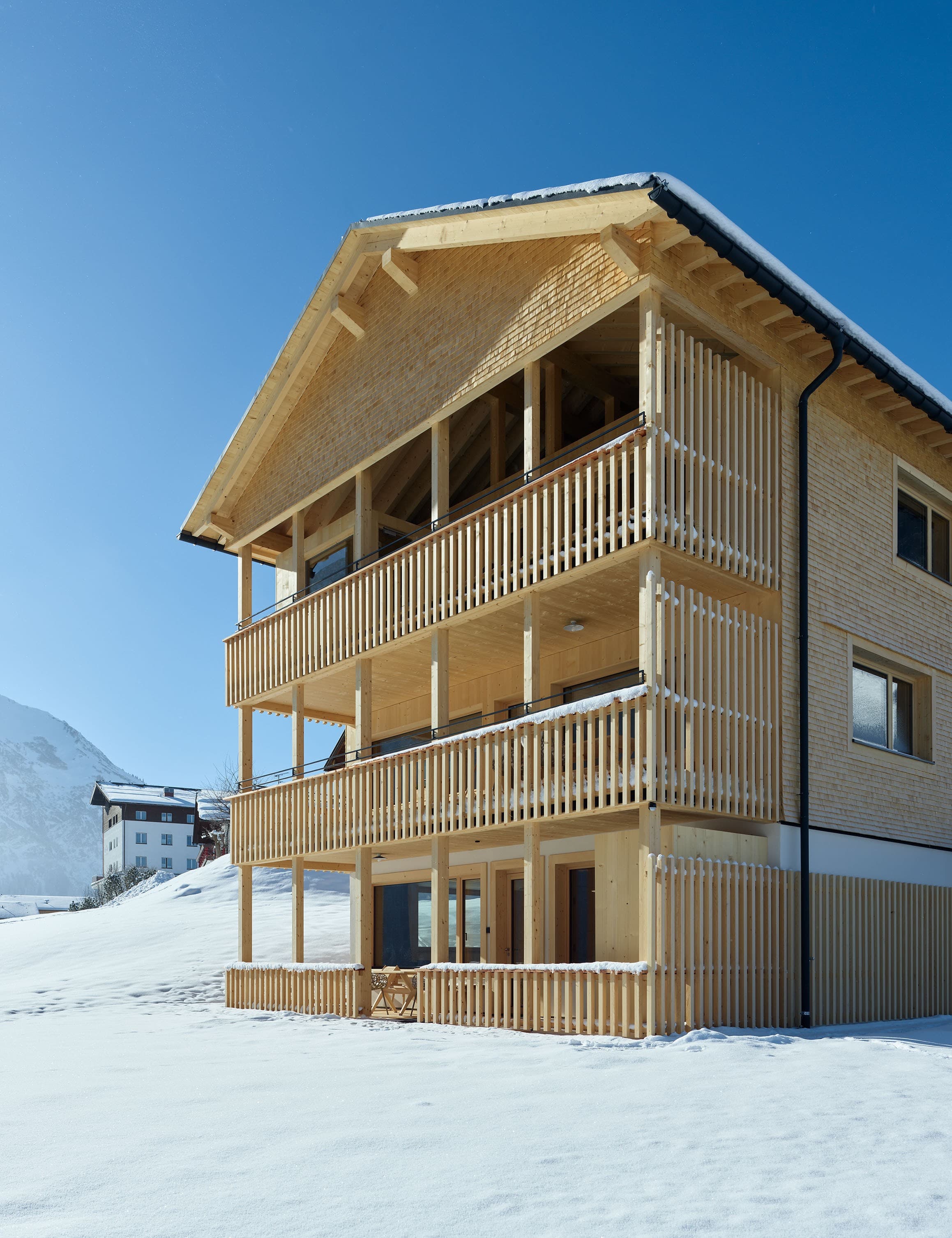 In Mittelberg (Kleinwalsertal) entstand 2022 dieses Wohn- und Apartmenthaus mit 4 Wohneinheiten und einer in das Gelände integrierten Parkgarage. Das Erdgeschoss wurde in Massivbauweise und die restlichen Geschosse (OG 1 und OG 2) in Holzmodulbauweise ausgeführt. Ein klassisches Satteldach schließt das Gebäude nach oben ab. Die Fassade besteht zum Großteil aus einer hinterlüfteten Holzverschindelung und im Bereich der Balkone aus vertikalen Holzleisten. Besonderer Wert wurde auf den Einsatz von nicht industriell hergestellten Produkten gelegt. So sind alle konstruktiven und verkleidenden Holzbauteile als Vollholz in Fichte oder Weißtanne ausgeführt, welche für Behaglichkeit und ein angenehmes Raumklima sorgen.